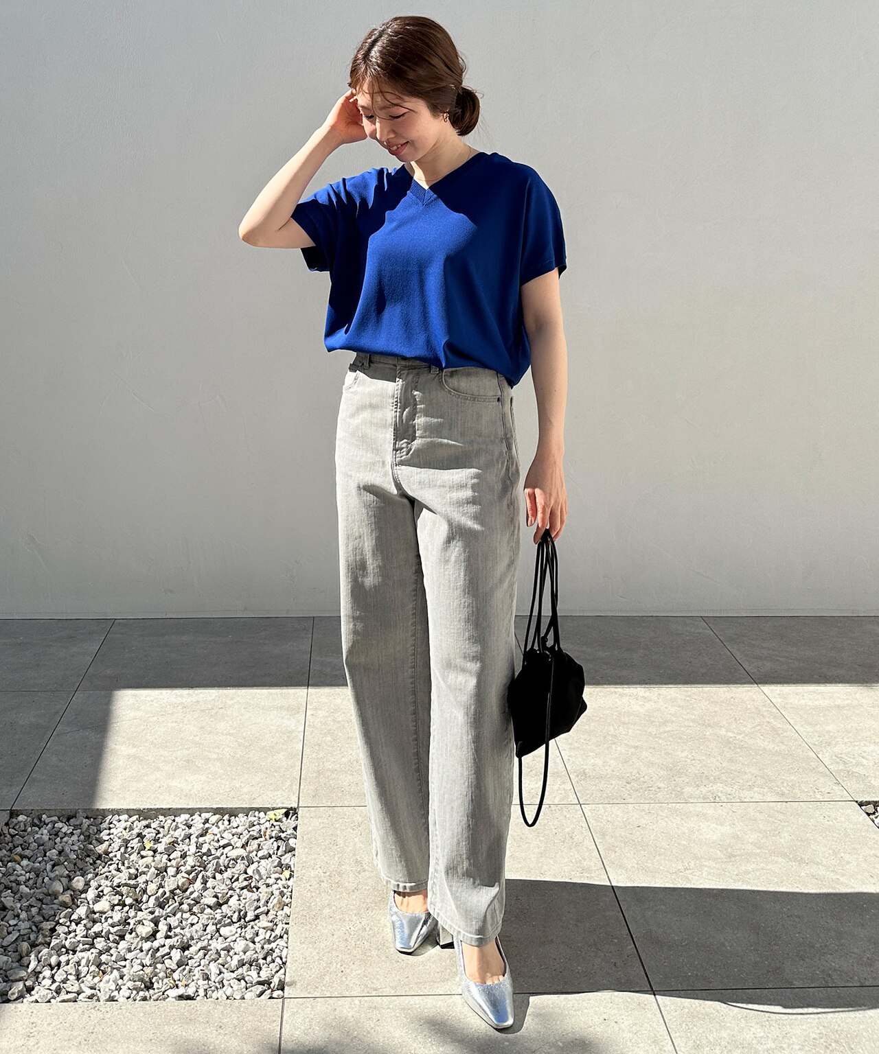 キレイめトップスをデニムに合わせて、カジュアルダウンさせれば、夏のデイリーコーデの完成!鮮やかな青が夏らしさを演出。