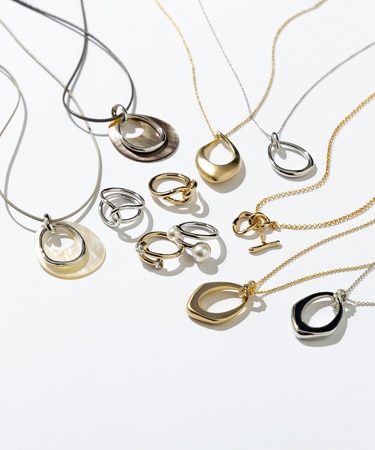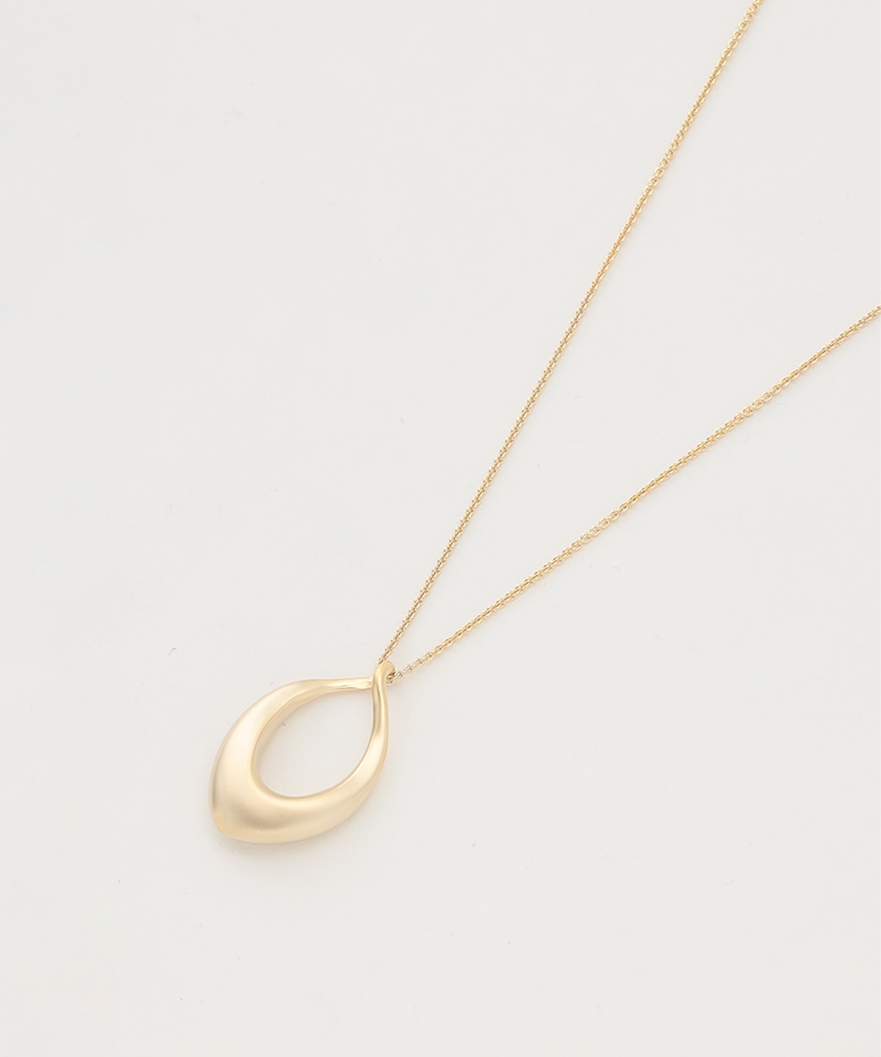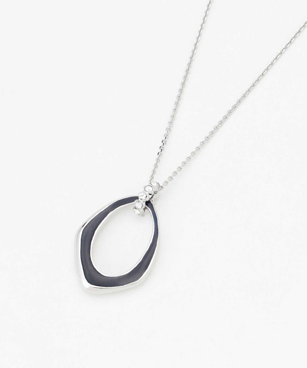 ドロップ型のメタルにエポをあしらったリバーシブルネックレス。表面はエポがさりげないアクセントになり、裏面はシンプルなメタルデザインで気分やスタイルに合わせて使い分けが可能。夏の装いがシンプルになりがちな季節にも、程よい存在感をプラスしてくれるのが魅力。
