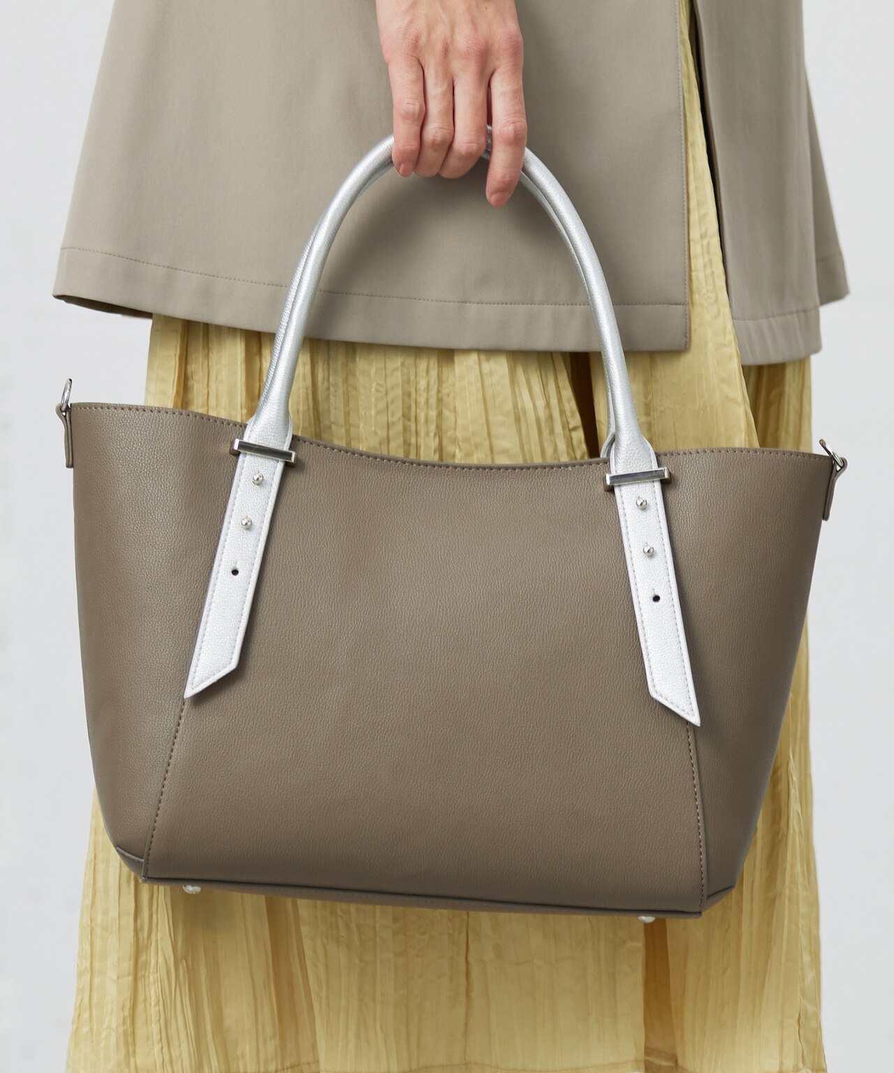 シーンを問わない洗練された雰囲気のバイカラーのトートバッグ。ハンドルの長さ調節もでき、機能性もデザインも兼ね備えたバッグです。A4サイズが入り、長財布・折りたたみ傘・ペットボトルも収納して頂けます。内側のストラップを留めればシルエットの変化を楽しめ、シーンに合わせてアレンジして頂けます。ロングショルダー付きで、トートバッグ本体にも付属のポーチにも取り付けられて、ポシェットとしてもご使用頂けます。トートバッグの内側にはスマートフォンや小物が収納できるオープンポケットが1つついています。デイリーからオンタイムまで愛用頂けるマルチwayのバッグです。