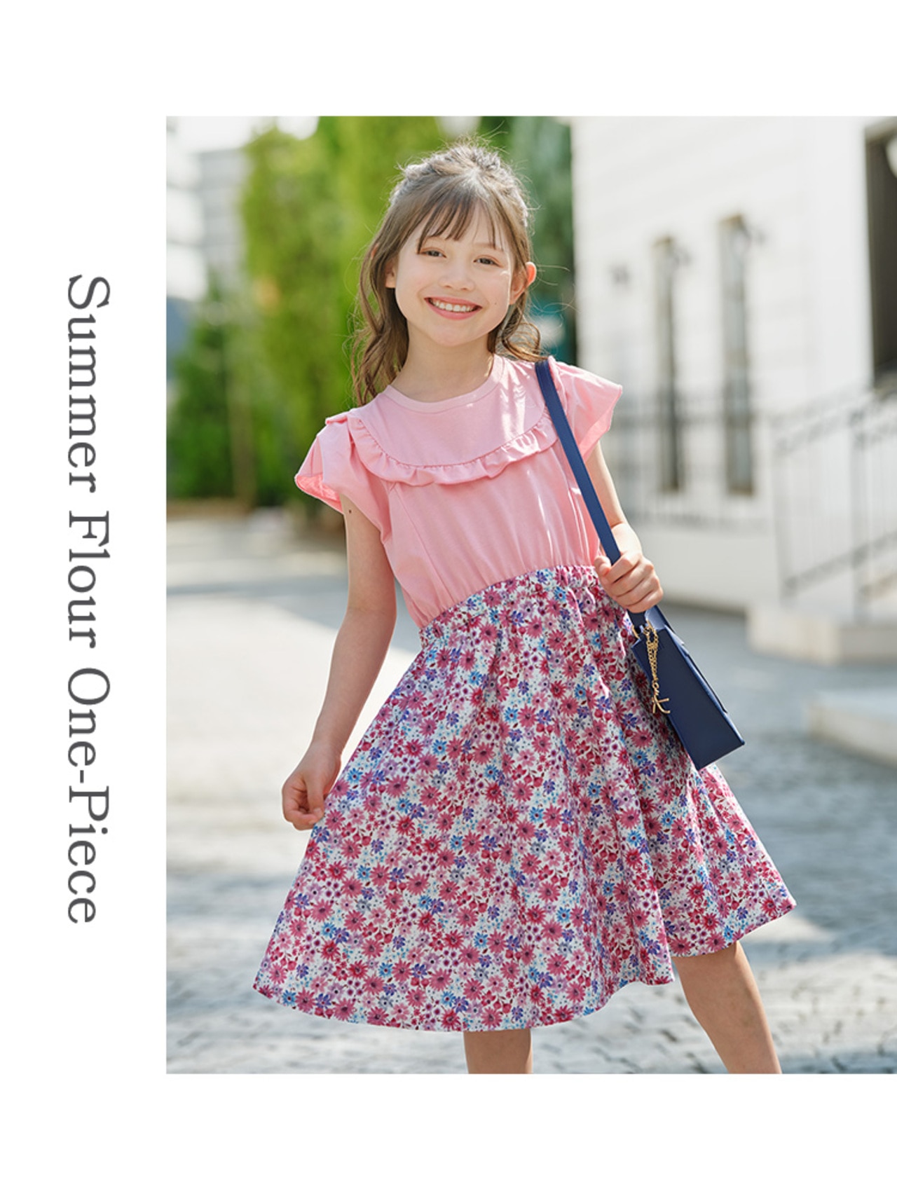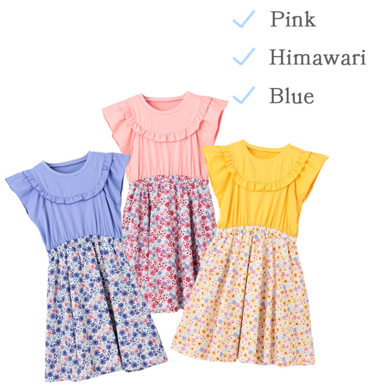 ヨーク切り替えのフリルをあしらったブラウスと、花柄のスカートを合わせたようなドッキングワンピースです。伸縮性があってそのままかぶりで着脱できます。
