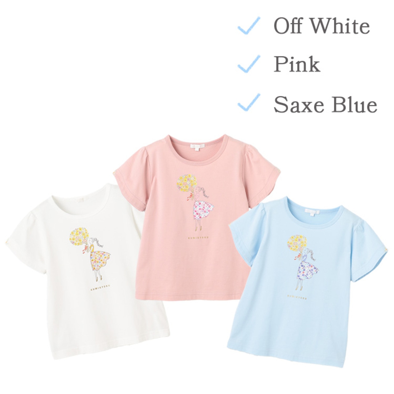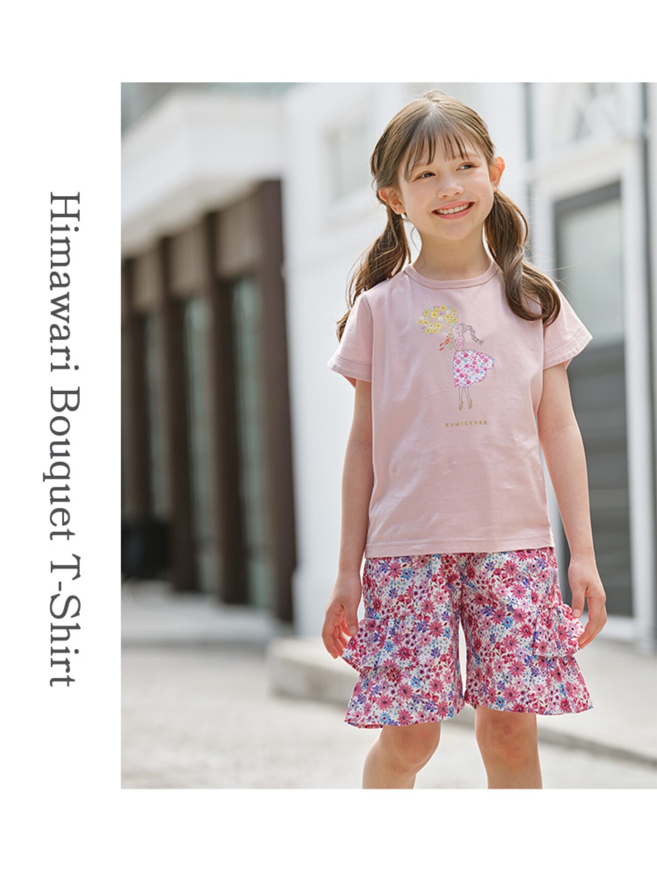 今期のワンピースを着ているマーガレットちゃんが、たくさんのひまわりをブーケにして持っているアートのTシャツです。