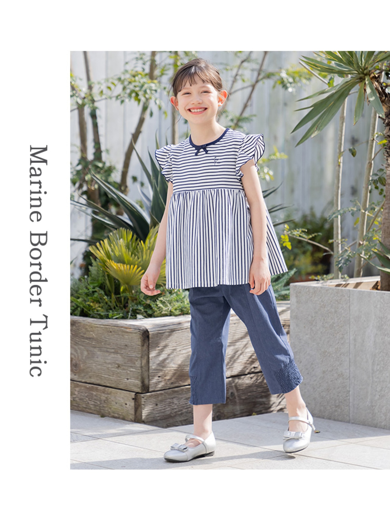 上身頃はボーダー、スカート部分はストライプ使いになっており、デザイン性のあるチュニック。UVケアの素材を使用しており、日差しの強い日も安心です。