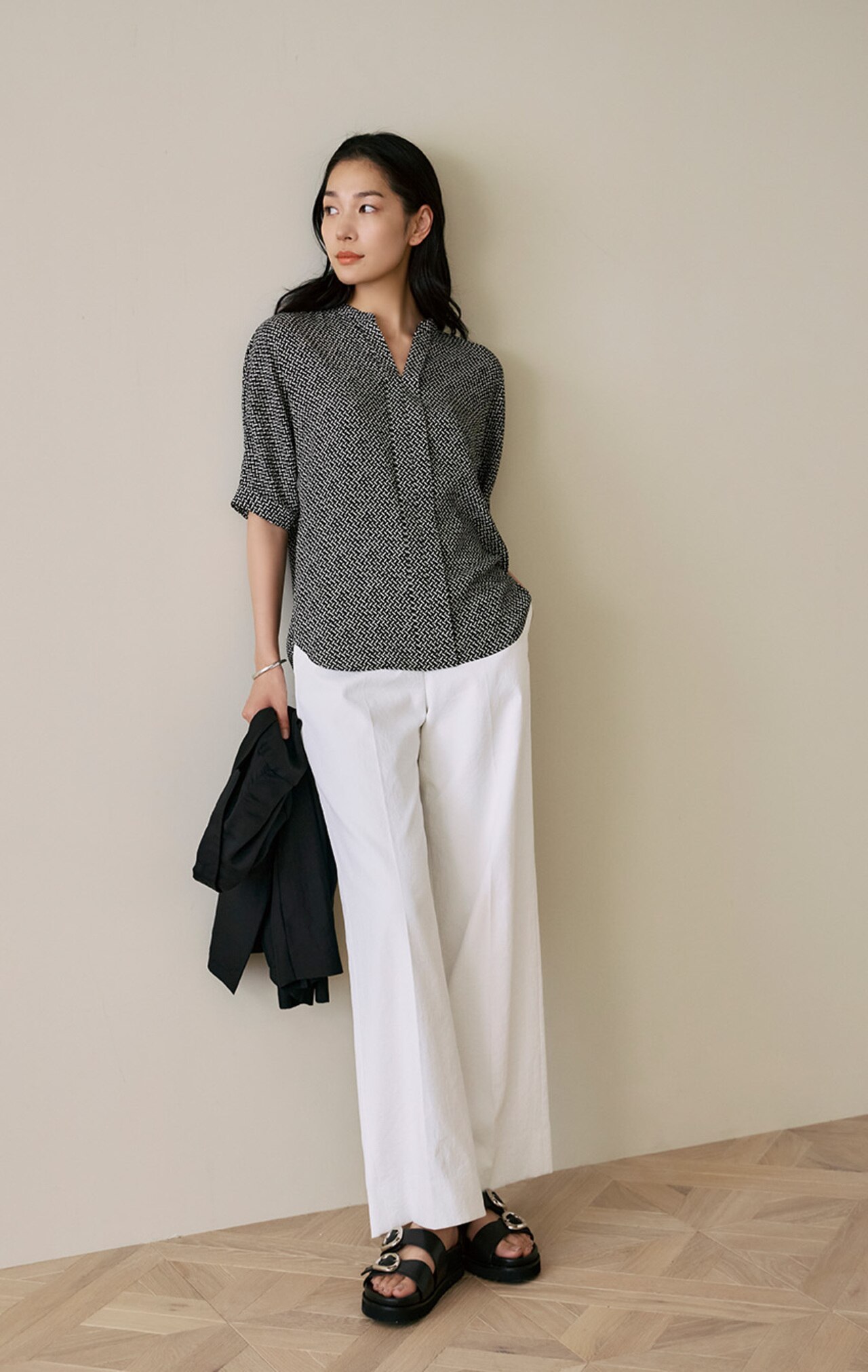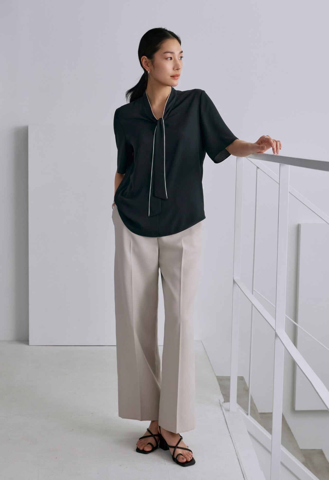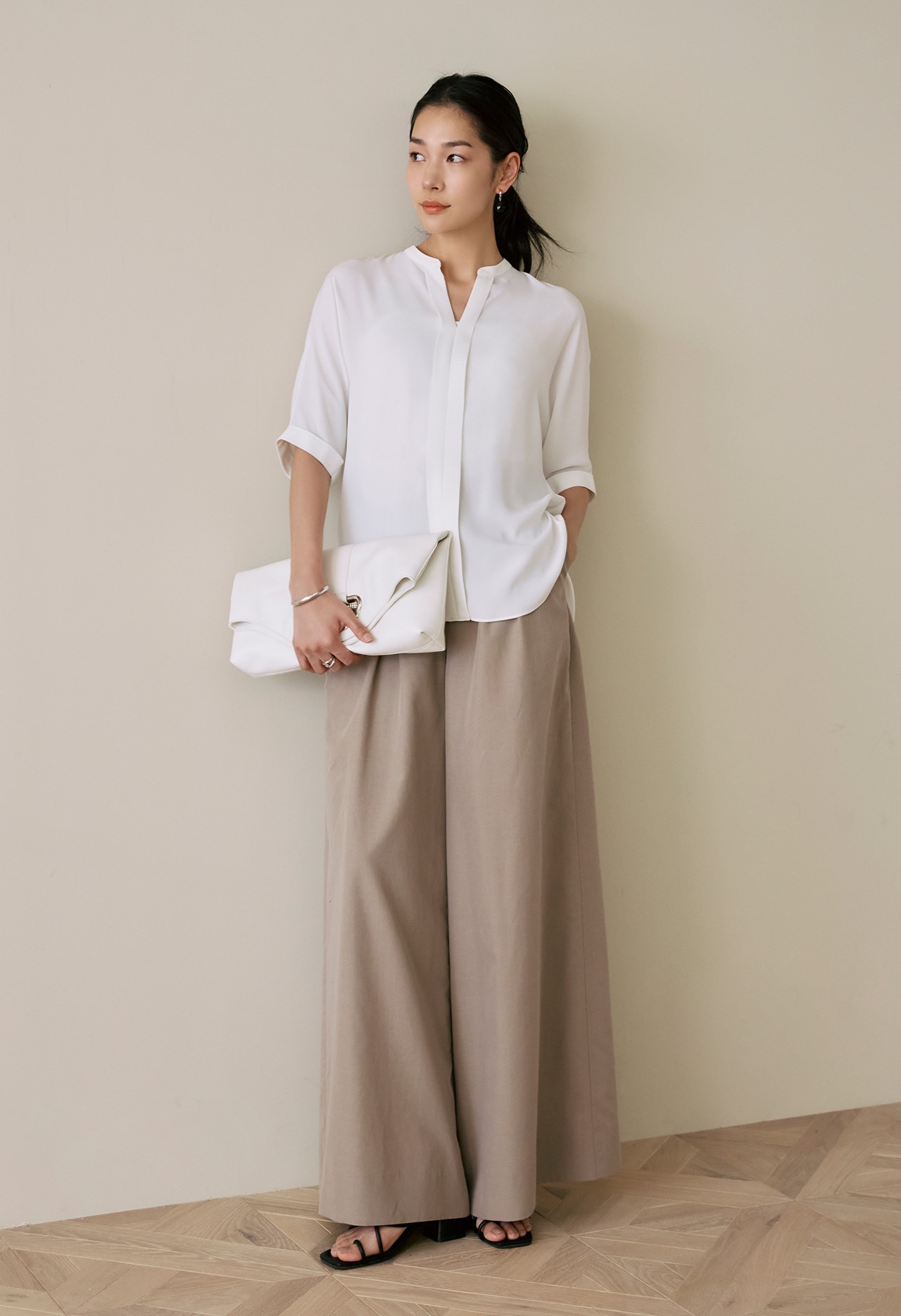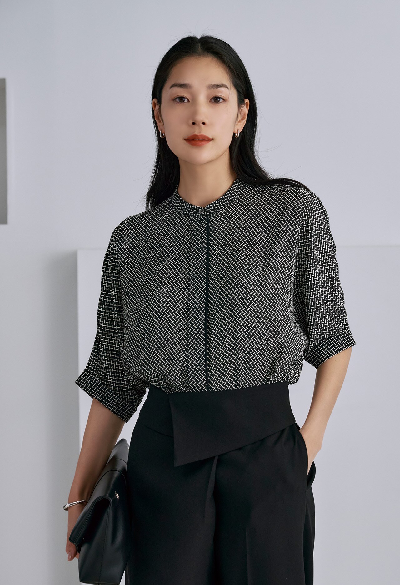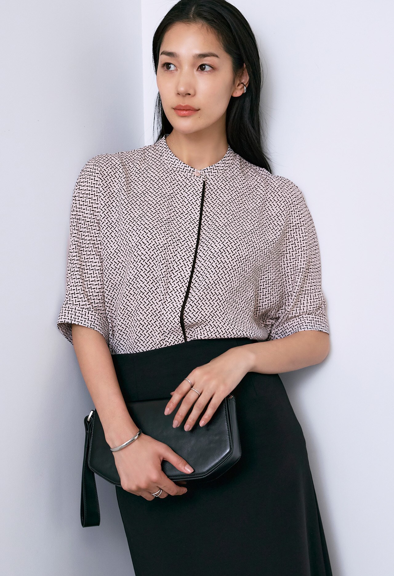今シーズンはバンドカラーブラウス、キーネックブラウス、