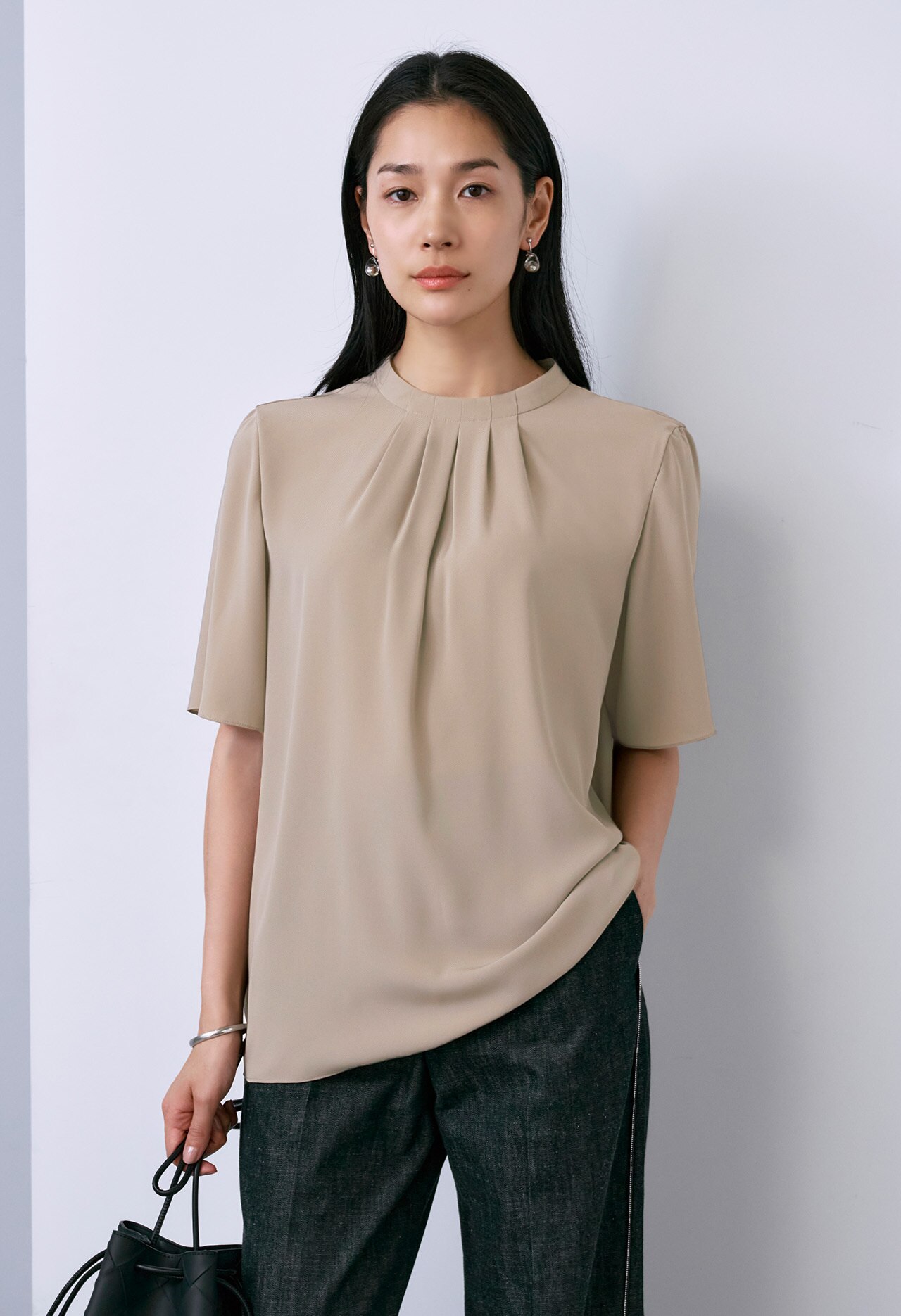 タックデザインがポイントのハイネックブラウス。