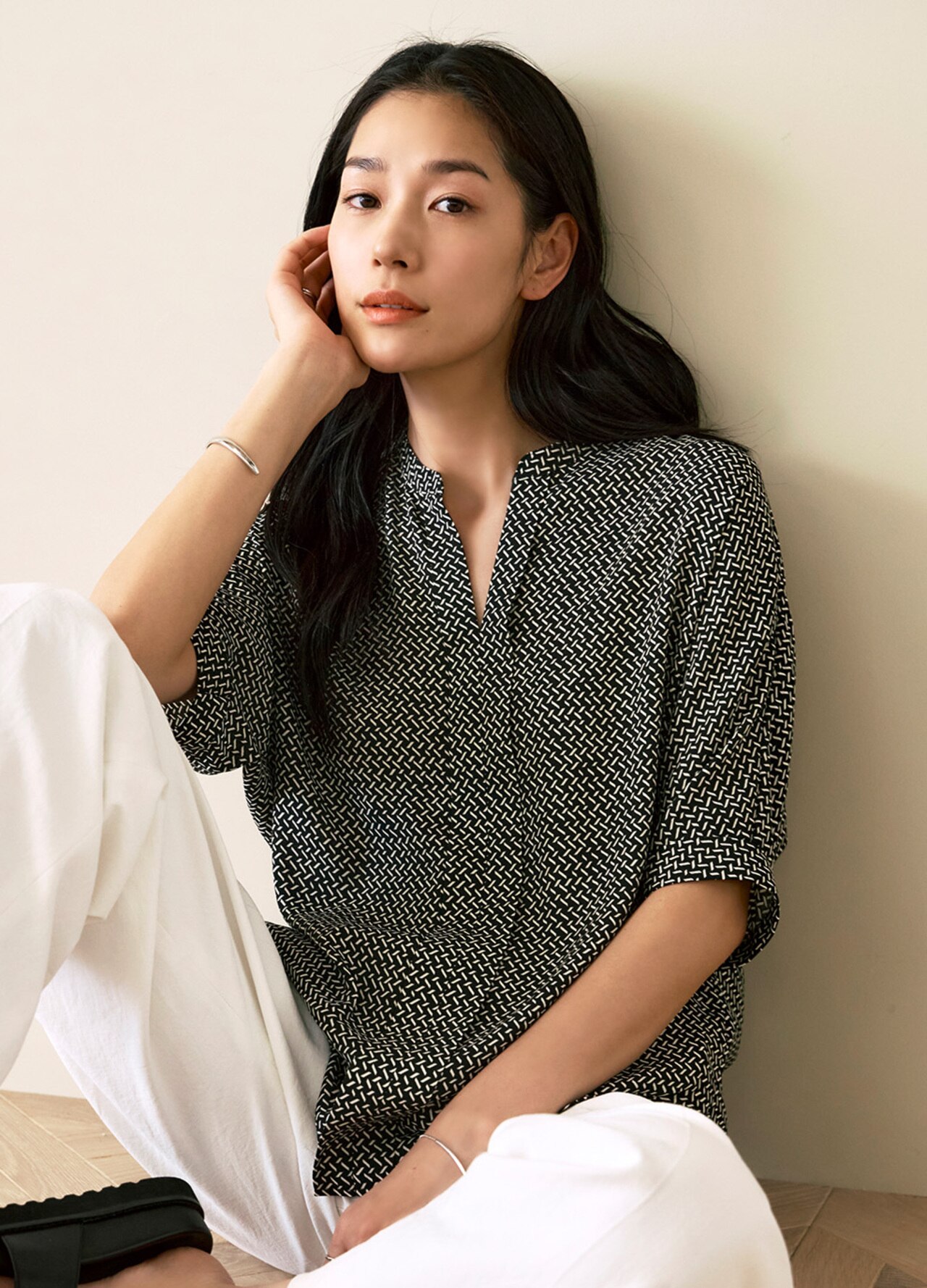 ジャケットやカーディガンのINにはもちろん、一枚でも決まる洒落見えブラウスです。
