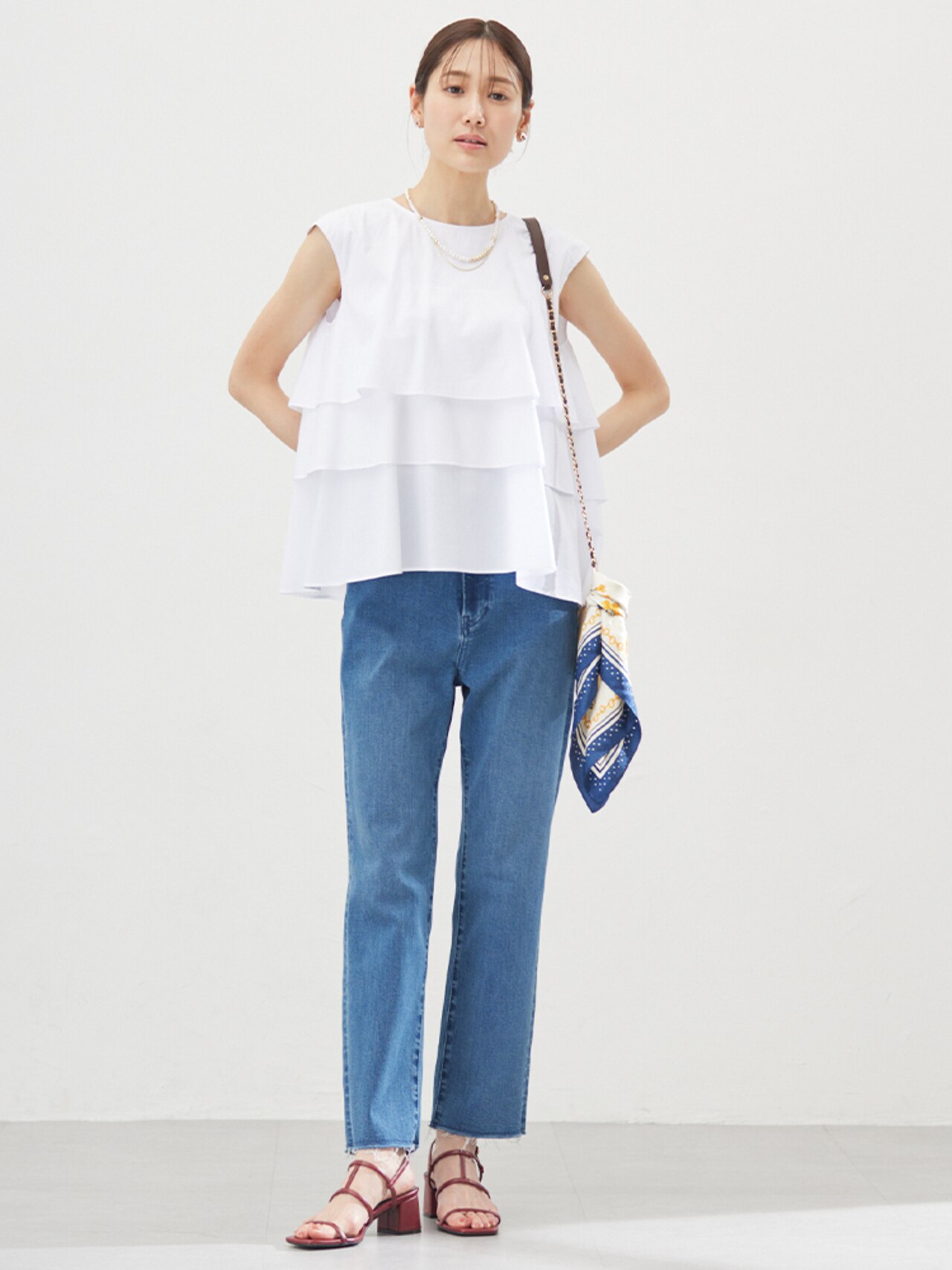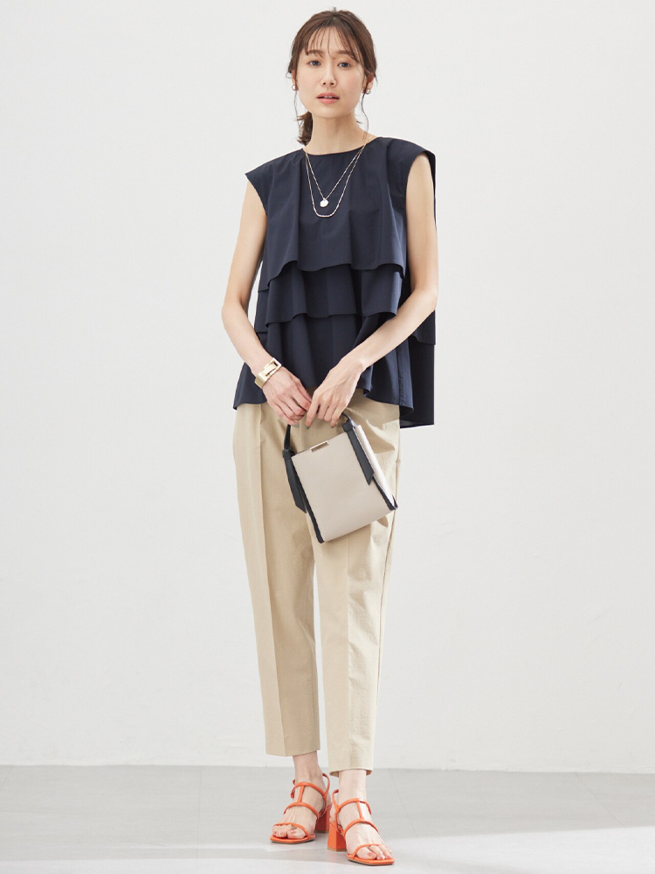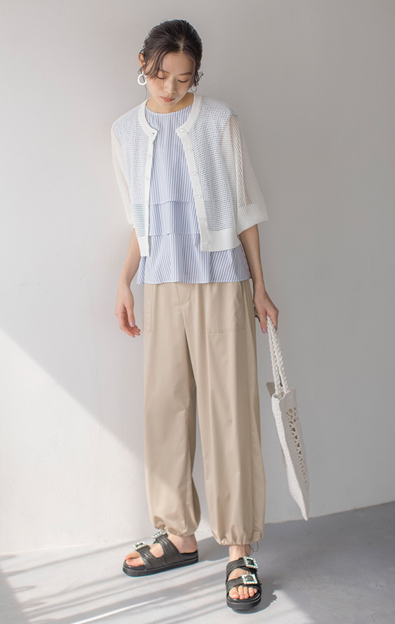 フロントのフリルがエレガントなブラウスはドロストパンツでカジュアルダウン。なめらかで程よい光沢があるので、上品にきまります。二の腕が気になる方はメッシュカーデを羽織るのがおすすめです!