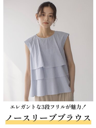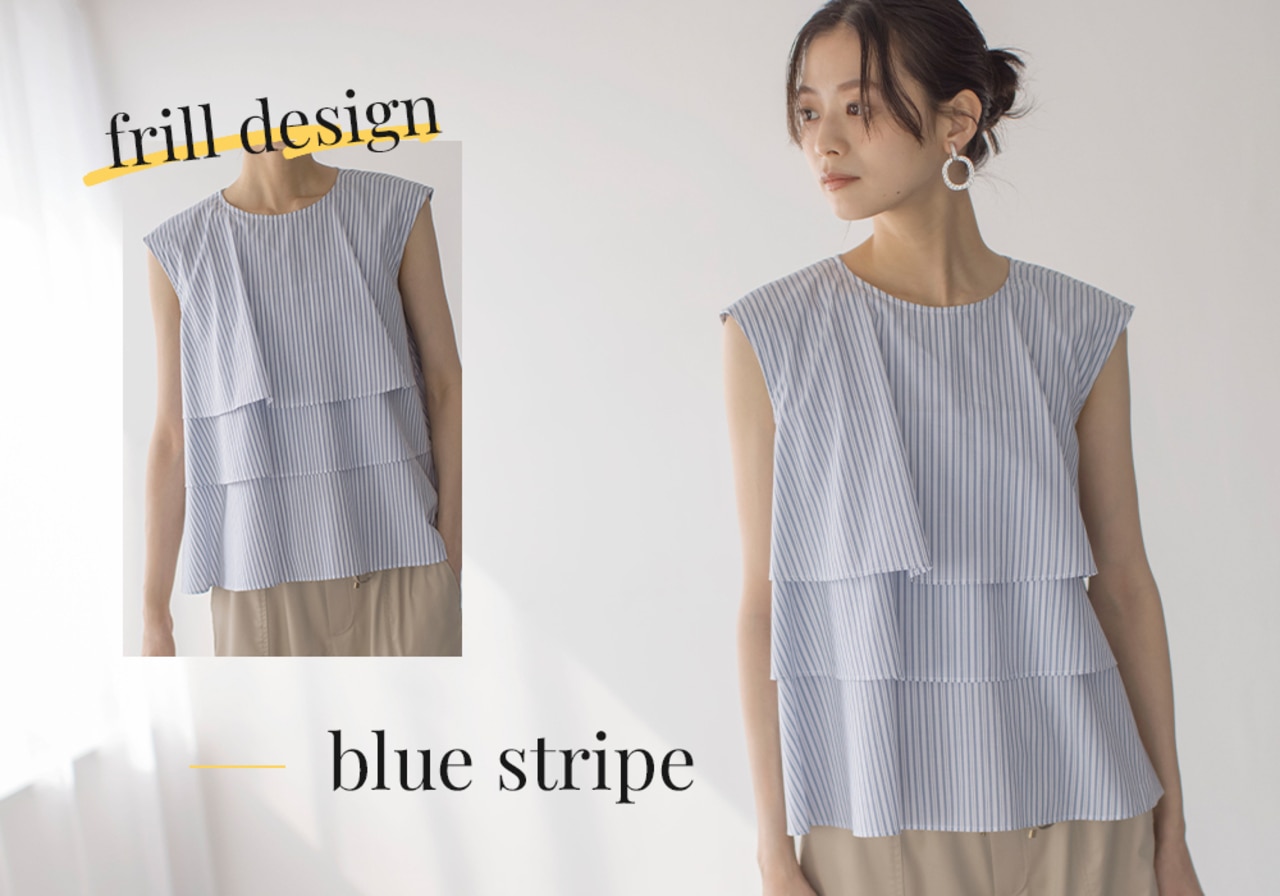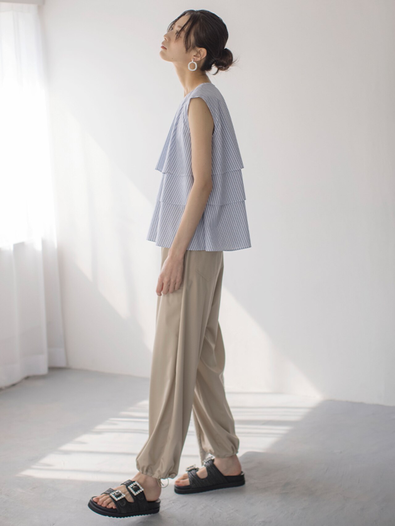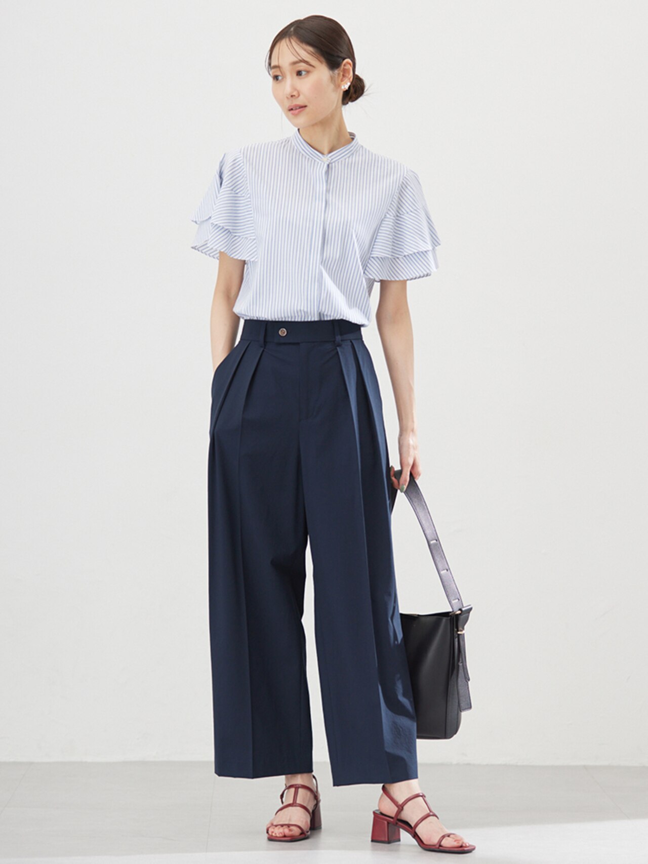 フロントのフリルがエレガントなブラウスはドロストパンツでカジュアルダウン。なめらかで程よい光沢があるので、上品にきまります。二の腕が気になる方はメッシュカーデを羽織るのがおすすめです!
