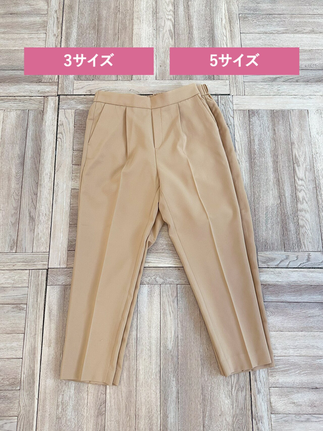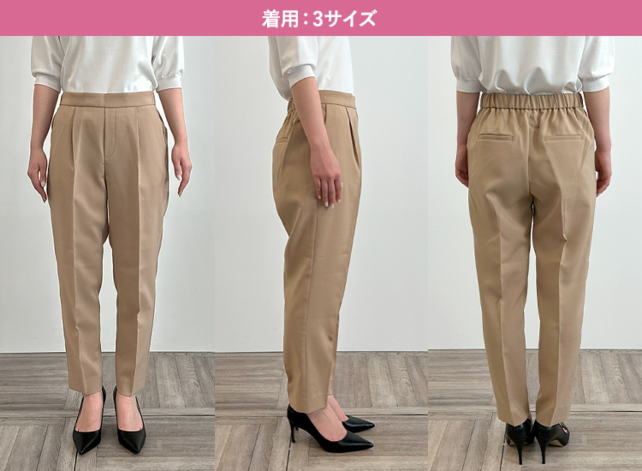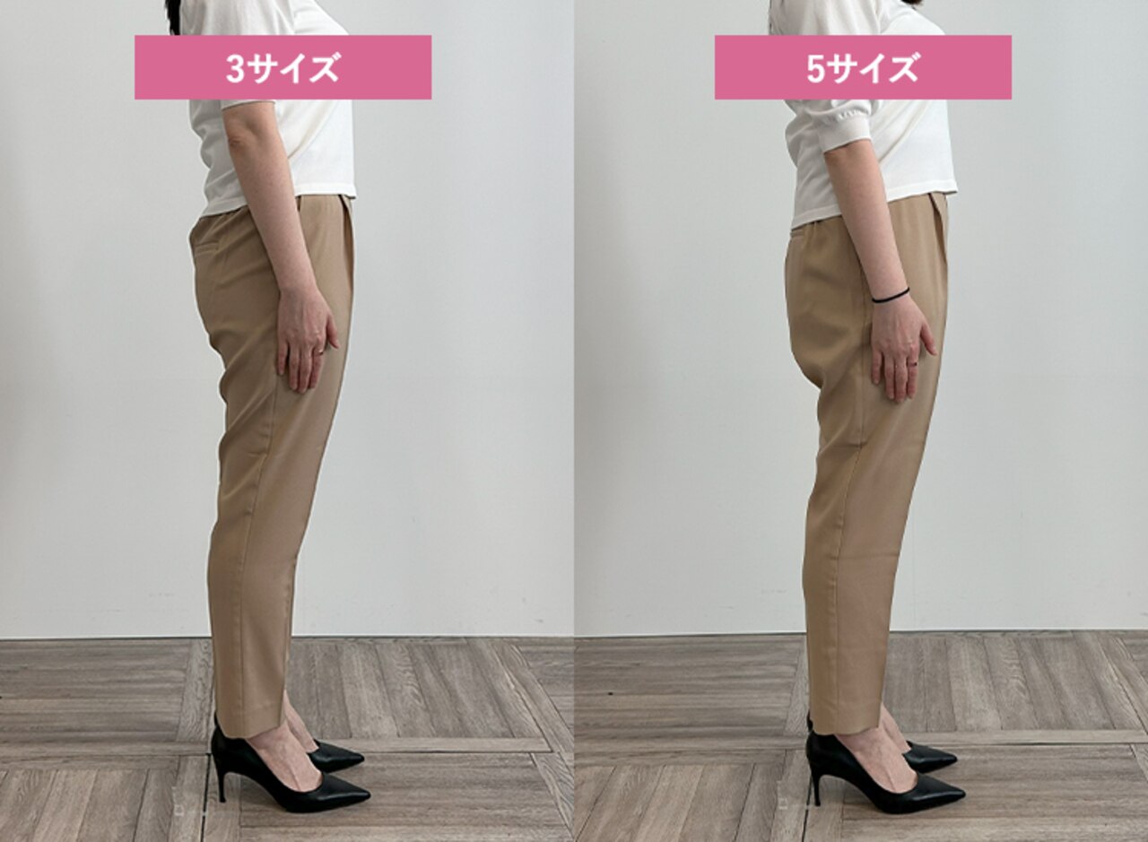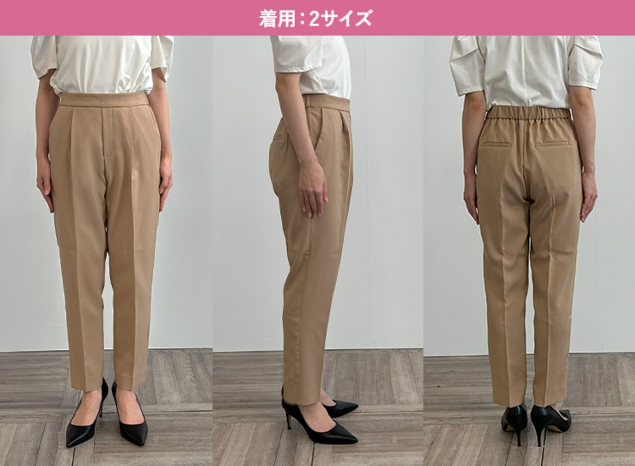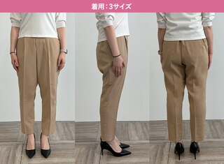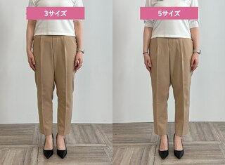 ウエスト、ヒップなど全体的にテーパードよりゆとりを感じるデザインのため、下半身が華奢な方はいつもより1サイズ下げることをおすすめします。サイズ5はテーパードより更にウエストが大きいため腰まで落ちてしまいました。