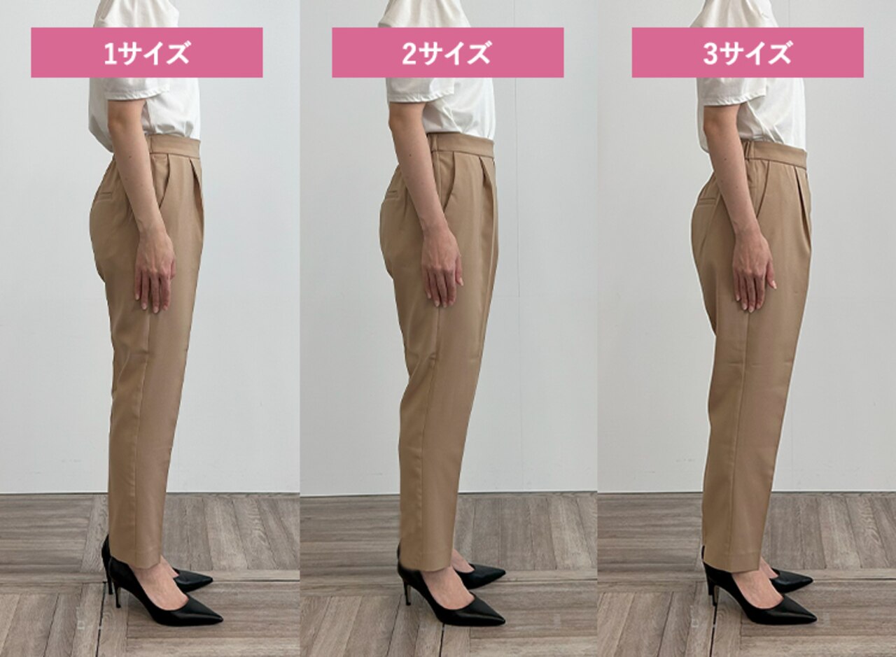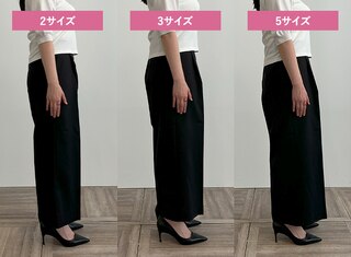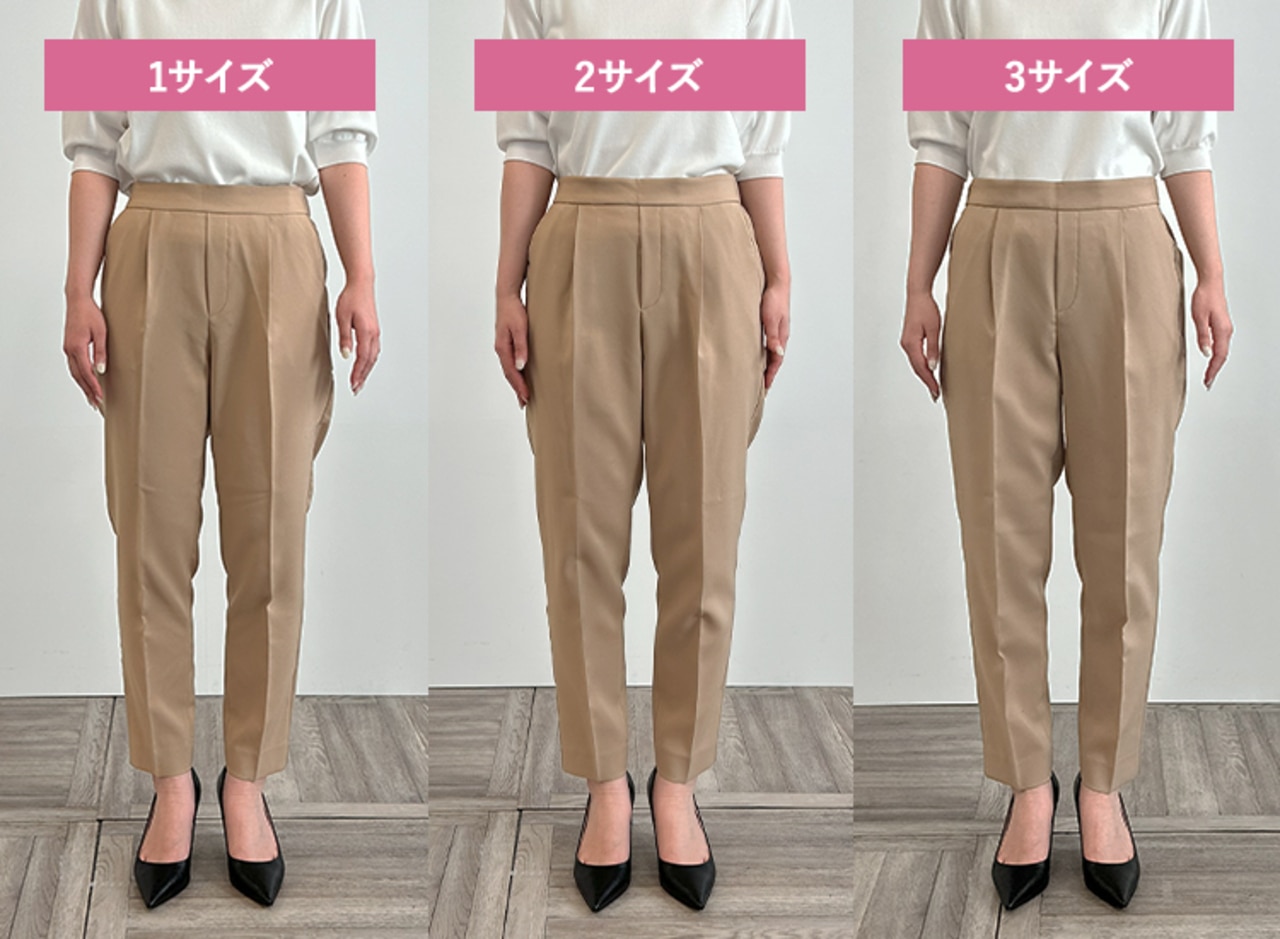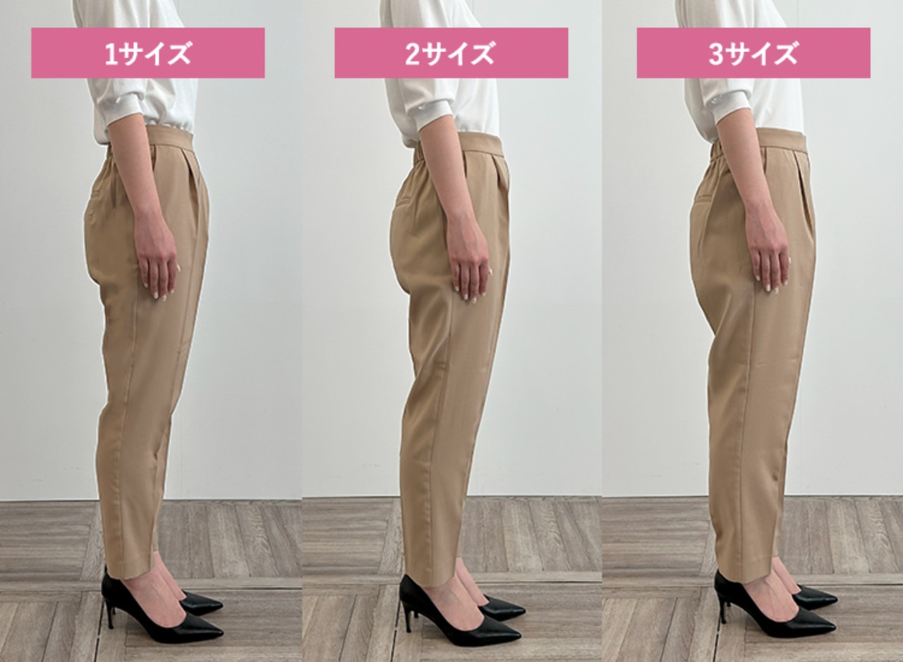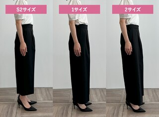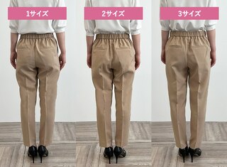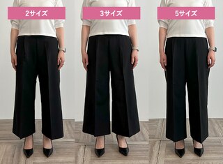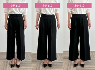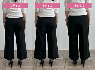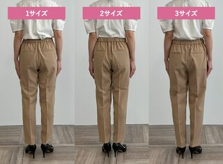 サイズ1はタイトできれいめな印象に、サイズ3は少しゆとりが出たのでシルエットを崩さずはくことができました。ウエストに程よいゆとりがありトップスをインしたスタイリングも可能だったこと、着心地の良さから私には2がベストサイズでした。