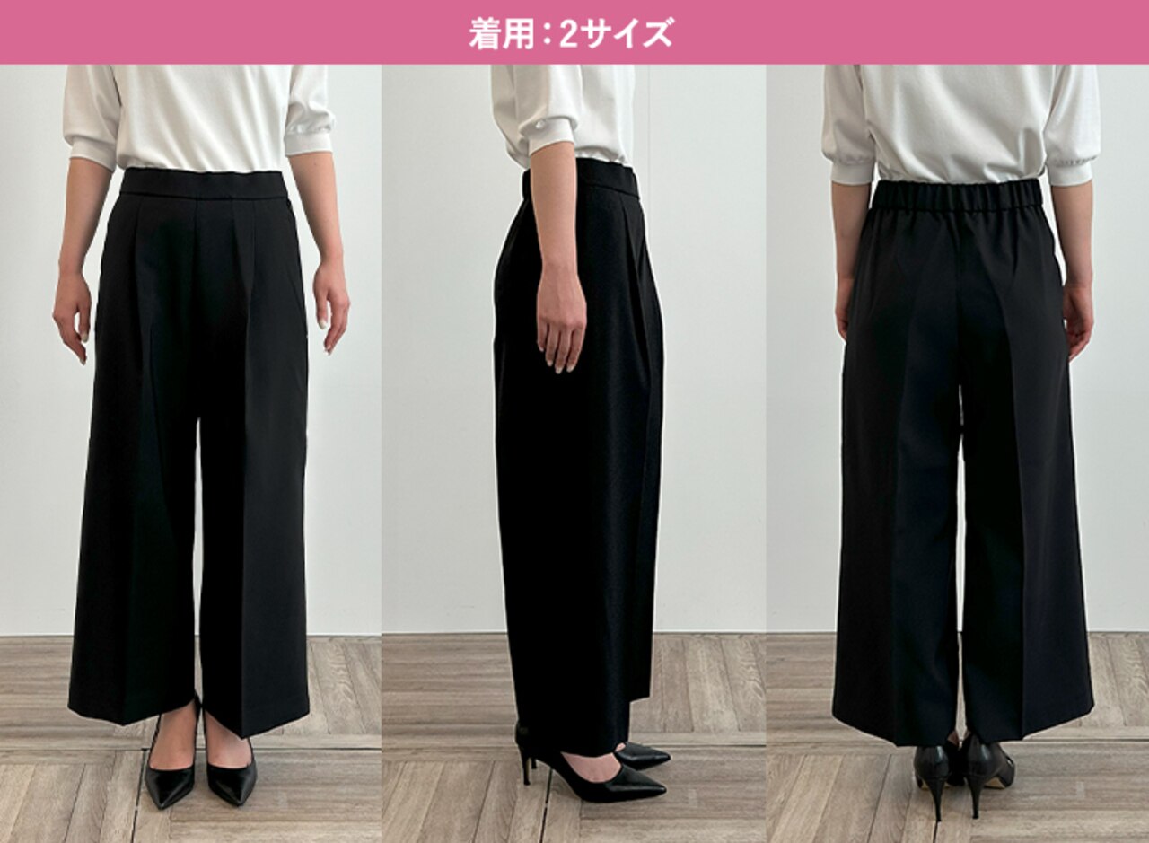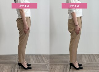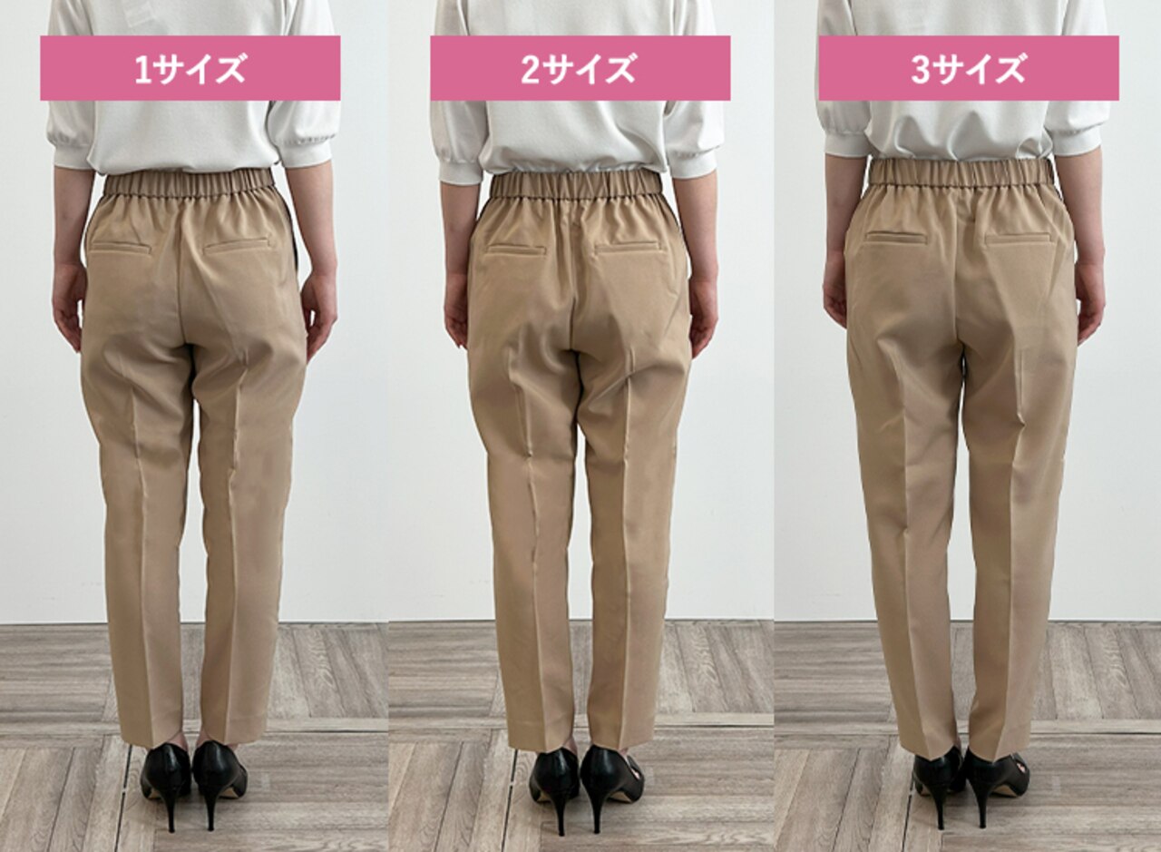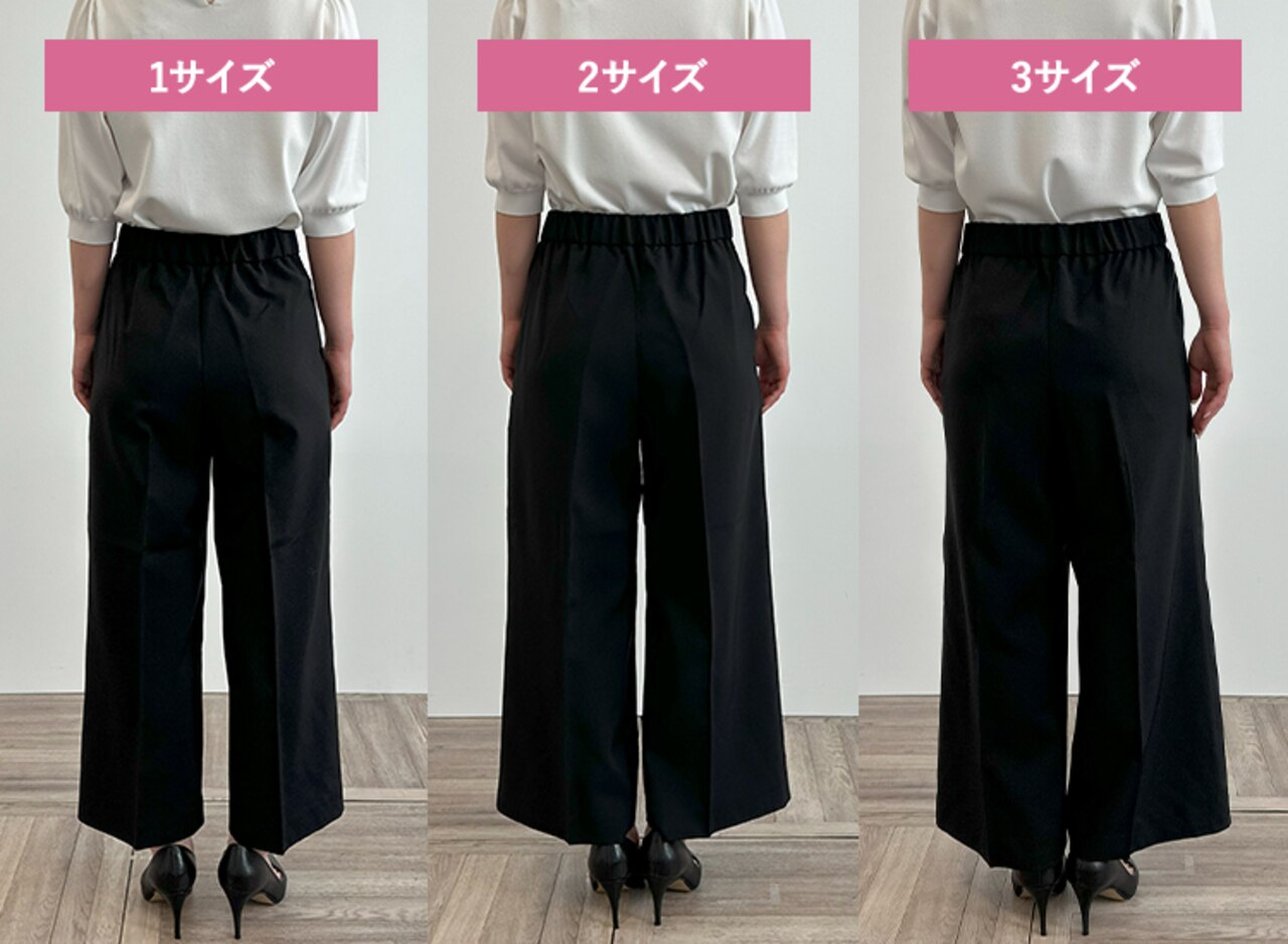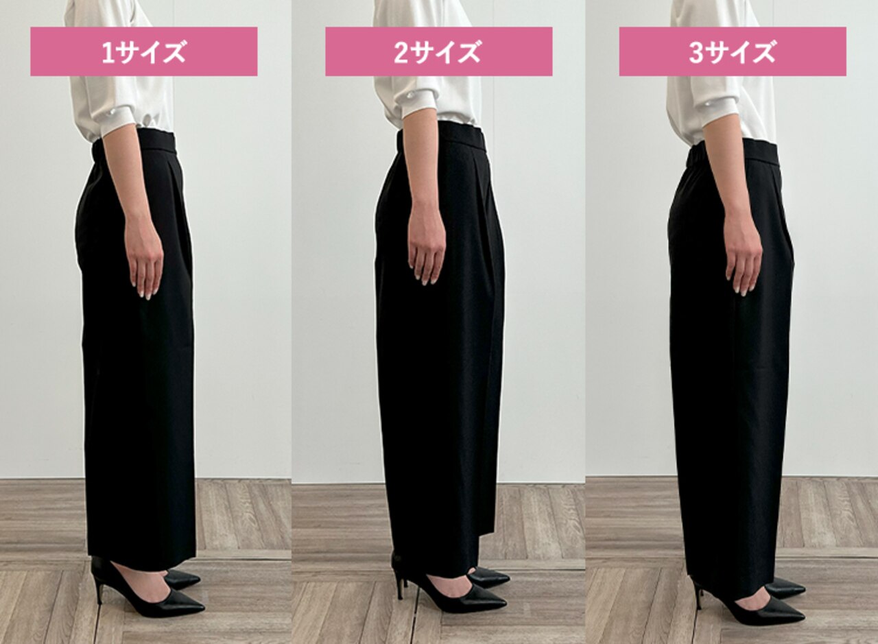 サイズ1はタイトできれいめな印象に、サイズ3は少しゆとりが出たのでシルエットを崩さずはくことができました。ウエストに程よいゆとりがありトップスをインしたスタイリングも可能だったこと、着心地の良さから私には2がベストサイズでした。