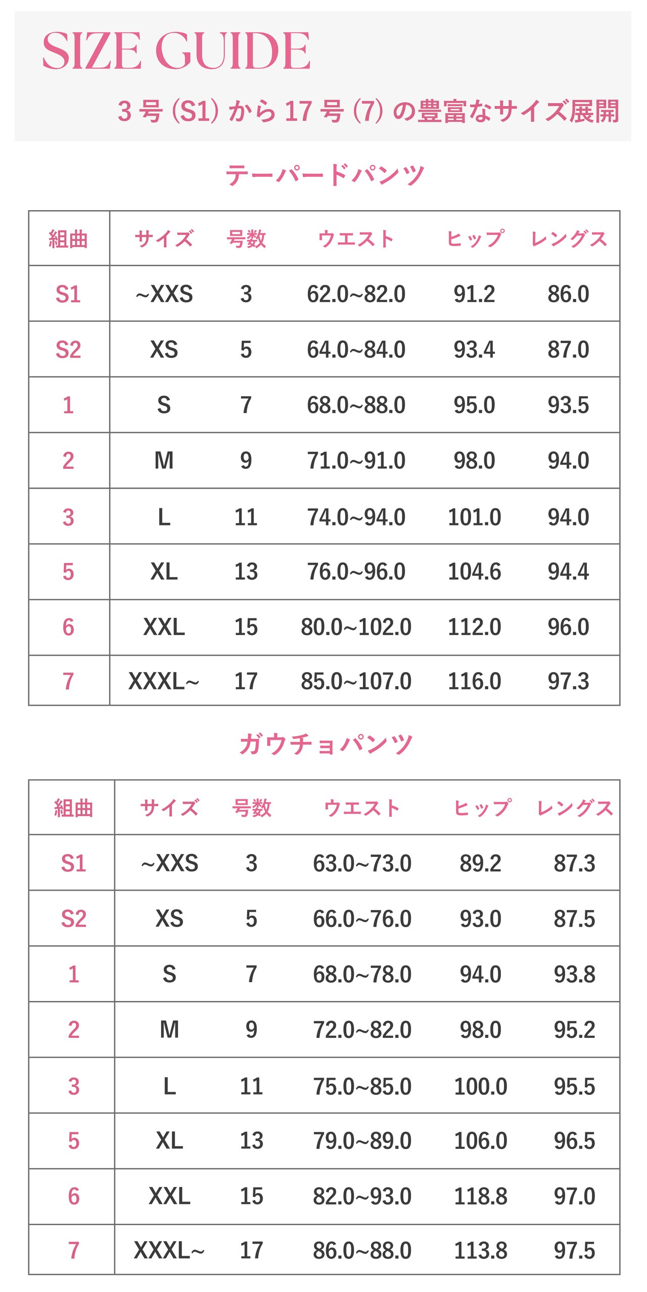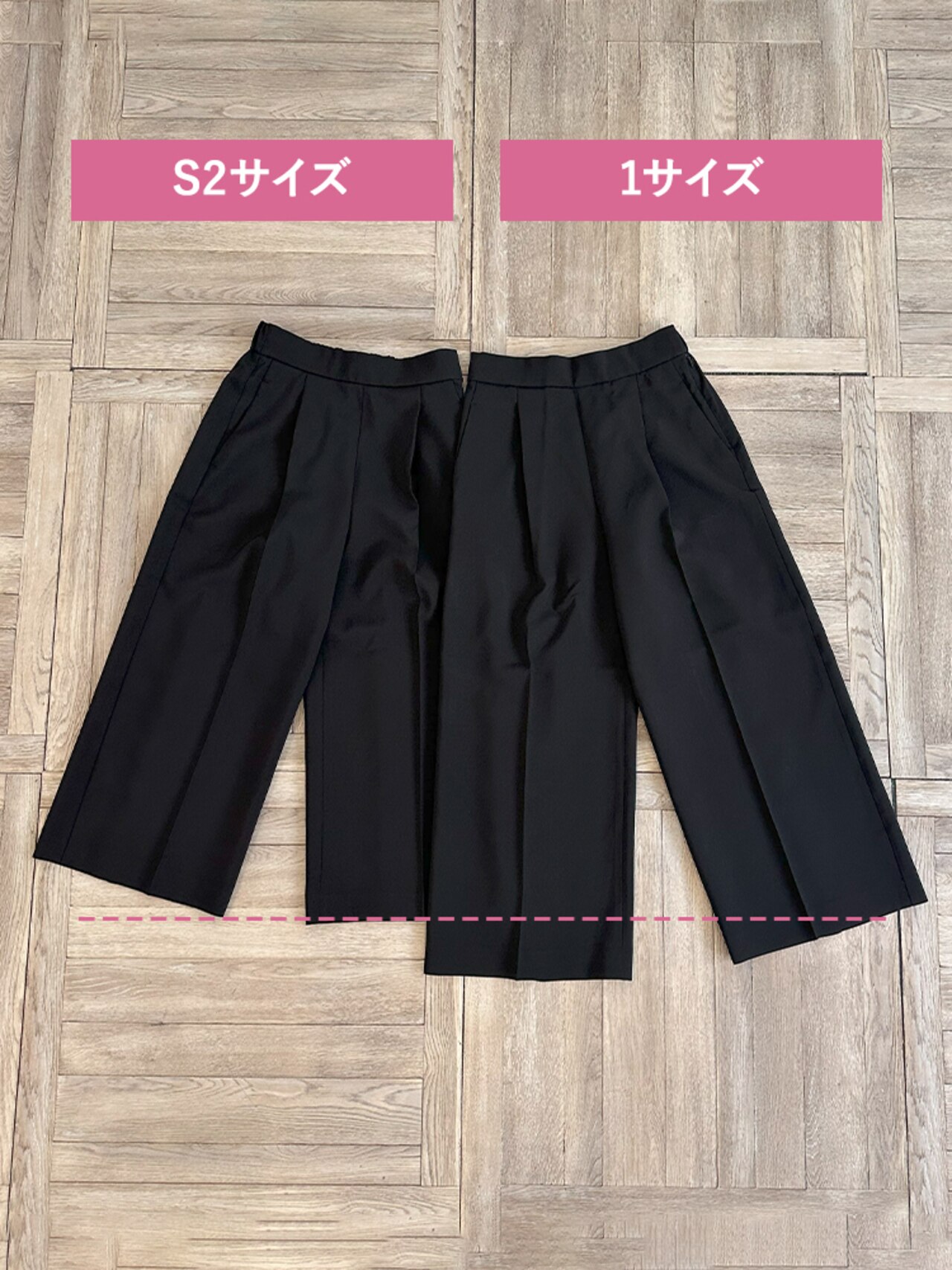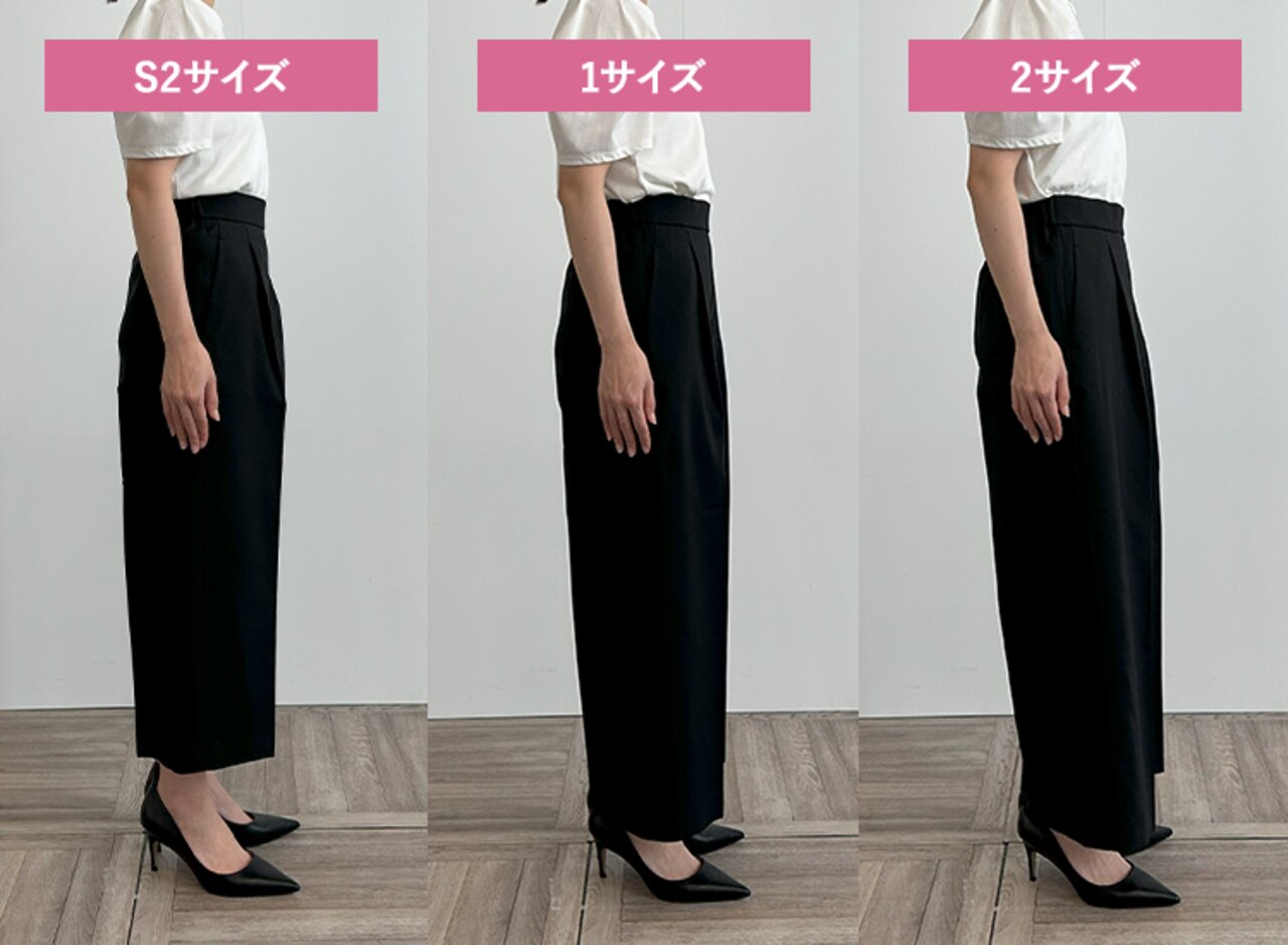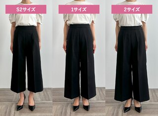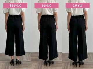 テーパードとは違い脚にゆとりがあるためサイズ1でもシルエットを崩さずはくことができました。サイズ1・2に関してはウエストサイズで選ぶこともおすすめします。S2は丈感が短くなってしまいました。