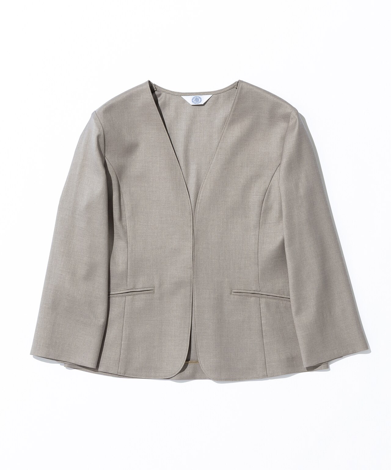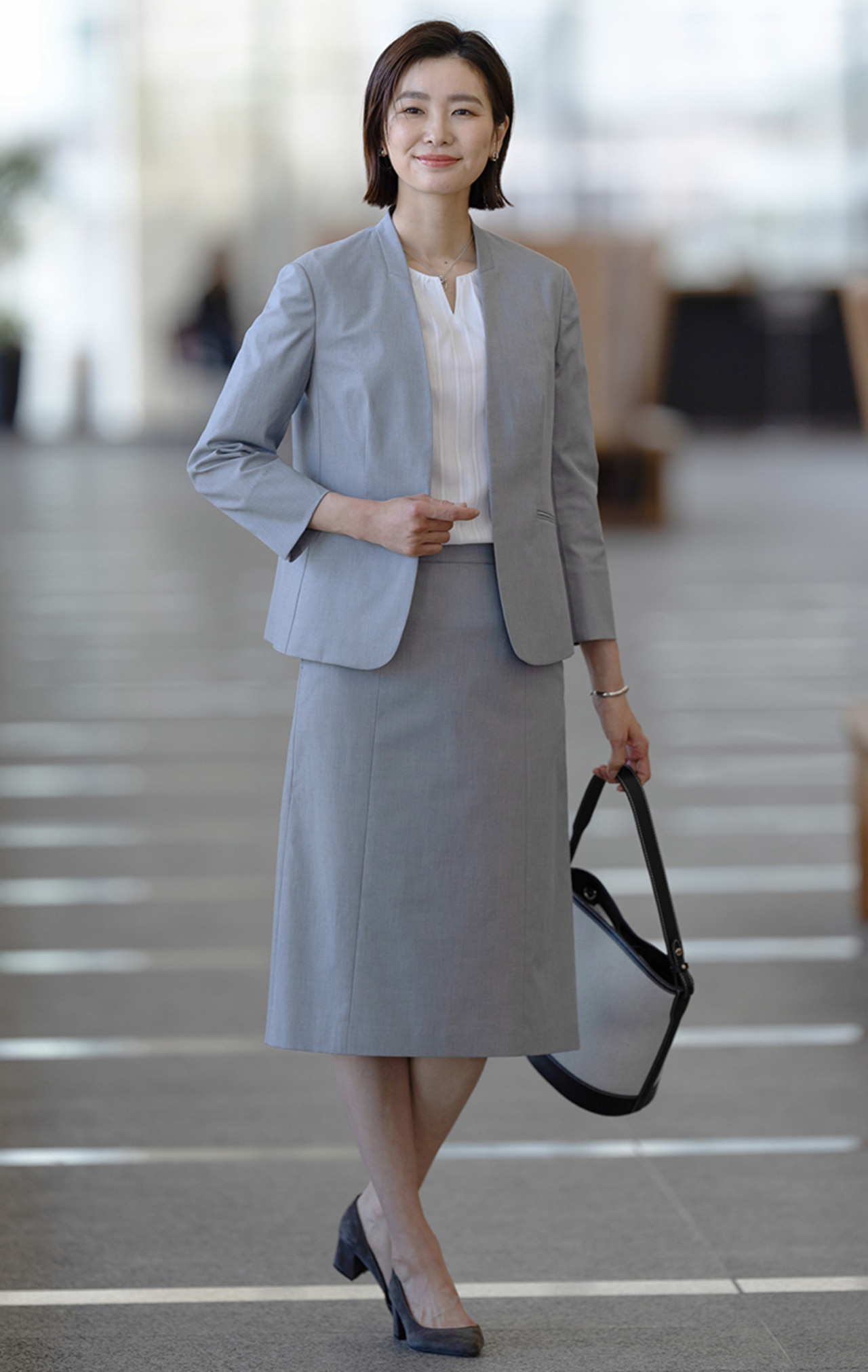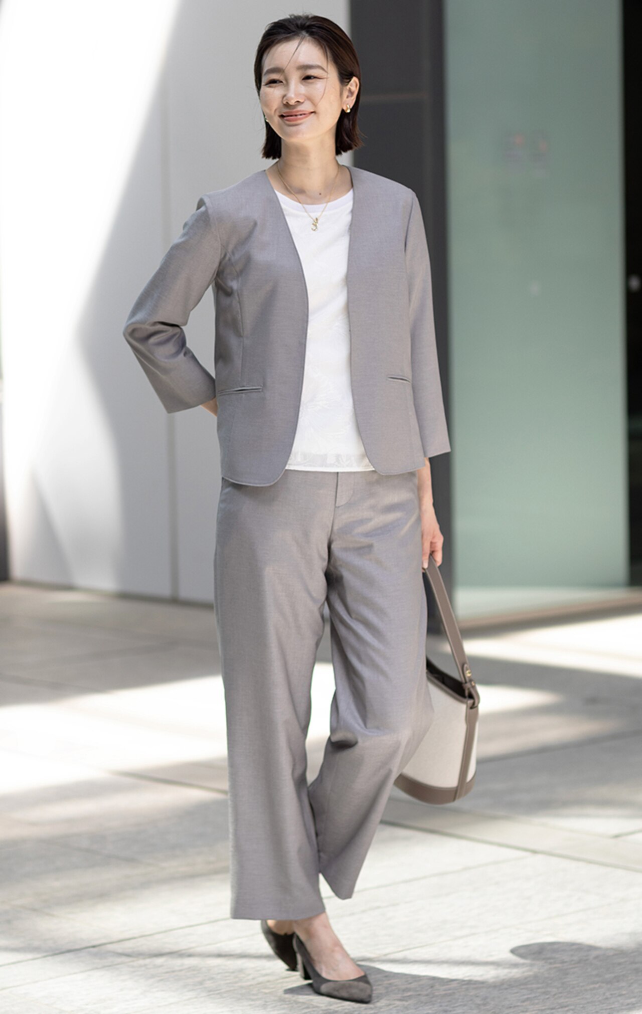 テーラードジャケット、ノーカラージャケット、スカートの展開カラーは、グレー(#033)、ベージュ(#033)とネイビー(#075)の3色展開。テーパードパンツとストレートパンツの展開カラーは、ライトベージュ(#002)、グレー(#003)、ベージュ(#033)、サックス(#073)、ネイビー(#075)とネイビーピンヘッド(#375)の6色展開です。