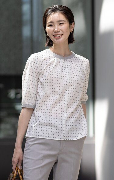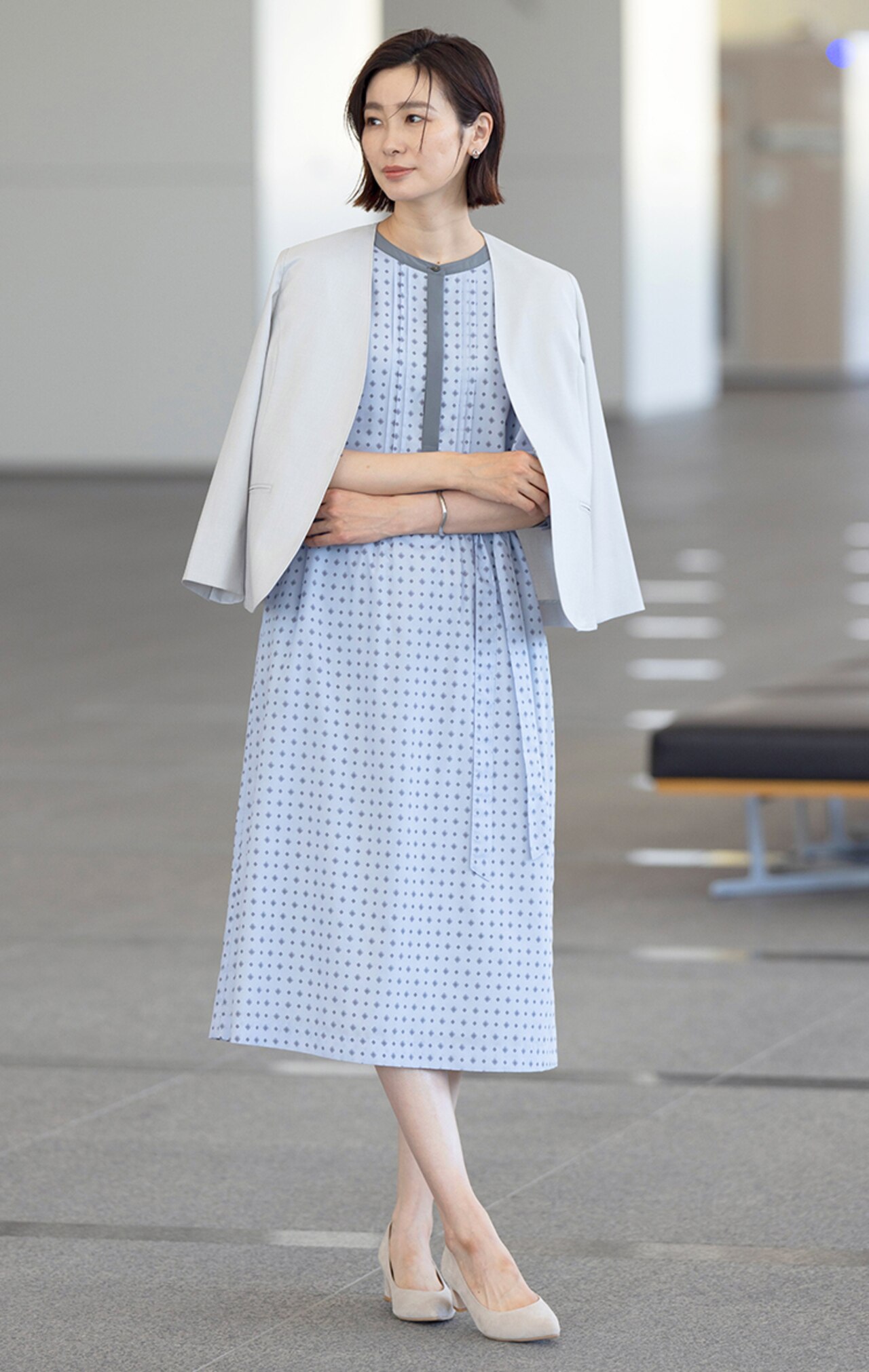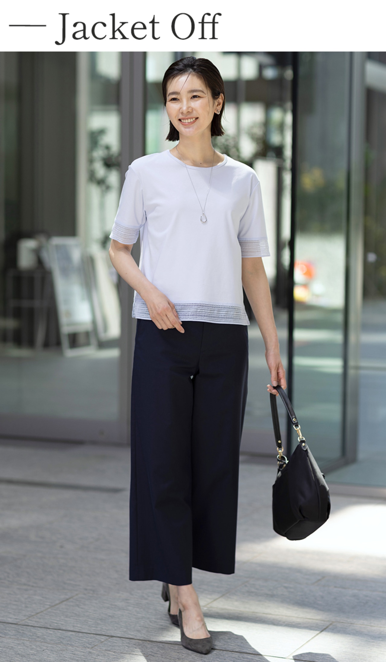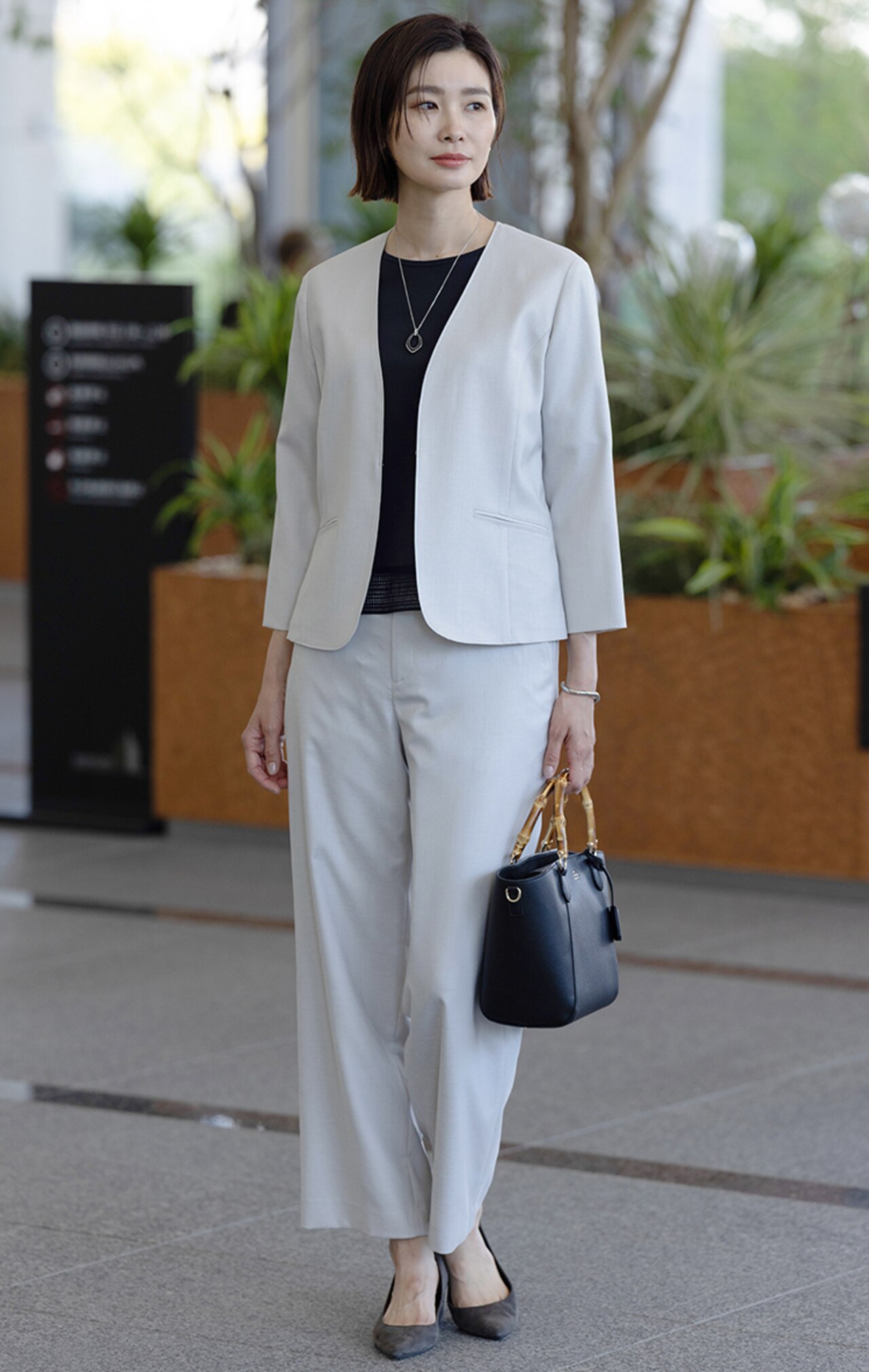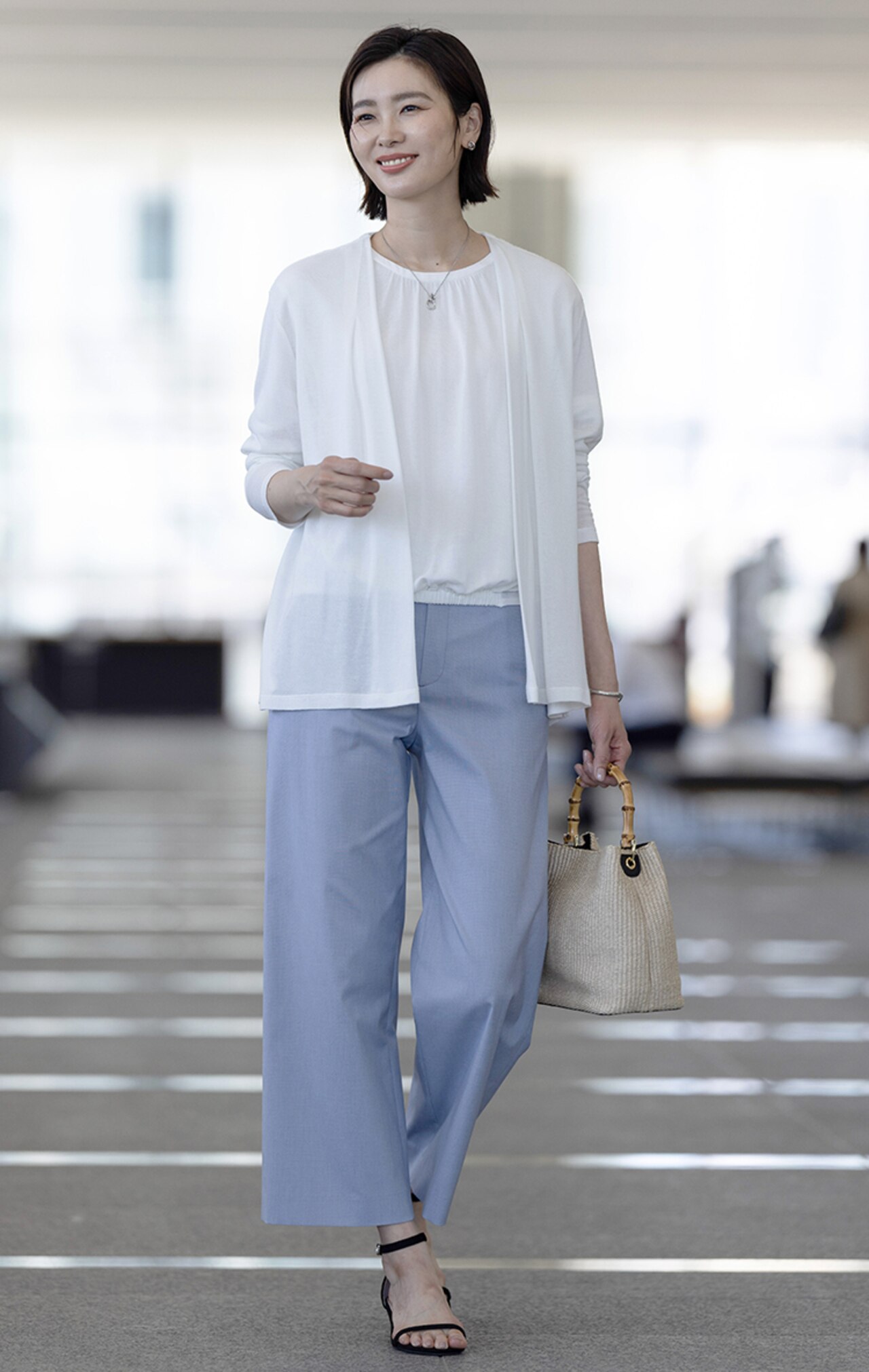 オンオフで着回せる軽やかなノーカラージャケット×接触冷感など機能性充実のリネン混ワイドパンツ