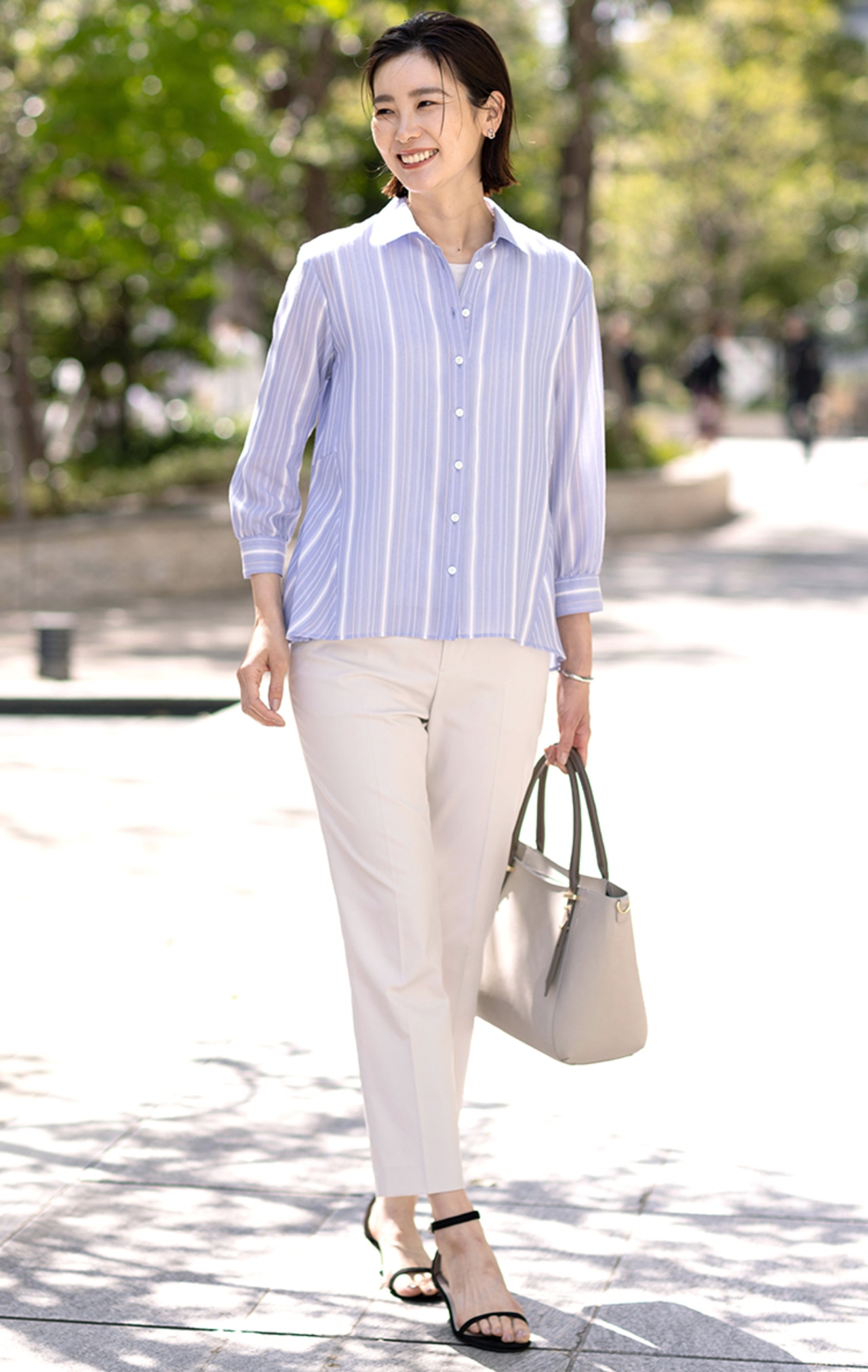 テーパードパンツ×オンオフ兼用きちんと見えシャツブラウス