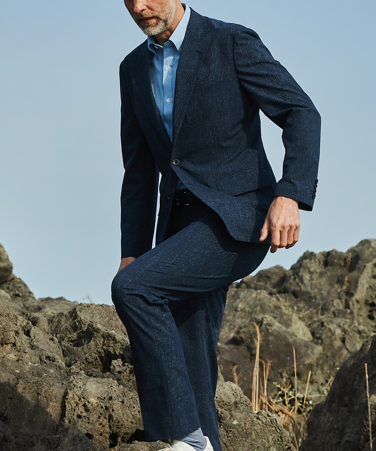 パンツ:汗や洗濯でもセンタープレスを美しく保ちます。程よいテーパードで細すぎず、ベルトループを備えつつもウエスト一部がゴム仕様なので、キチンとした印象は保ちつつ、起居もラクラク。