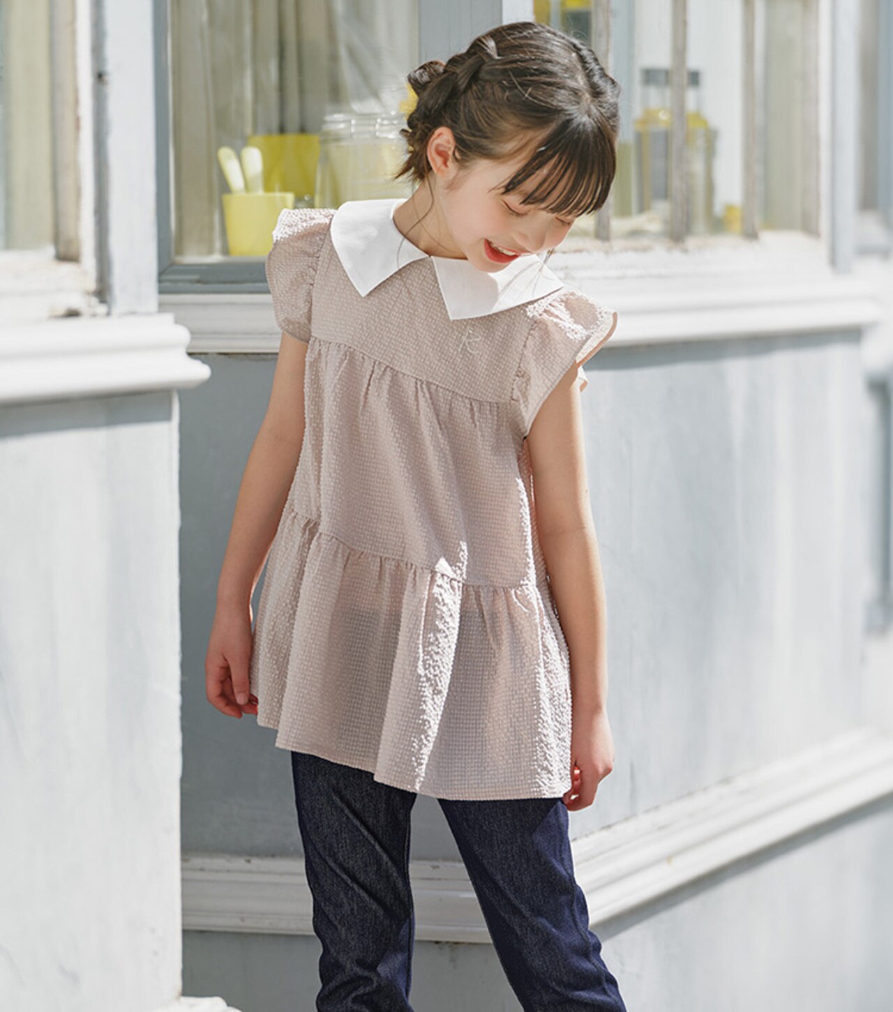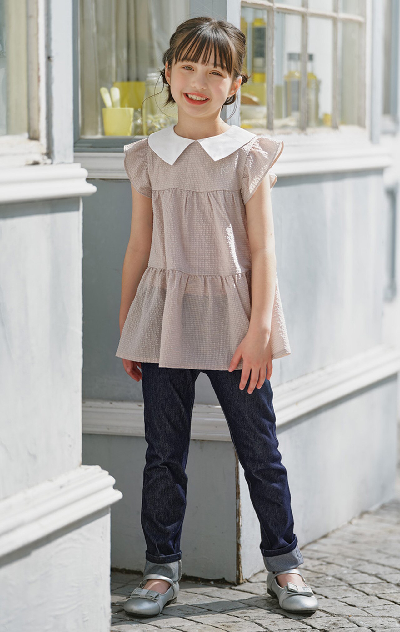 ティアードの切り替えで、ふんわりとしたフォルムと大きめの衿がかわいいブラウスに、細身のデニムニットパンツを合わせたコーディネート。カジュアルになりすぎず上品に着ていただけます。