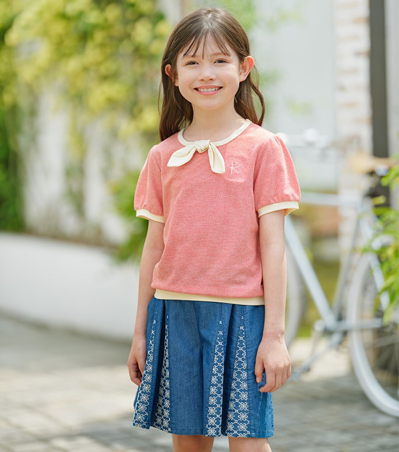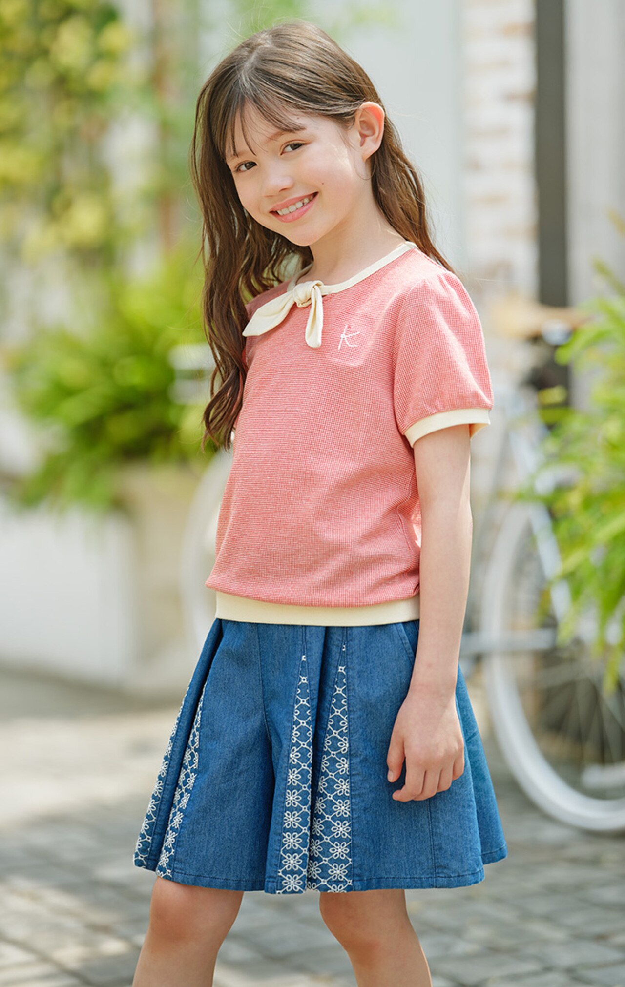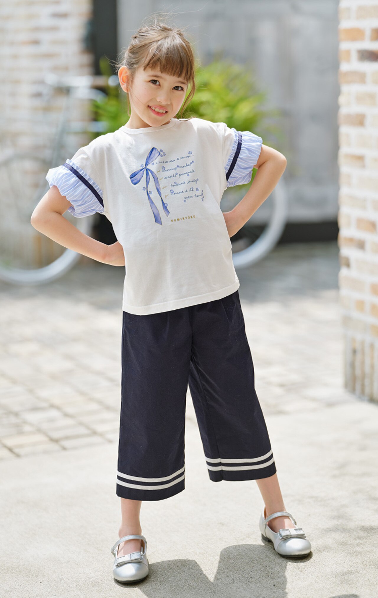 マリンスカーフのディティールがさわやかなアクセントになっているTシャツに、スカート見えするデニムキュロットを合わせたコーデ。マリンな色味が夏らしさを感じさせます。