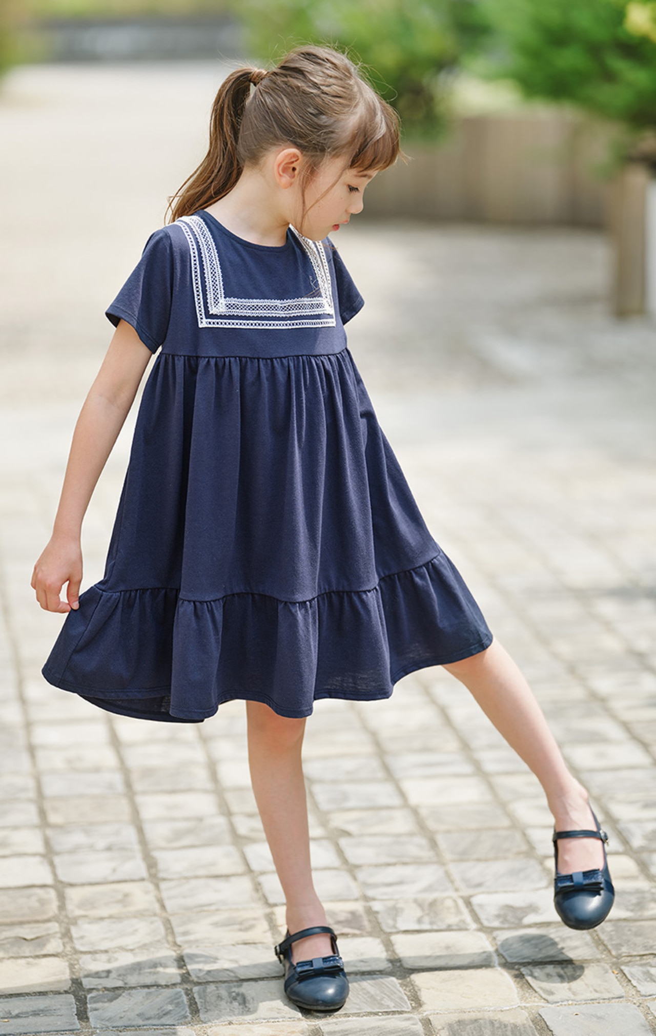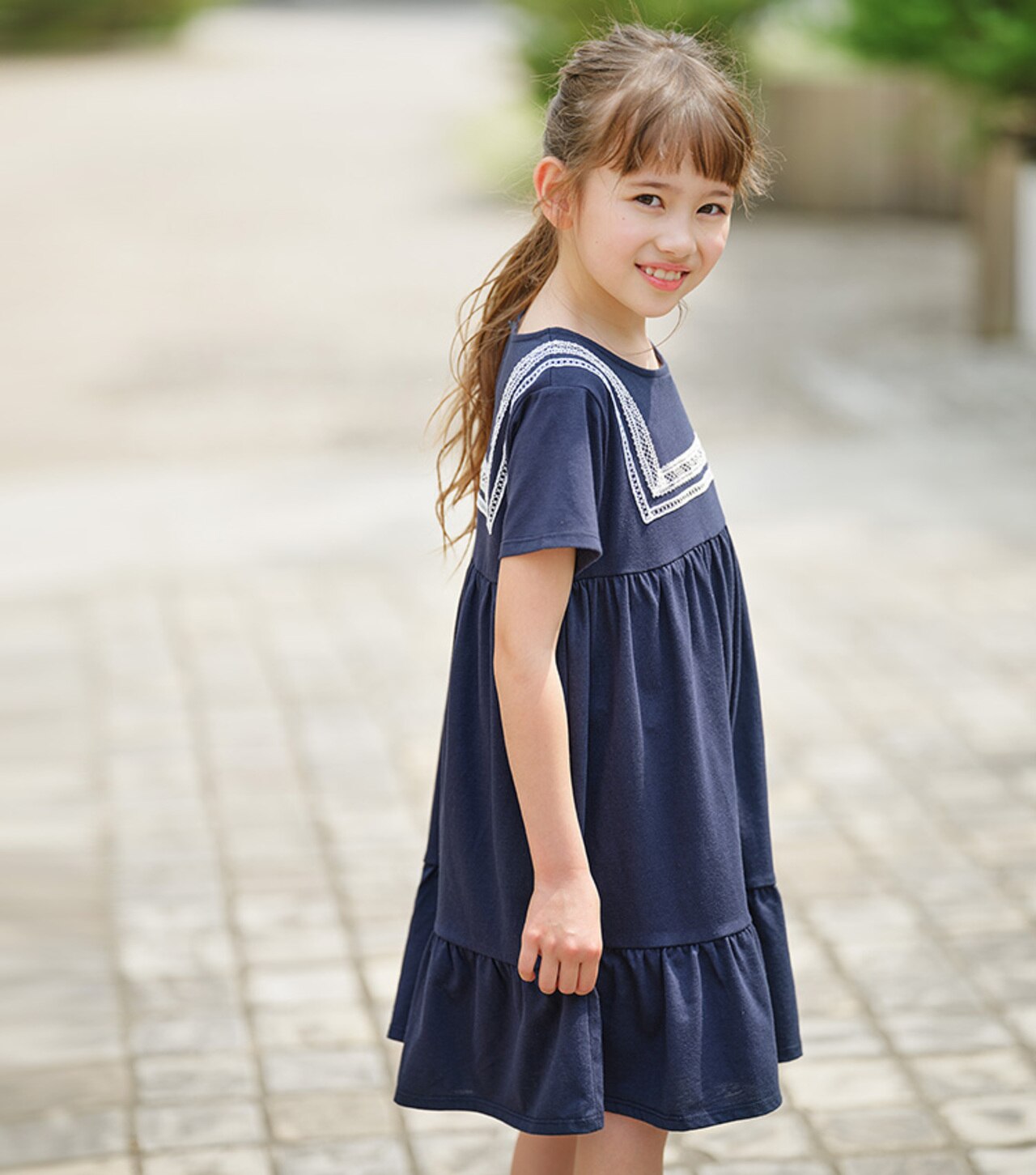 ヨークにあしらった2種類の白いレースがマリンな印象を与えてくれるワンピース。肌触りもさらっとしており、乾きやすいのも嬉しいポイントです!