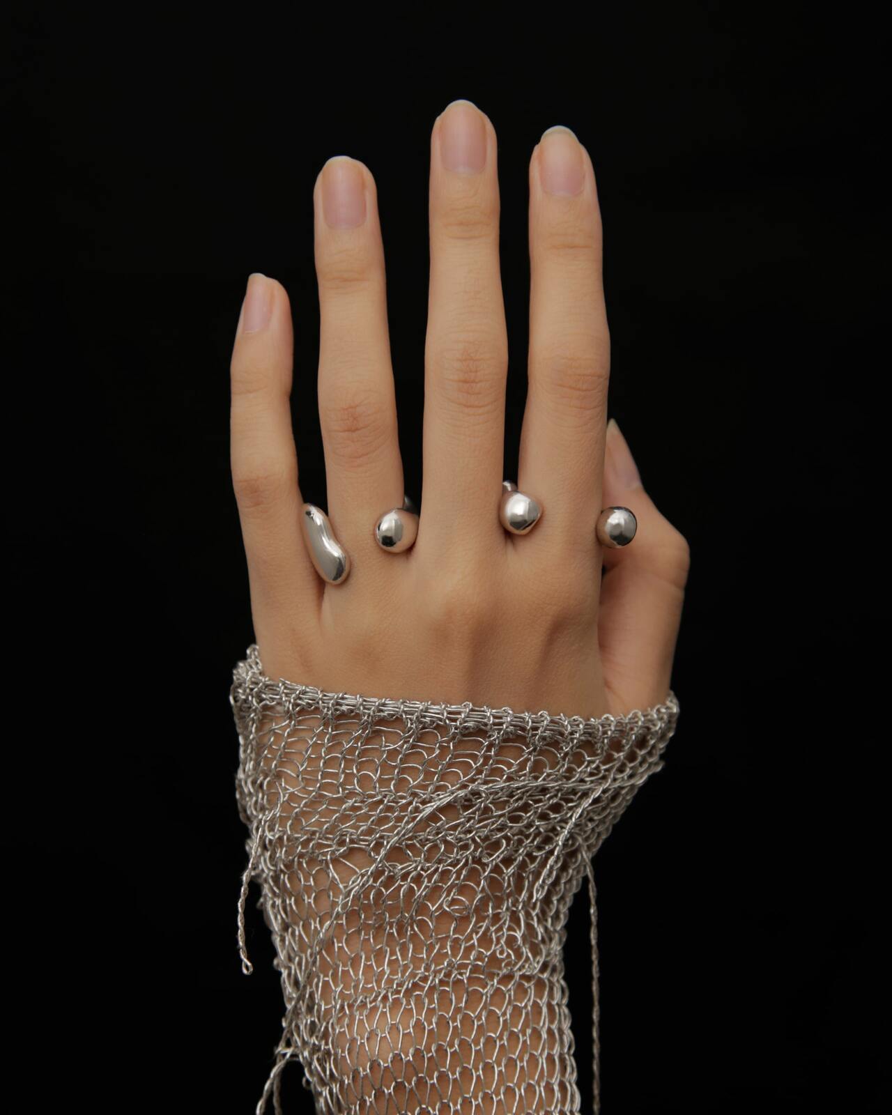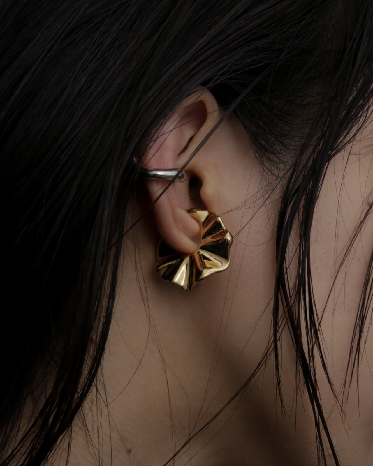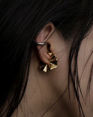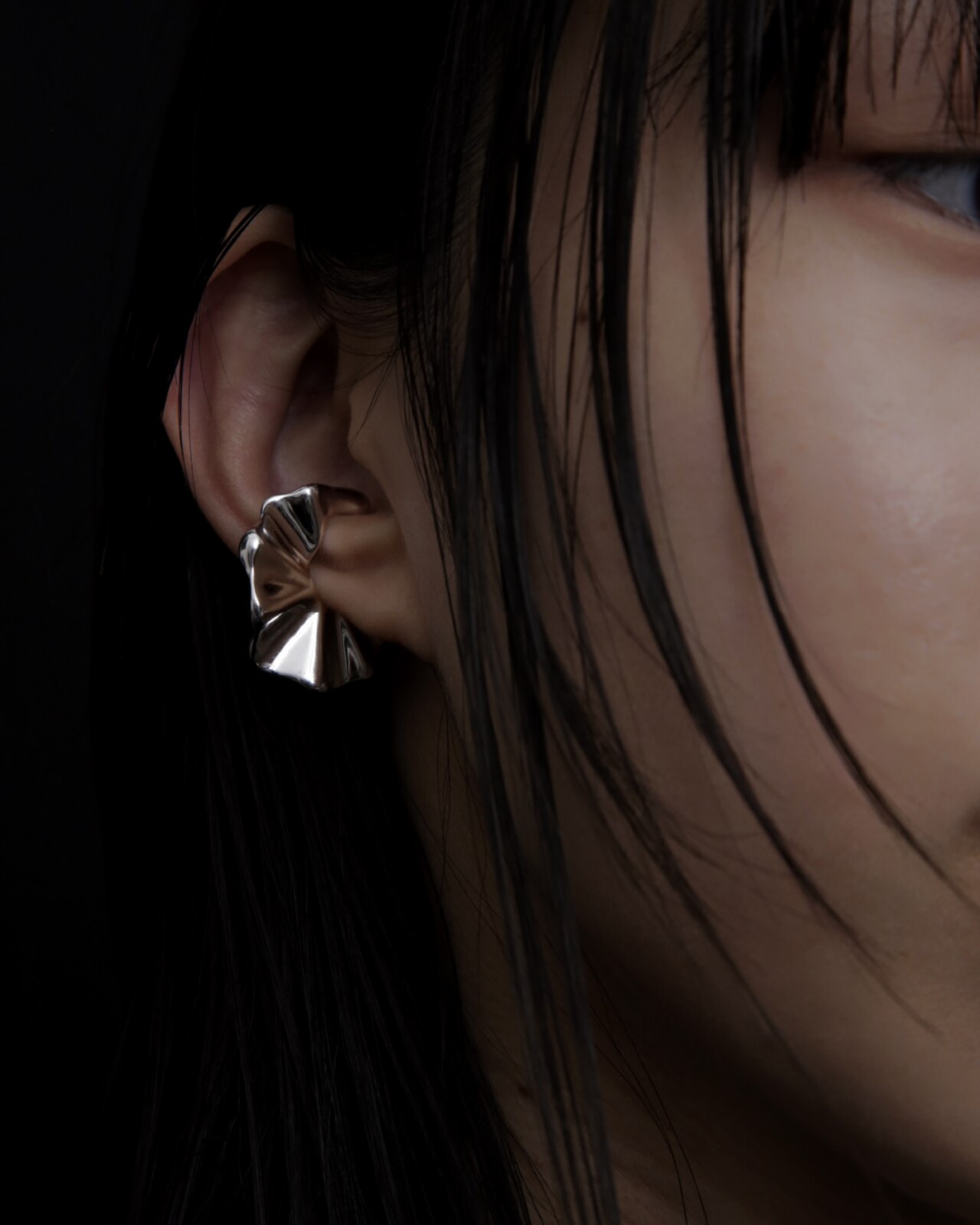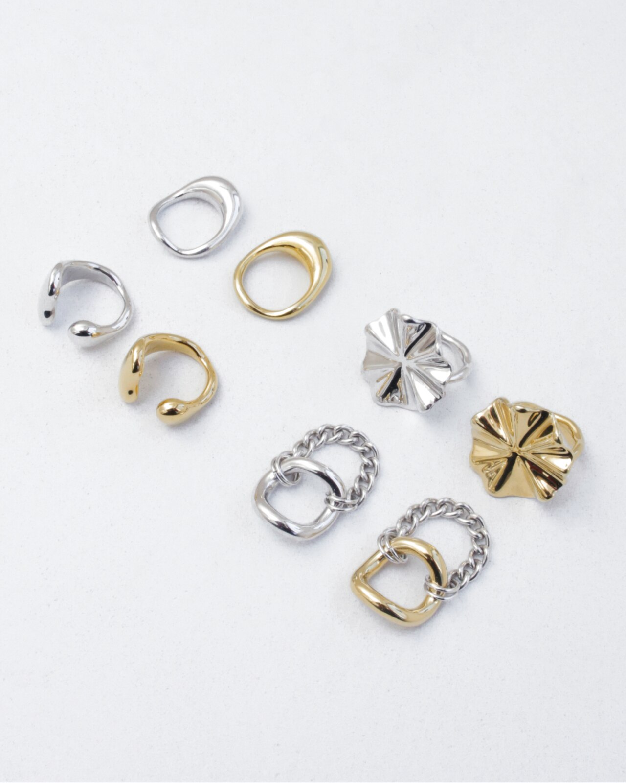 互いに建築・空間・デザインを学んだ経験から、アクセサリーという概念や輪郭から離れ、装飾的要素としてだけではない生っぽさが溢れる彫刻のようなニュアンスや、艶やかな膨らみと滑らかな曲線が特徴。