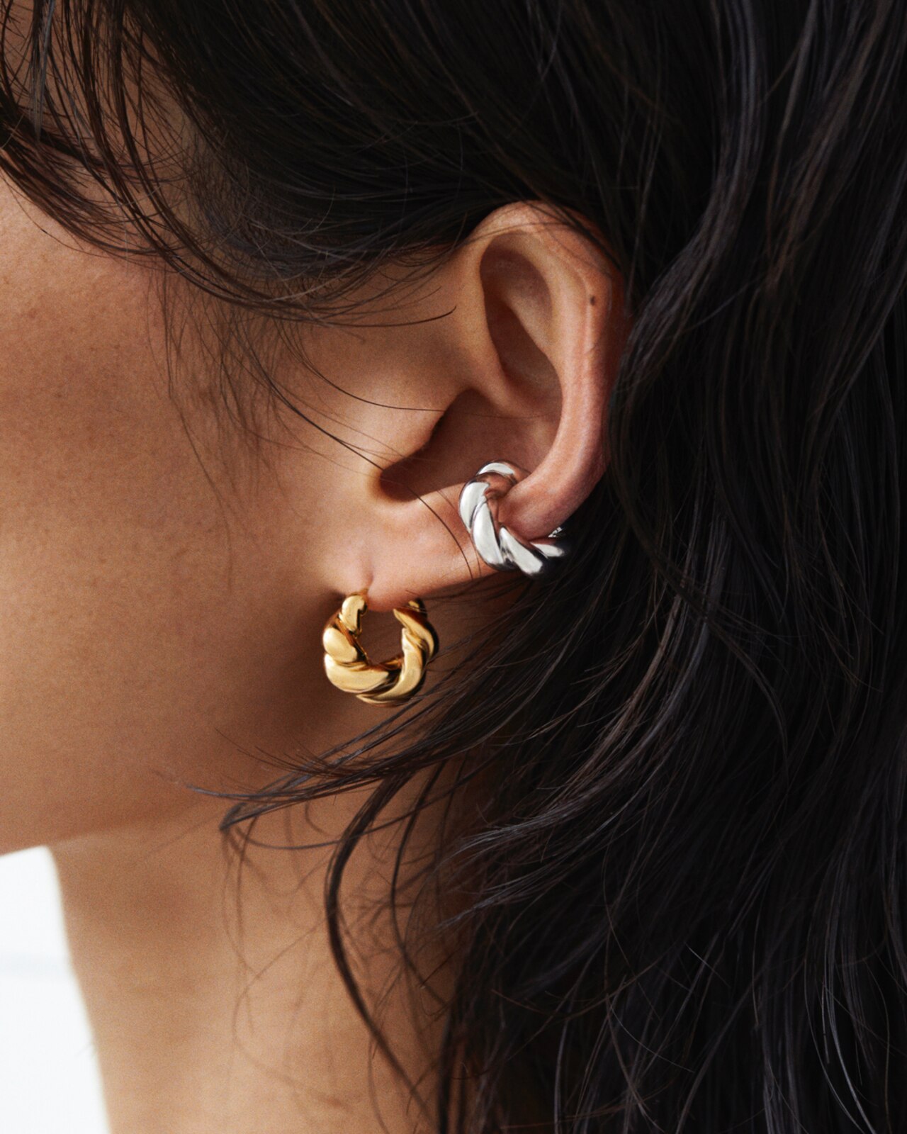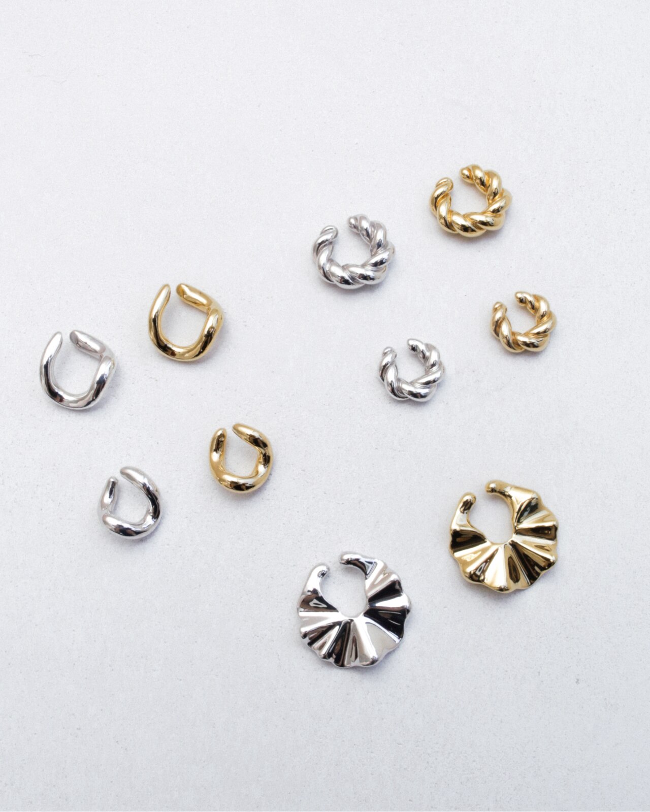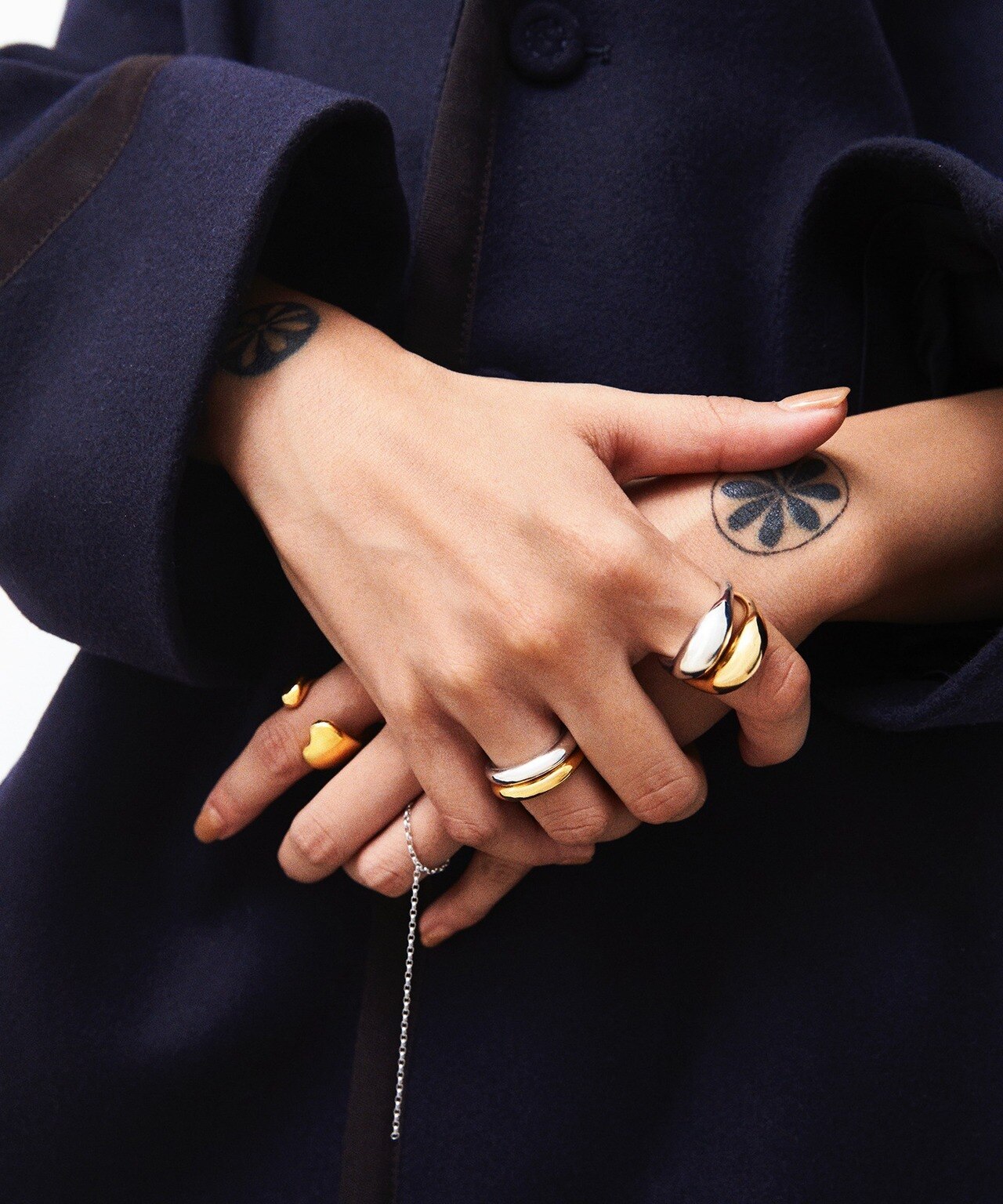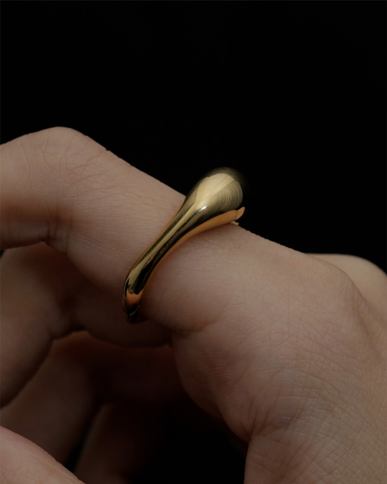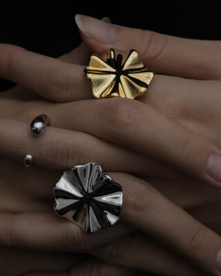 互いに建築・空間・デザインを学んだ経験から、アクセサリーという概念や輪郭から離れ、装飾的要素としてだけではない生っぽさが溢れる彫刻のようなニュアンスや、艶やかな膨らみと滑らかな曲線が特徴。