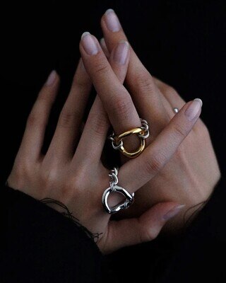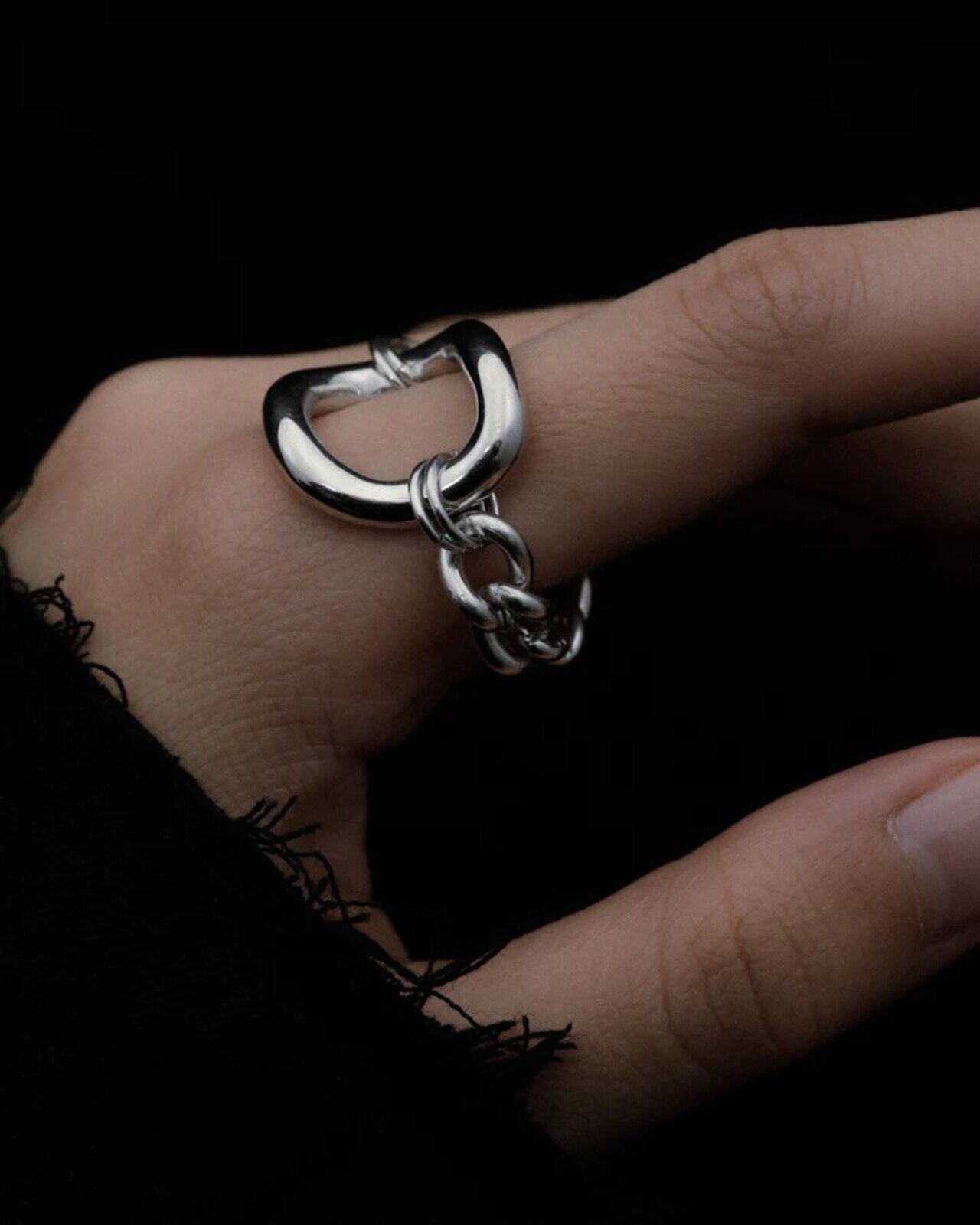 存在感のある美しいフープの陰影とチェーンが特徴のリングです。