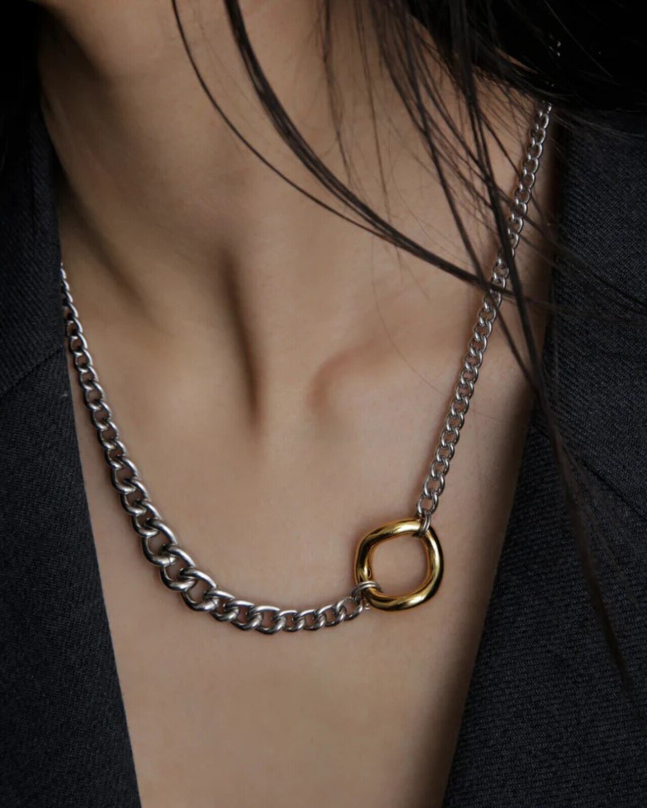 ボールドなチェーンとエレガントなHugのエレメントのつながりは、さりげない刺激を手元に感じさせます。