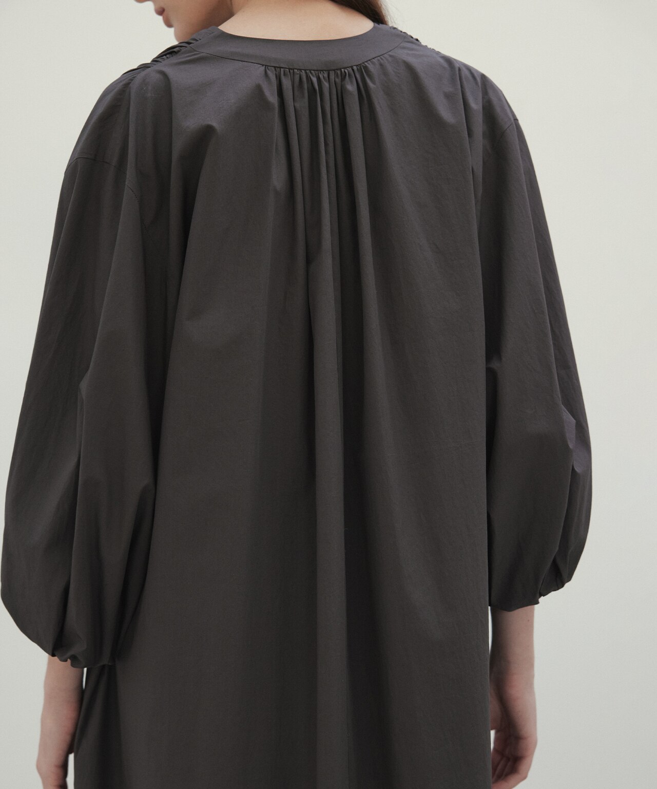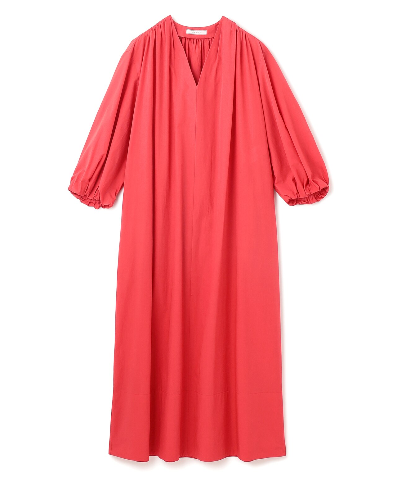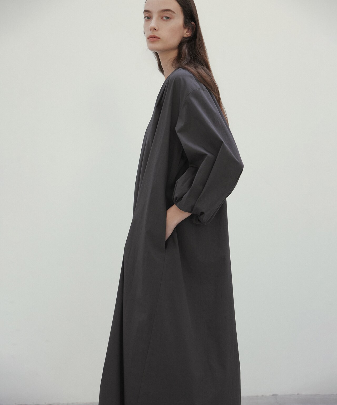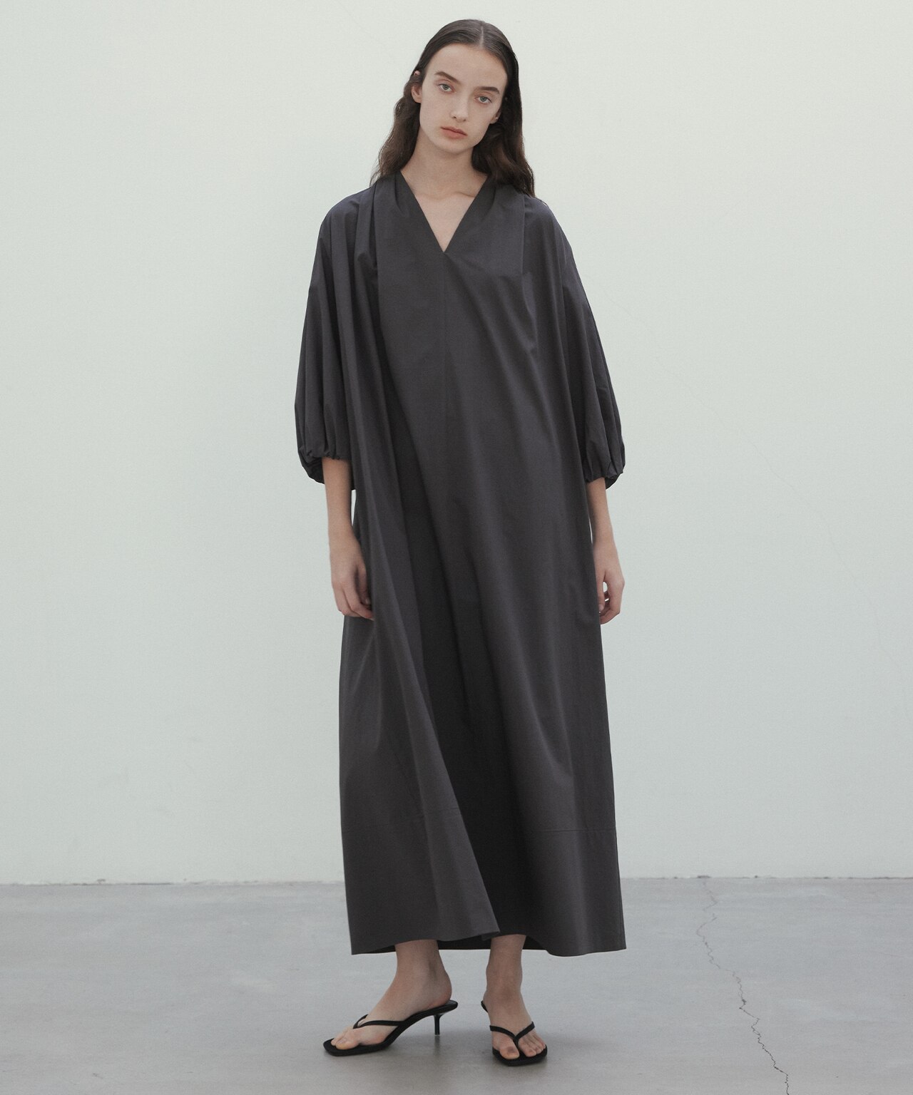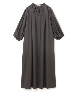シャープなVネックと立体的なパフスリーブが華やかなロングワンピース。すっきりとした首元がマニッシュながら大人のリラックス感溢れるデザイン。Aラインの広がりとシャリ感が涼しく、これからのお出かけやご旅行にぴったりなワンピースです。