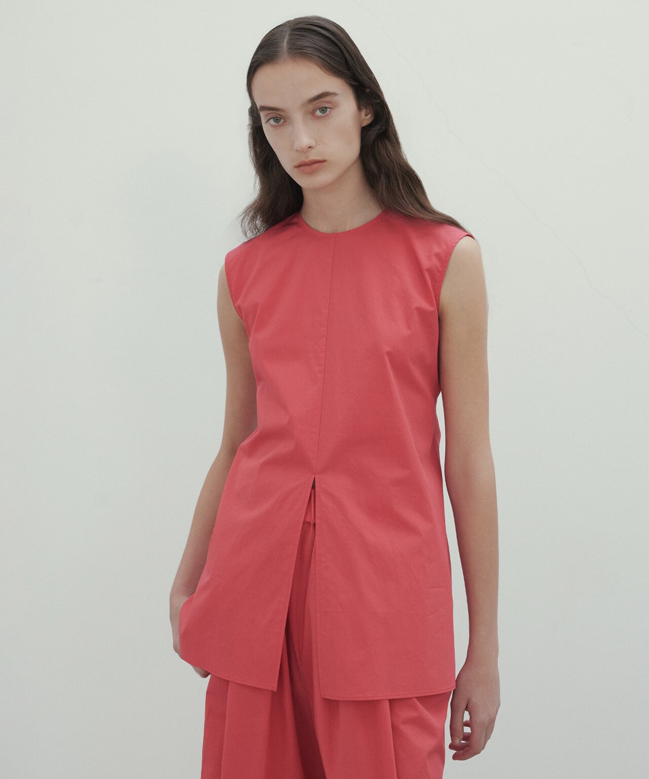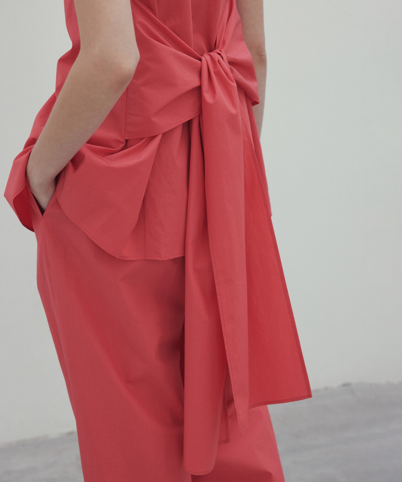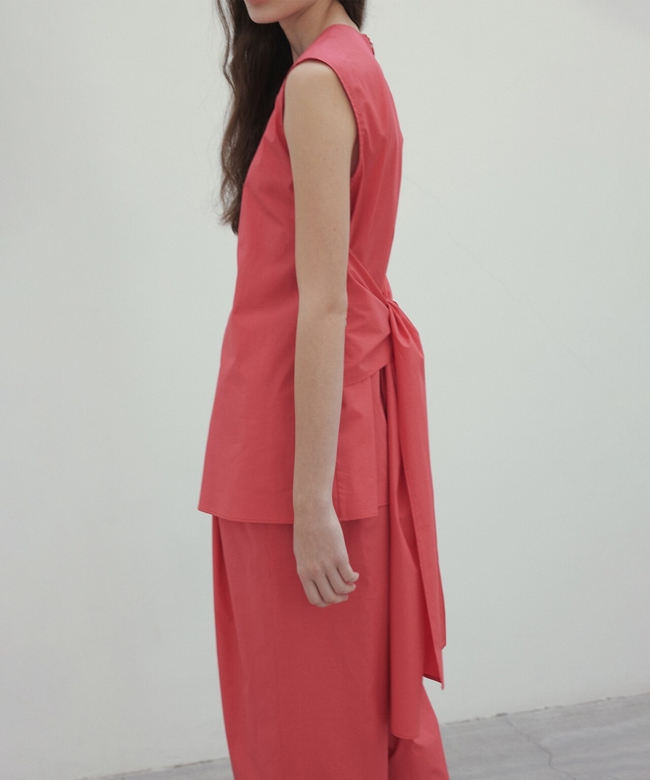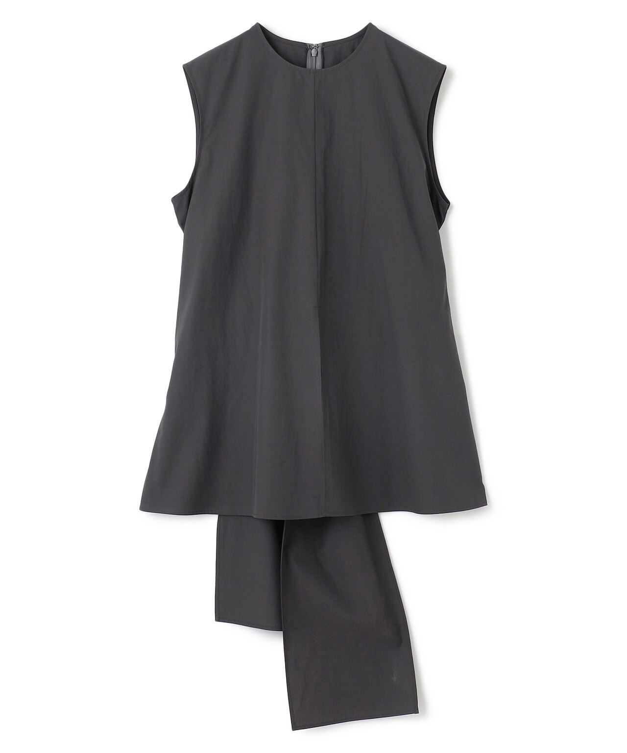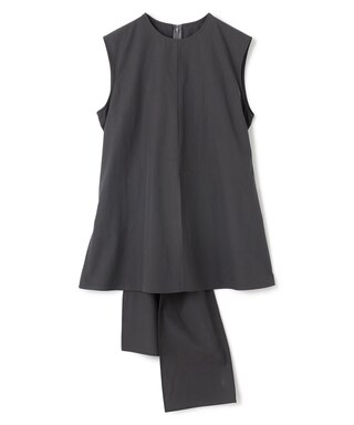 後ろリボンがポイントになったノースリーブブラウス。シンプルなデザインながら、バックリボンと前スリットがスタイリングにニュアンスを出すシルエット。ベーシックなアイテムを合わせても、1枚で着映えるブラウスです。