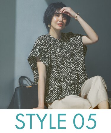 洗濯機可能なスクエアシルエットのプリントシャツと、ベージュストレッチパンツの洗練モノトーン。ふんわりシルエットのシャツは、暑い夏の日にぴったり。シンプルだけど印象的な大人のコーディネートが完成。