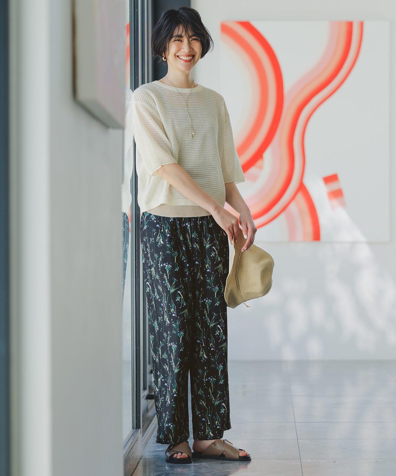 洗濯機可能なメッシュのアイボリーニットが通気性と軽やかさを両立。リラックス感のある柄ワイドパンツで、動きやすさも快適さも実現。風を感じながら、お出かけも旅行も軽快に楽しめる。