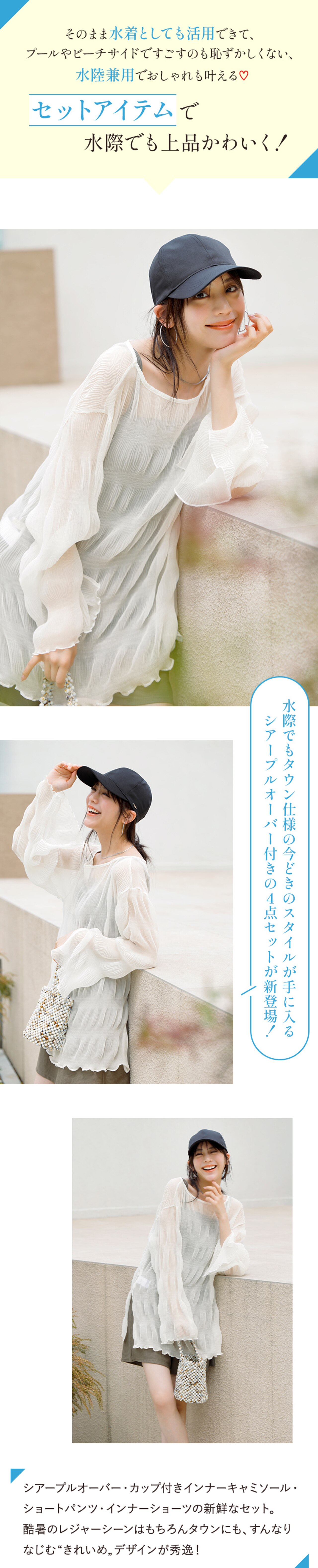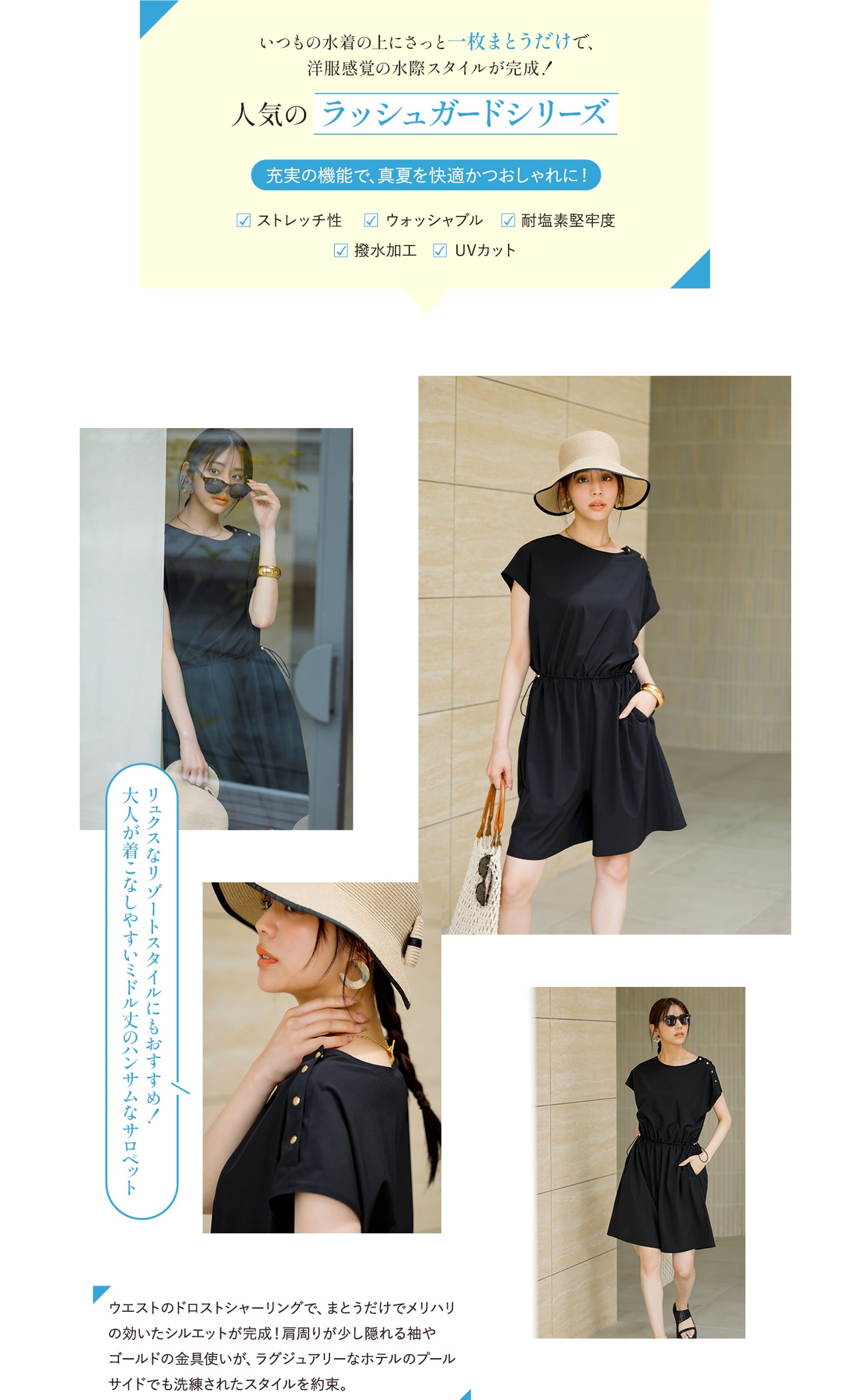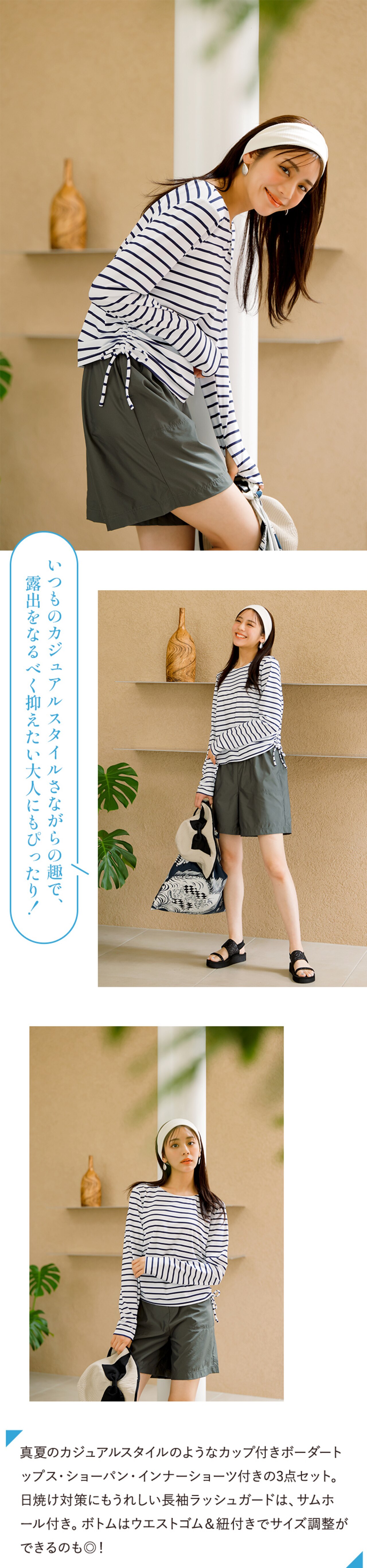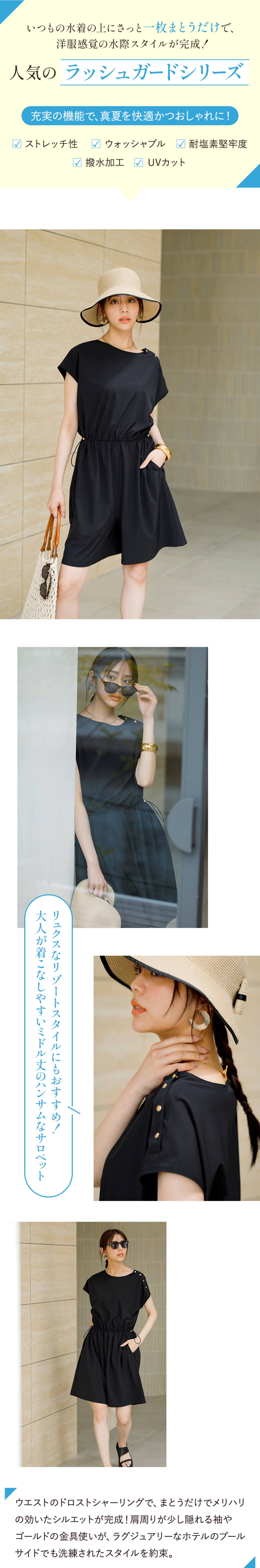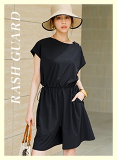 セットで旬のコーディネートが完成でき、そのままプールや海にも入れるスイムウェア&タウン仕様にもレジャーにも、着回し自在なラッシュガードシリーズ。センスも気分もUPする、こだわりのデザインと高機能を詰め込みました!