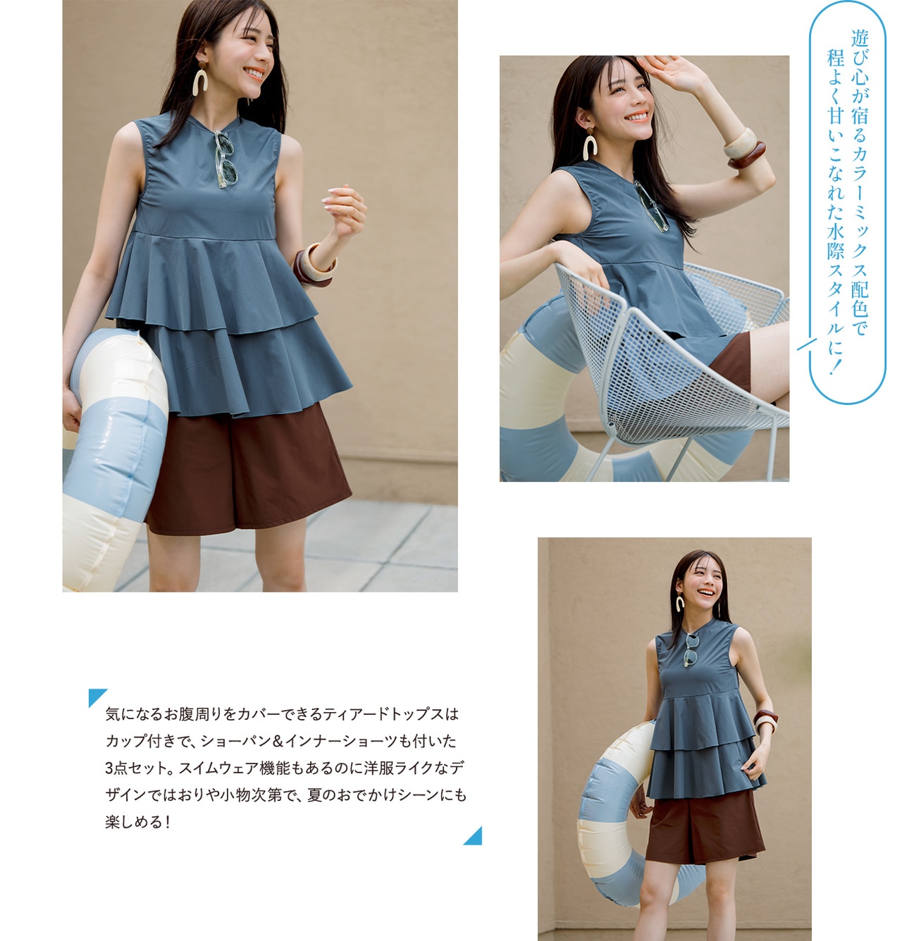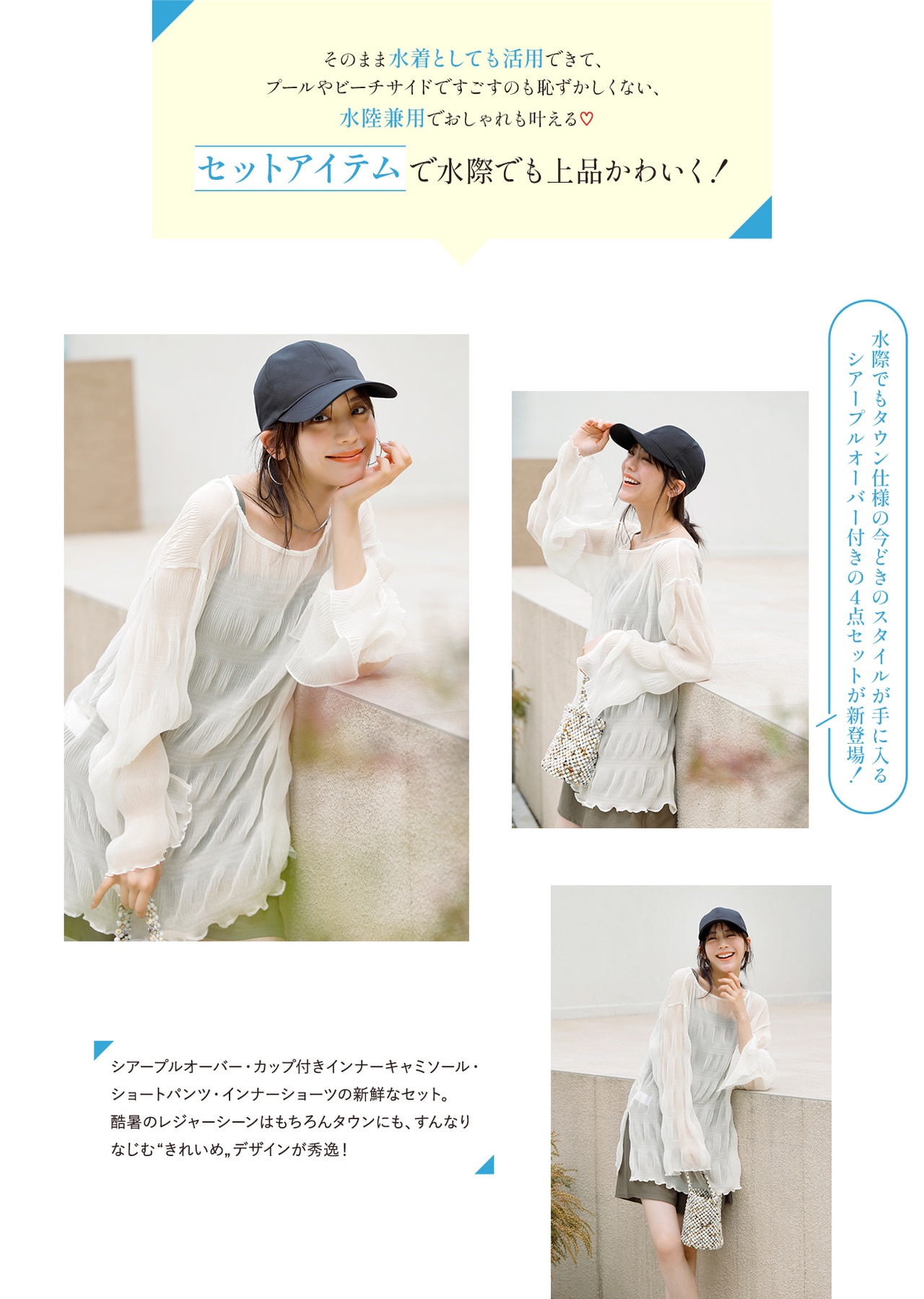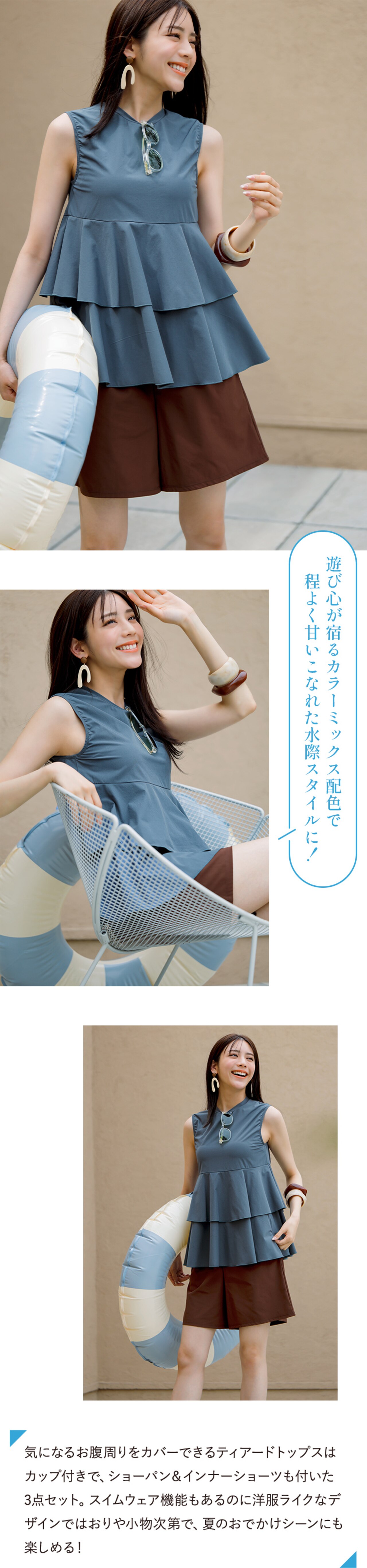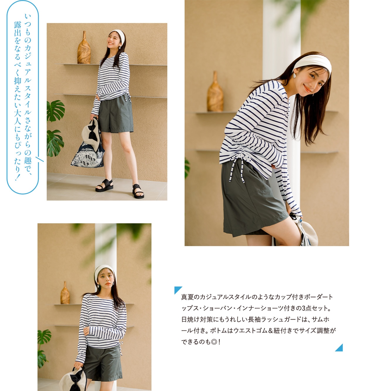 セットで旬のコーディネートが完成でき、そのままプールや海にも入れるスイムウェア&タウン仕様にもレジャーにも、着回し自在なラッシュガードシリーズ。センスも気分もUPする、こだわりのデザインと高機能を詰め込みました!