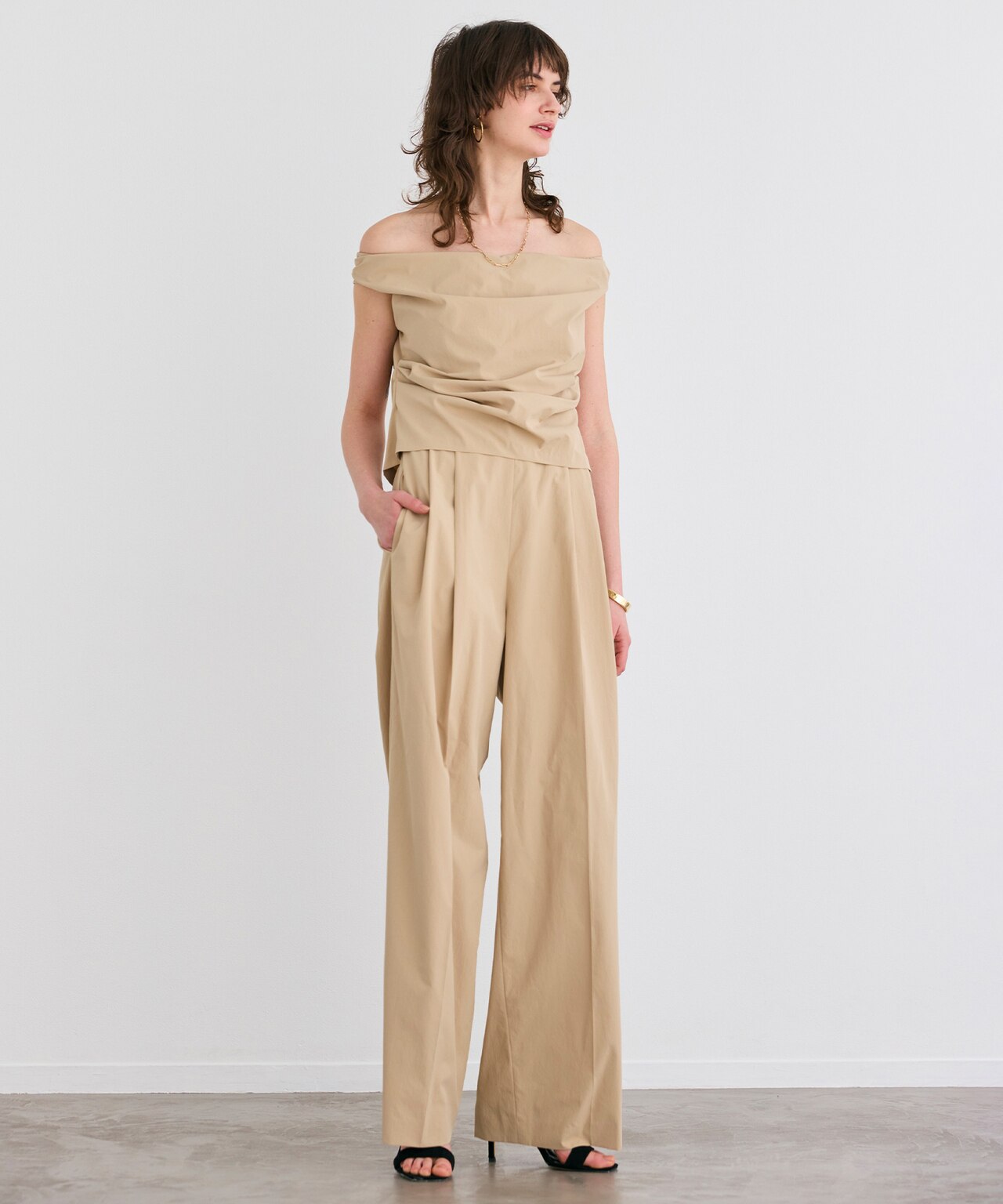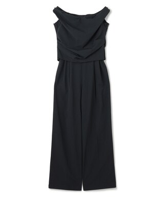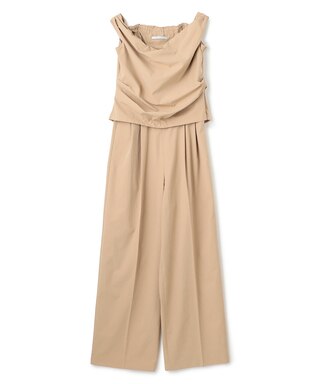 オフショルダーが肩回りを優しく包み込み、高めのウエストラインで自然にスタイルアップに見せてくれるシルエット。パンツ部分はゴム仕様で着心地は楽に、ワイドパンツの柔らかな抜け感を加える大人のオールインワン。