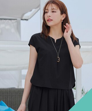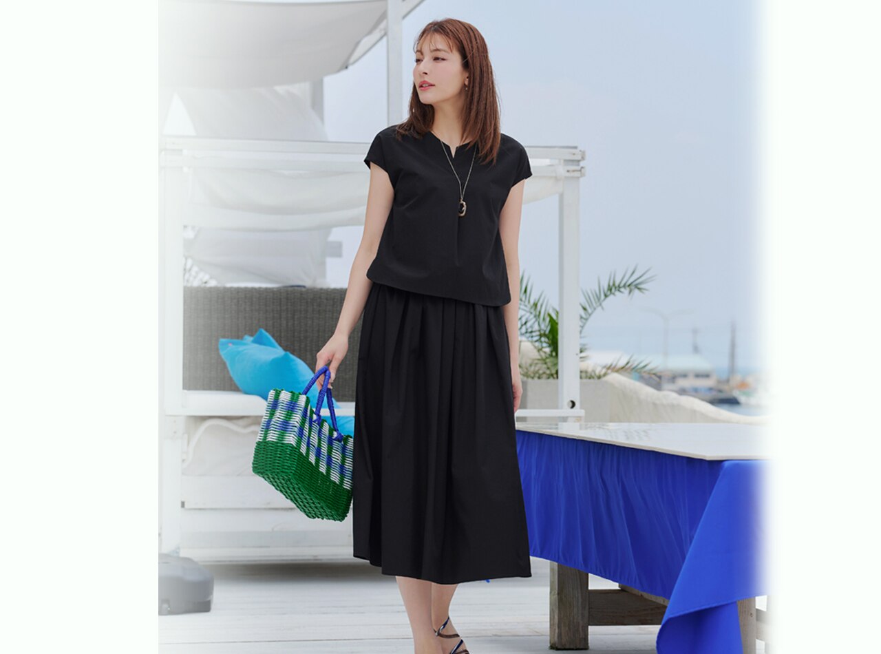 シンプルながら大人上品さを感じれるセットアップは、暑くても快適に着られる素材でご用意。薄手の生地感で涼しく、伸縮性もある生地で動きやすいのが魅力。セットでも単品でも使えるので1着で何通りもの着こなしができちゃうのも嬉しいポイント。ブラックはきれい目な印象なので、お仕事にも日常使いもおすすめです。