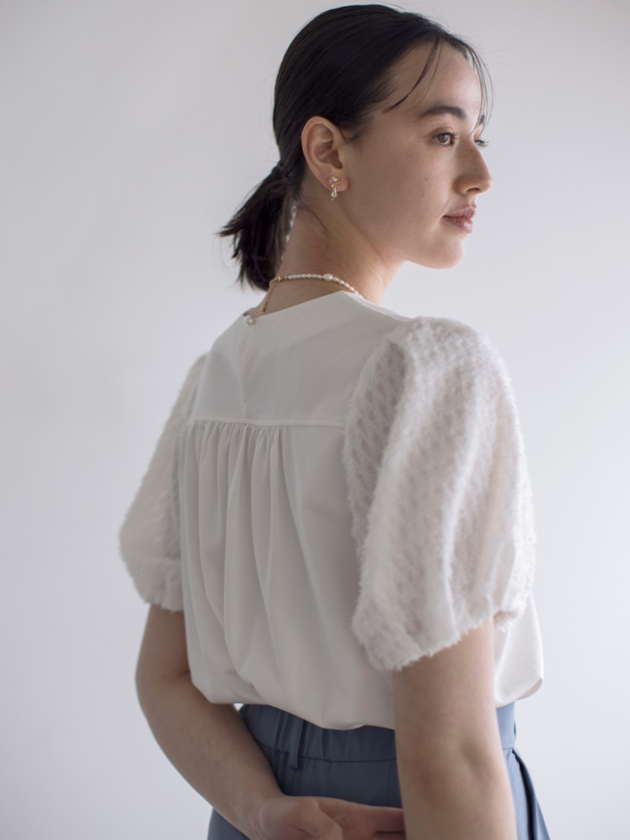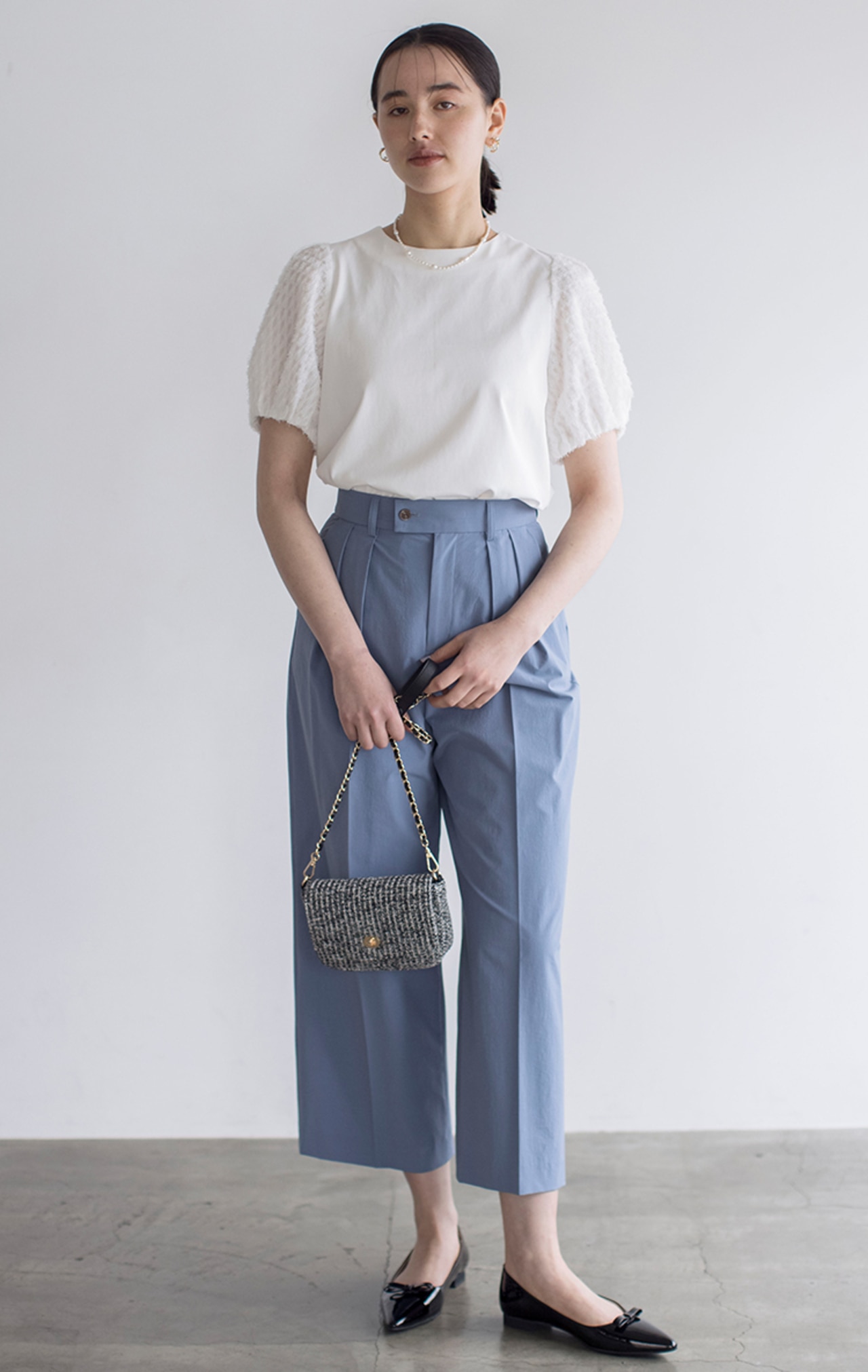 ホワイト×ブルーで爽快な色合わせ。トップスとパンツのシンプルワンツーコーデも袖のジャカードがフェミニンな印象に!