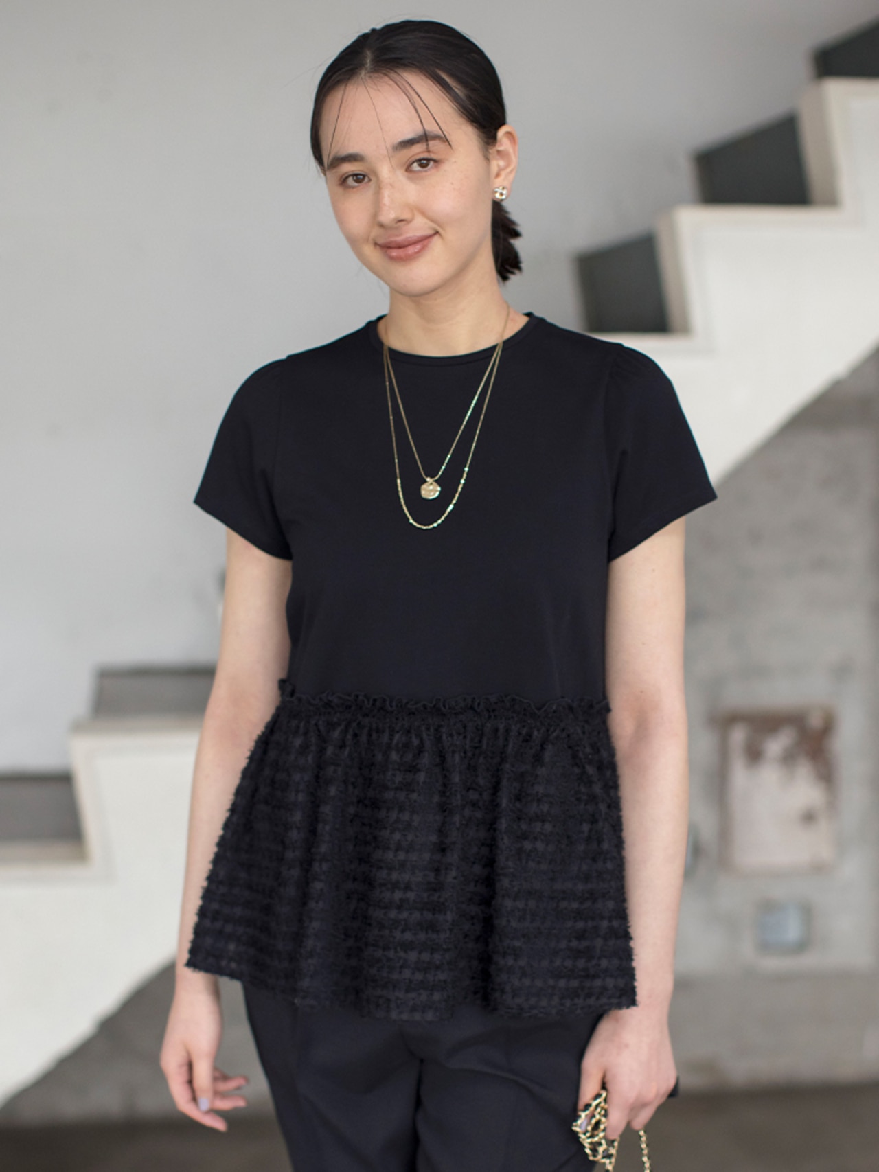 一見シンプルなブラックコーデも、華やかなカットソーで品良くおしゃれに。大きめのネックレスやチェーンバッグなど小物使いで夏らしい着こなしに!
