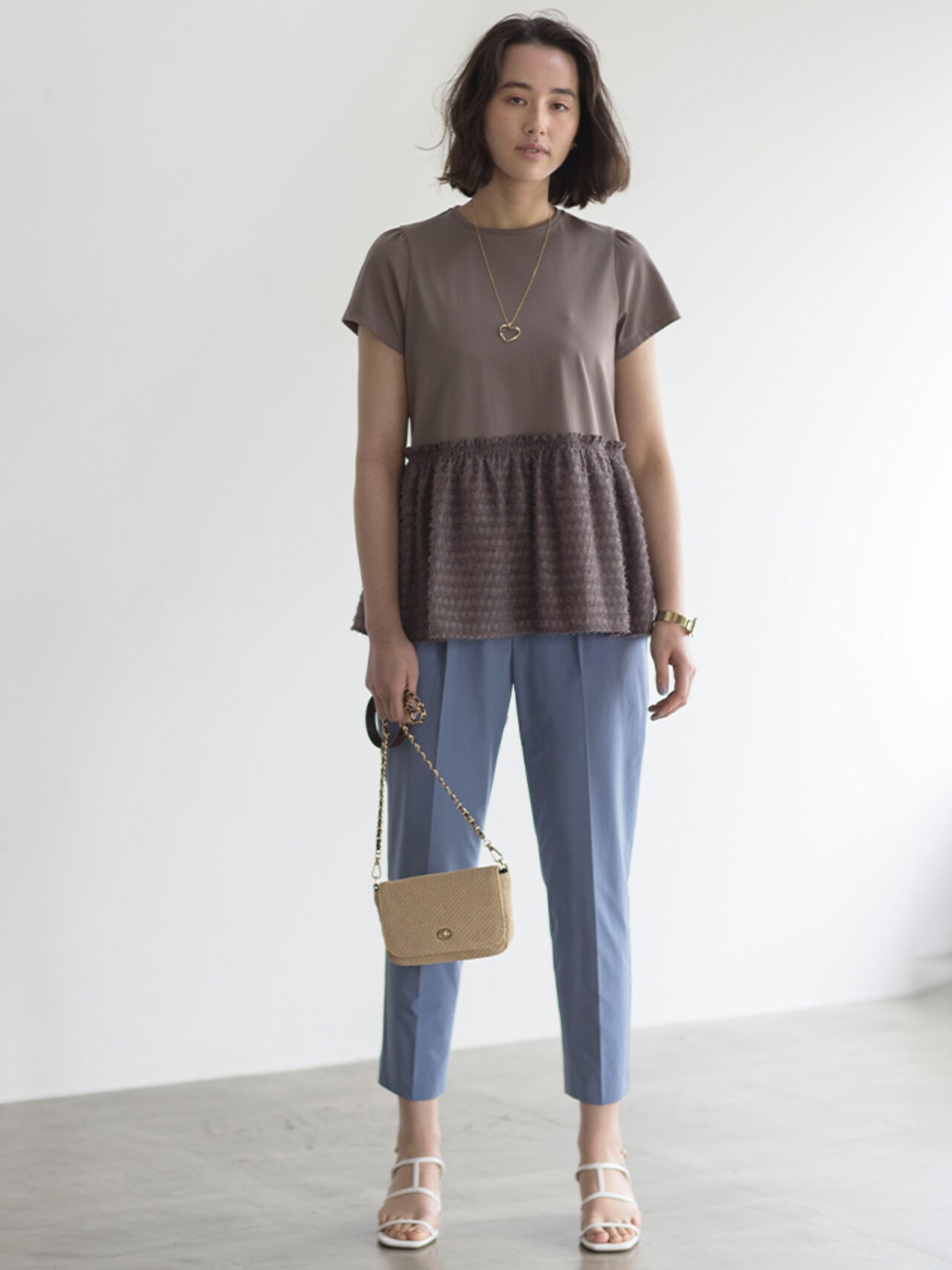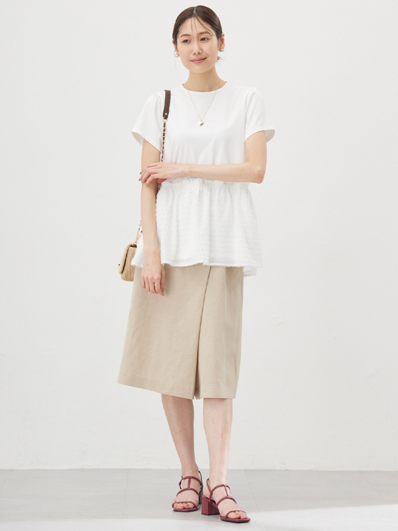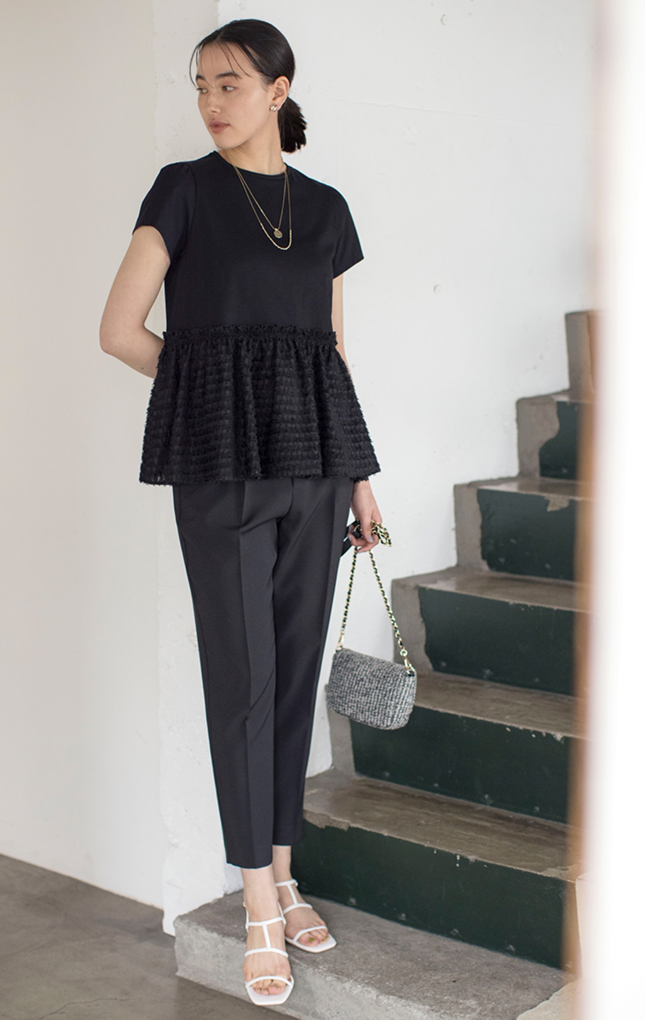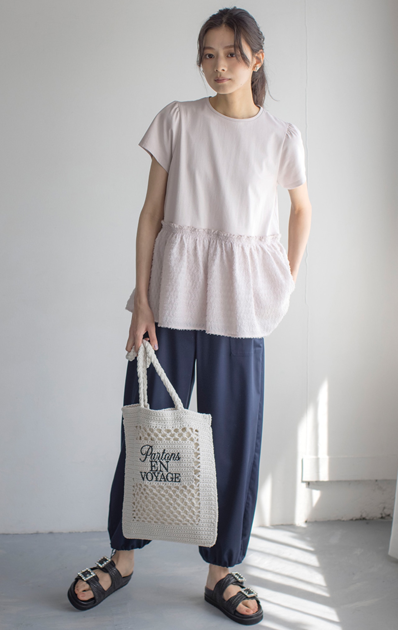 ジャカードのペプラム裾が華やかなトップスを、ドロストパンツとフラットサンダルでキレよく着こなして。カジュアルなアイテムも華やかなトップスで大人可愛いコーデに。