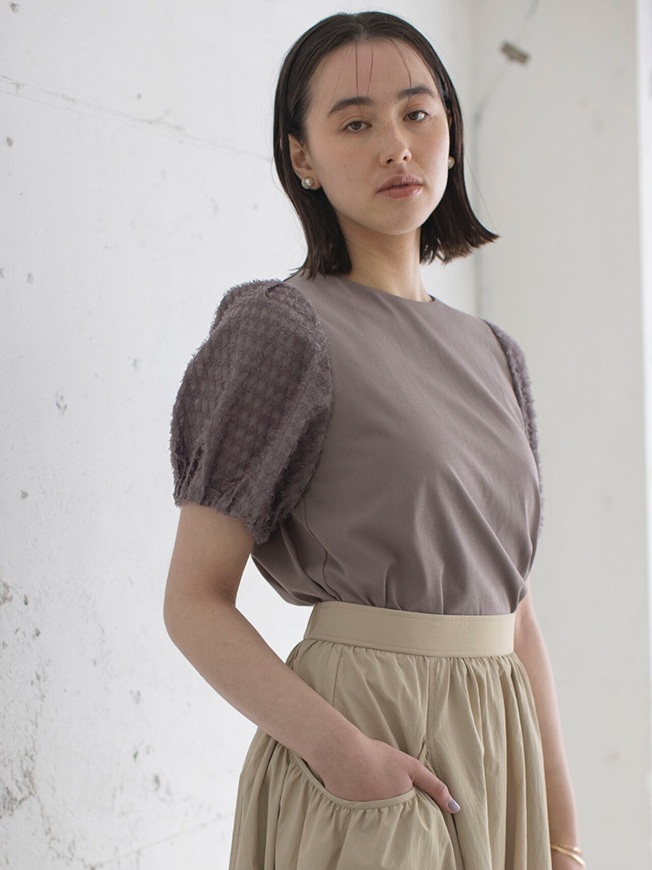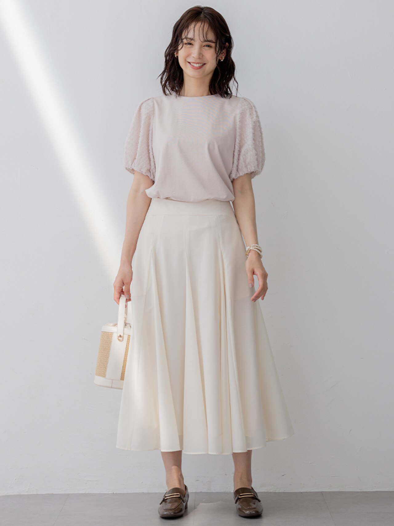 着こなしの鮮度を上げるモカグレー。ベージュの明るい色みと組み合わせると夏らしくおしゃれに仕上がります!スカートは機能性抜群で夏のアクティブにもおすすめです。