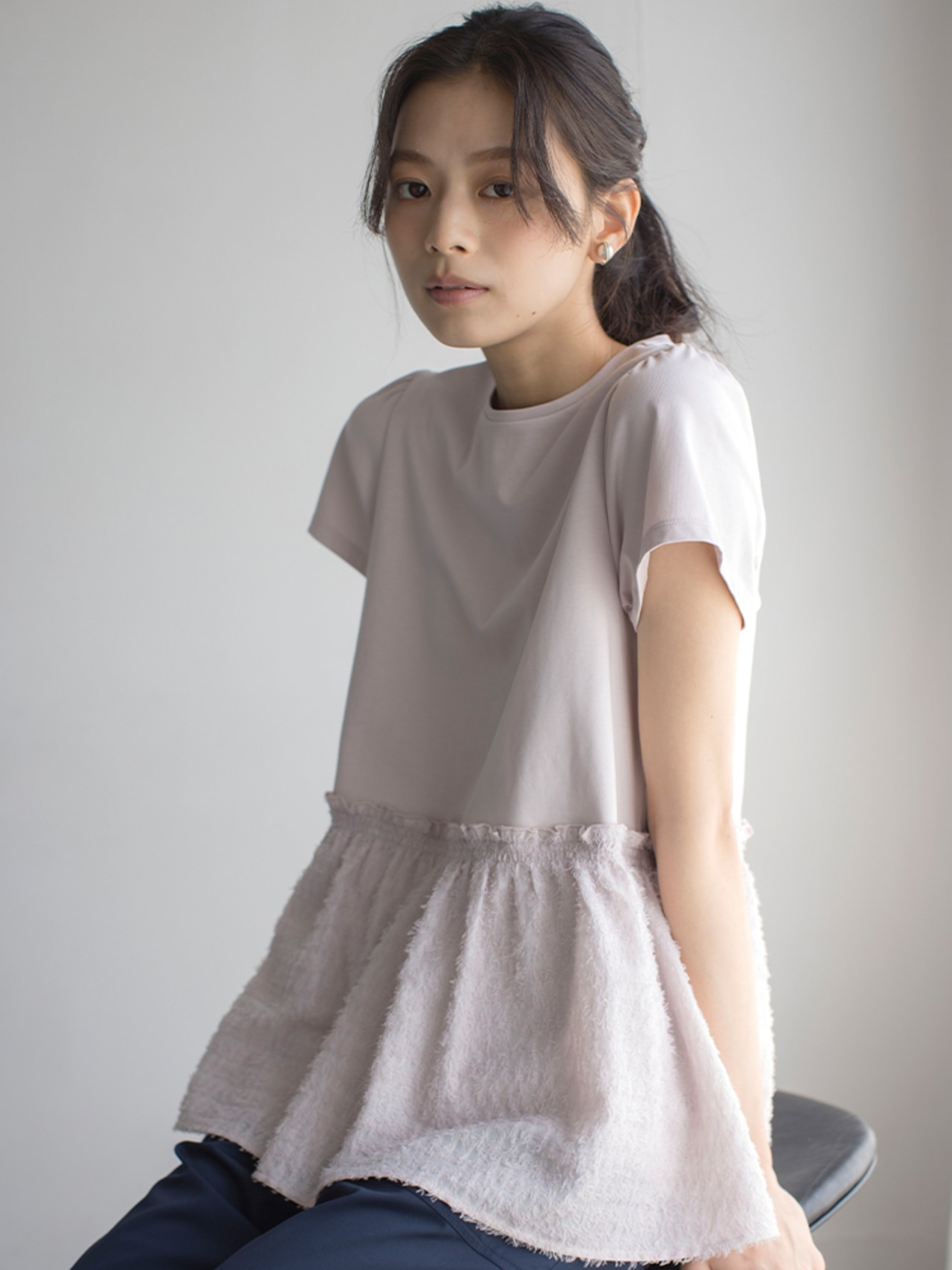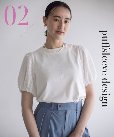 フェザー調のカットジャカード素材が絶好のアクセントになった華感トップス。