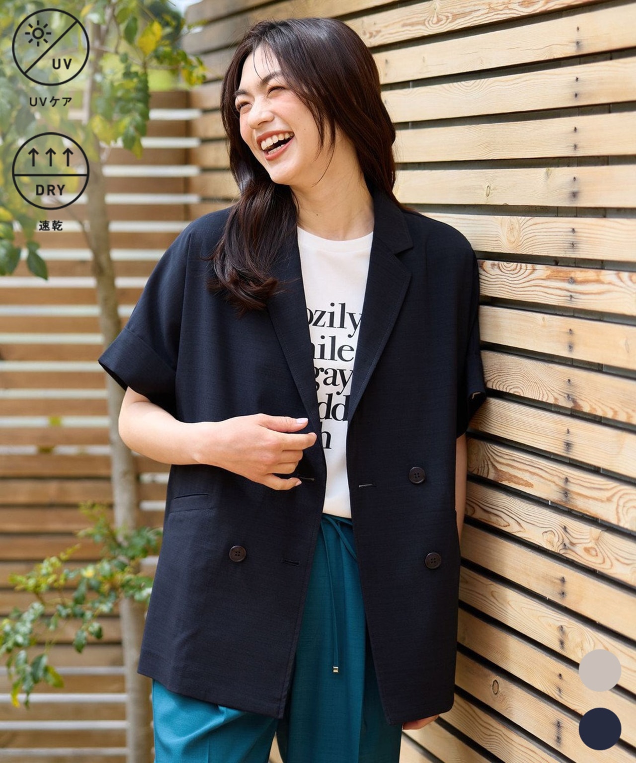 キレイ見えとリラックス感を両立する、今どきシルエットの半袖ジャケット。お手入れラク&UVケア機能付きで、夏の羽織として活躍間違いなしの1枚。【洗濯機可/セットアップ可/UVケア/速乾/イージーケア】サラサラテックリネン半袖テーラードジャケット【洗濯機可/セットアップ可/UVケア/速乾/イージーケア】サラサラテックリネン半袖テーラードジャケットany FAM¥6,999(税込)→¥5,599(税込) -