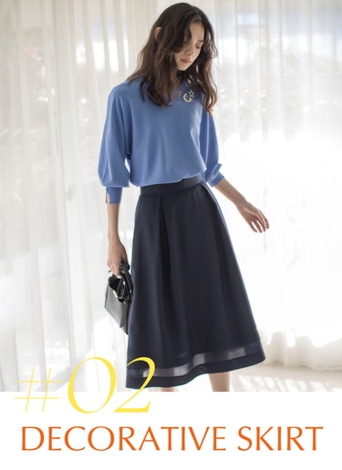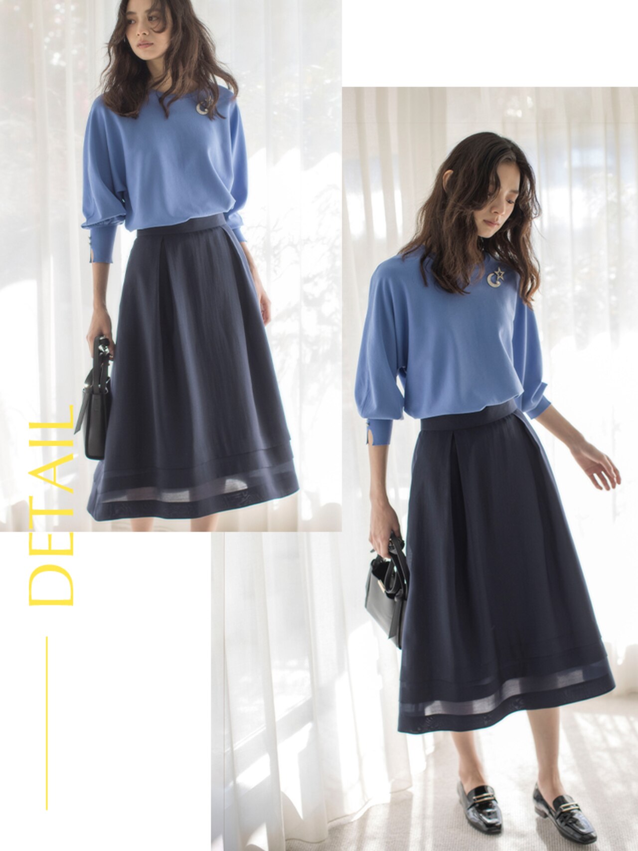 透明感のあるオーガンジーがドラマティックなスカートです。裾に入れたタックがボーダーのように透けて、デザインのアクセントに!