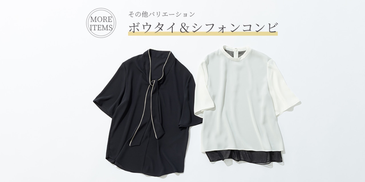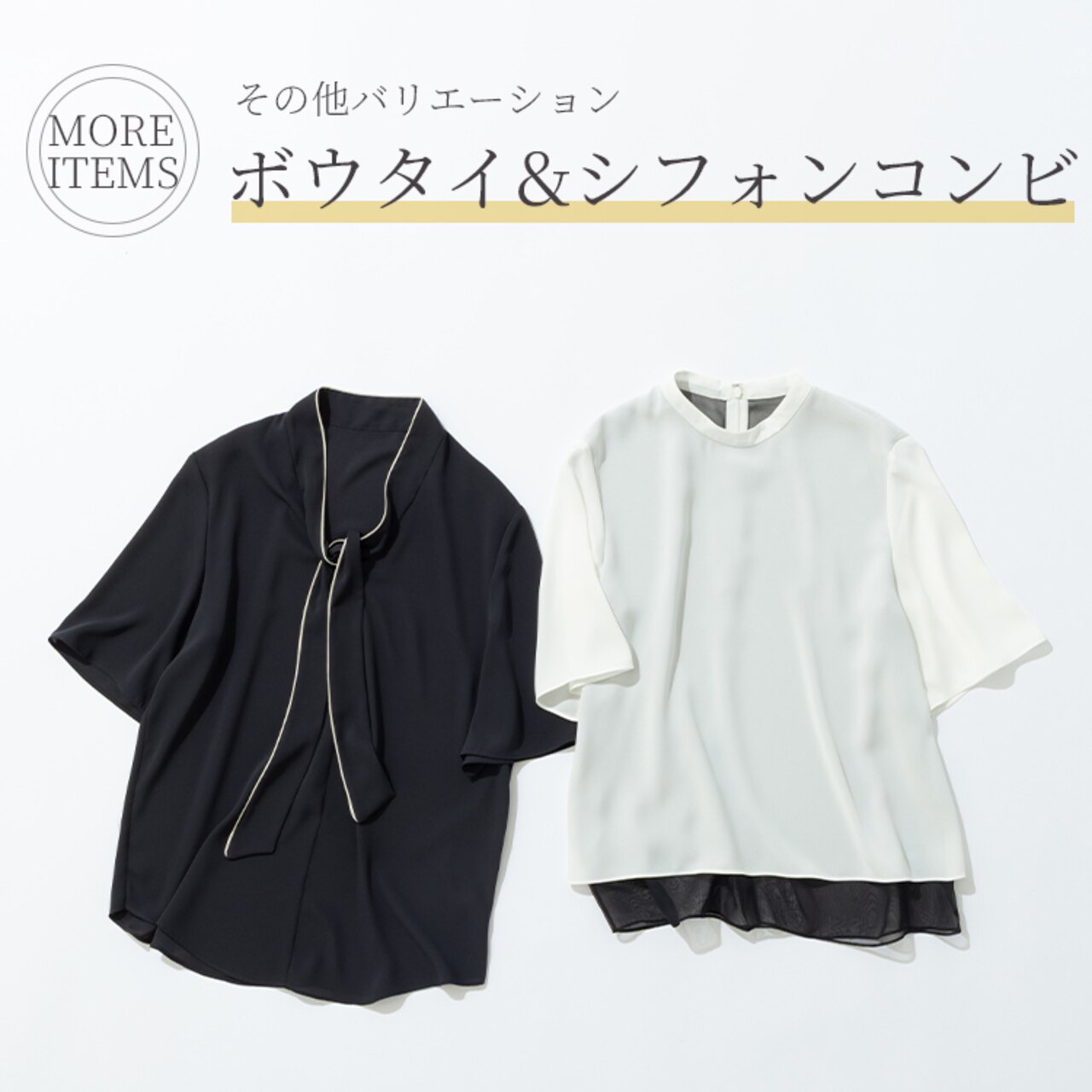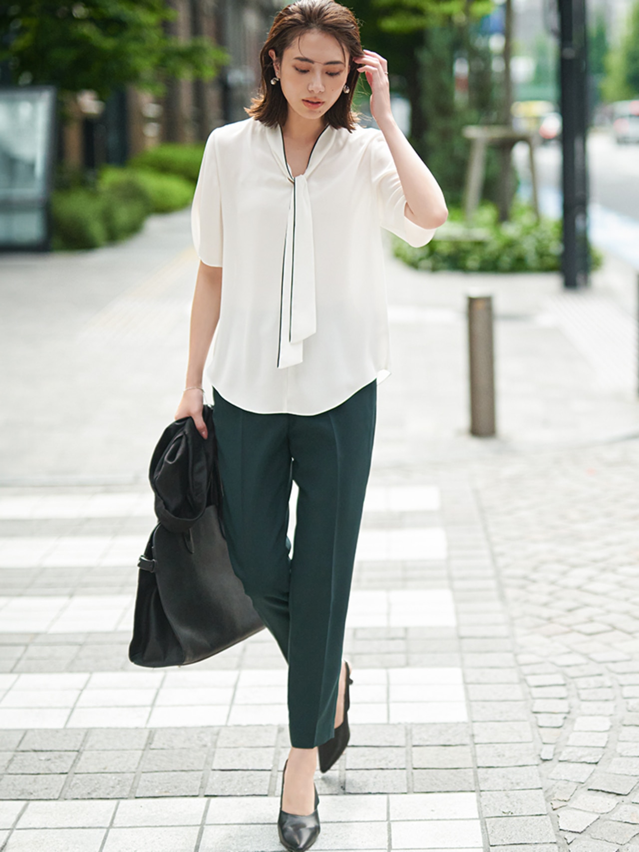 バイカラーの配色デザインを効かせた、甘くなり過ぎない大人のボウタイブラウス。通勤コーデには欠かせない1枚。