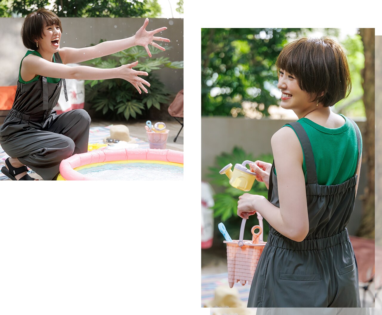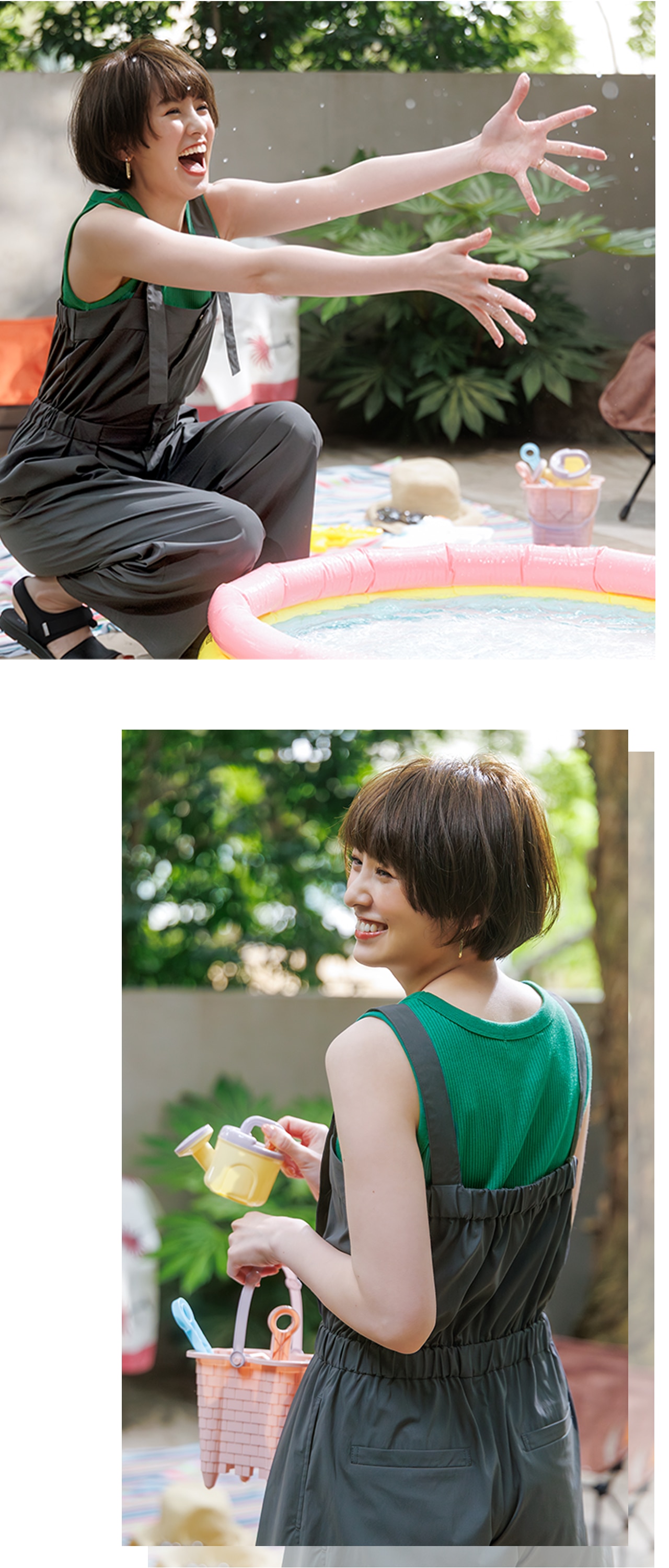 水あそびやちょっとしたアウトドアシーンでも思いっきり楽しめる、撥水加工のサロペット。ゴム仕様になったバスト・ウエスト部分と、程よいハリ感のあるナイロン素材で動きやすく着心地も◎。