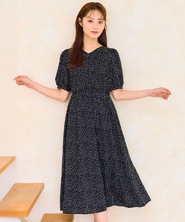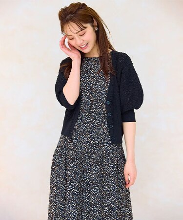 シックな黒地に映える小花プリントが、夏の着こなしにさりげない華やぎを添えた1枚。パフスリーブのふんわり感とウエストのリボンディテールで、フェミニンさもきちんと演出。