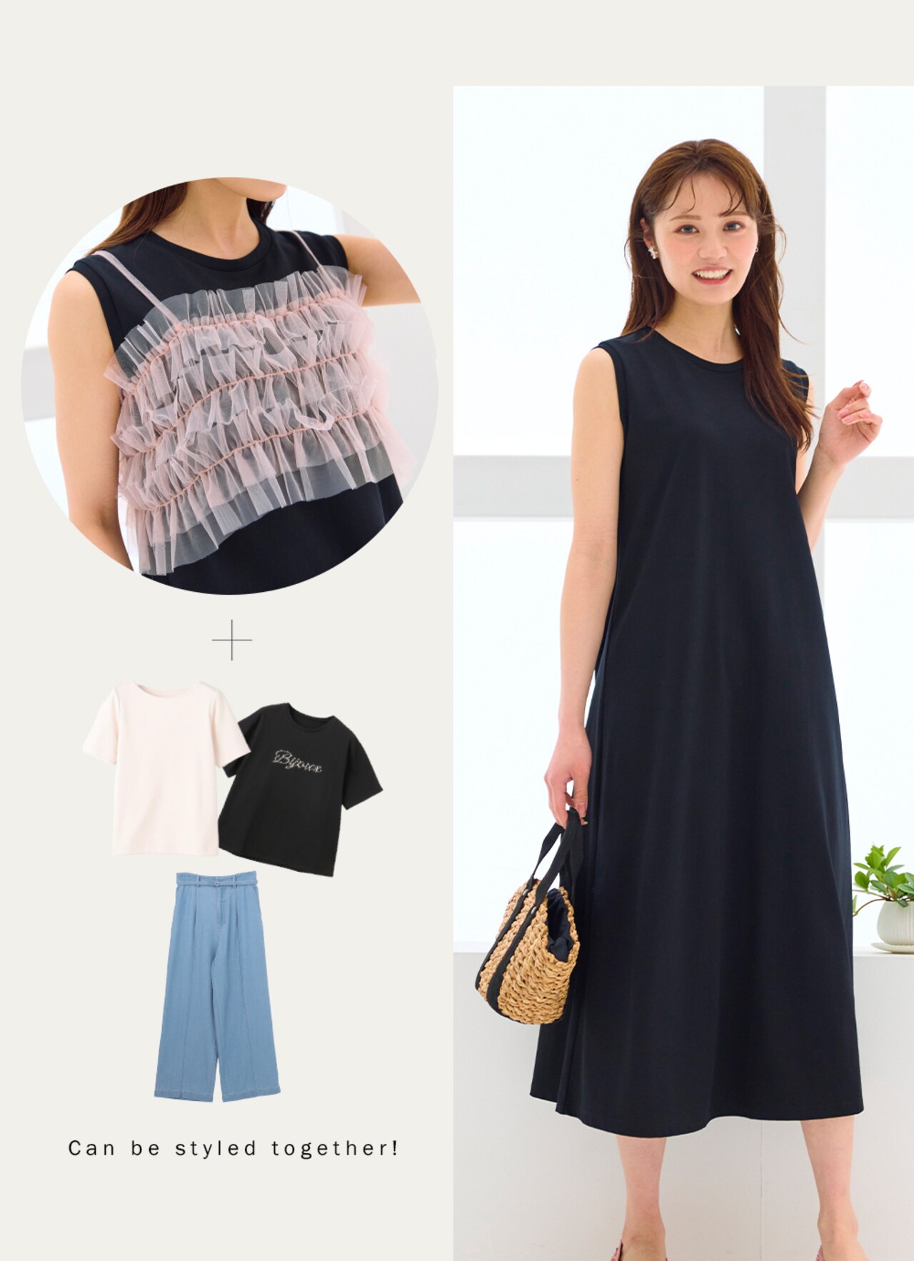 ワンピースは1枚でもサマになる生地感で、