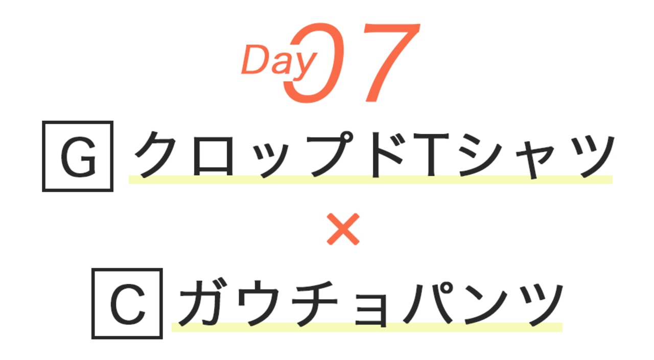 上半身がコンパクトに見えるクロップド丈Tシャツは、スカートライクなガウチョパンツと好バランス。潔いモノトーン配色が品よくシャープな印象を演出。