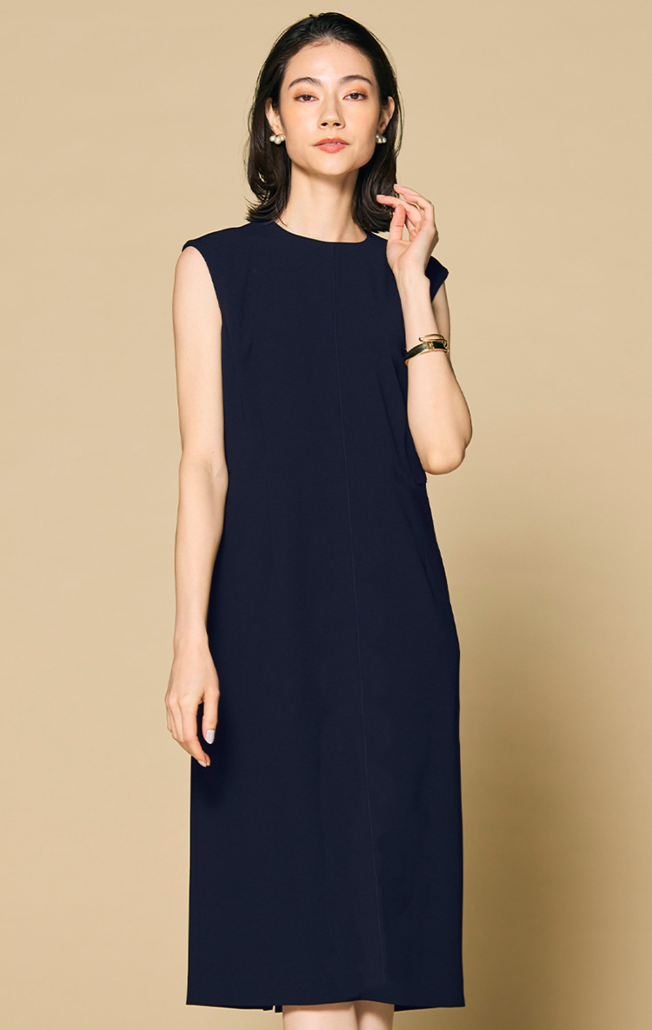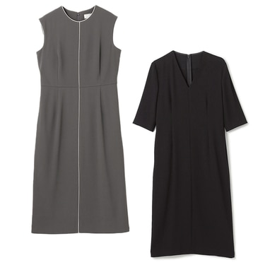 クルーとVネックの2モデルが、デコルテを上品に、計算された膝下丈が華やかさを演出。
