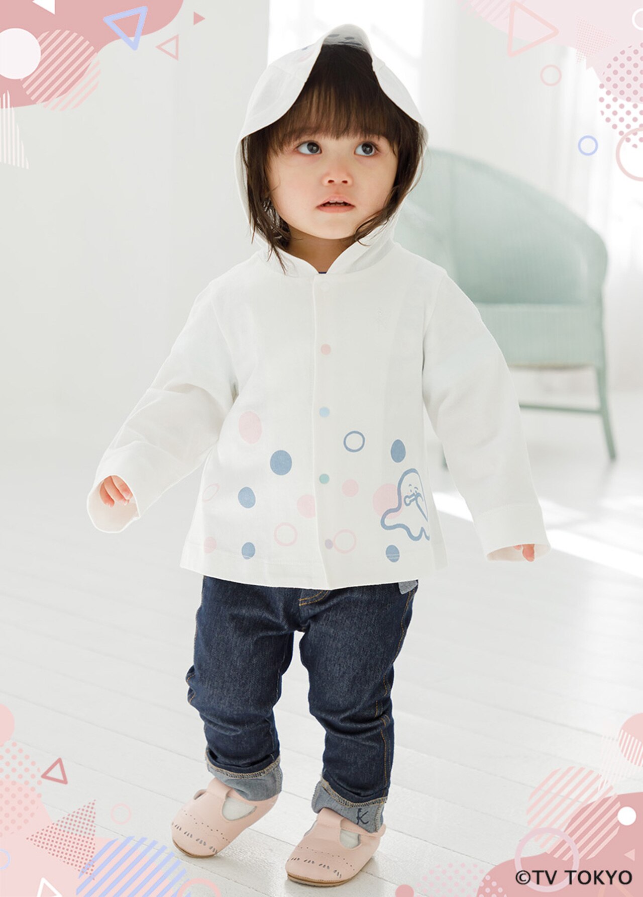 シャボン玉で遊んでいるぷしゅぷしゅを裾に施したパーカー。