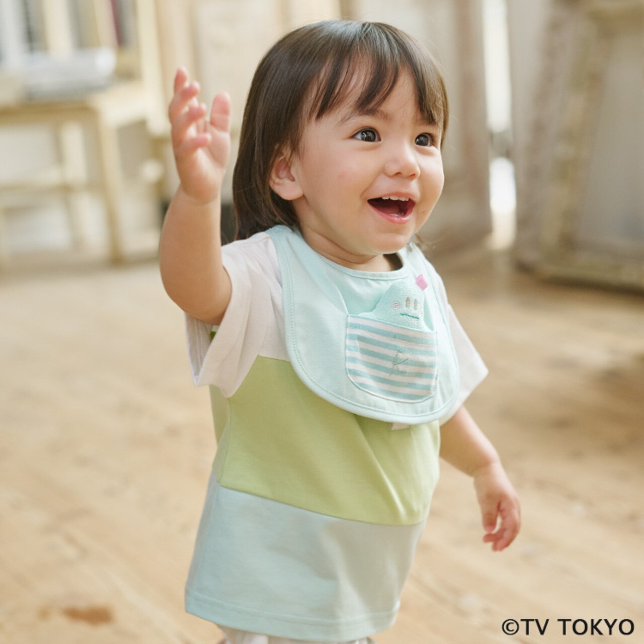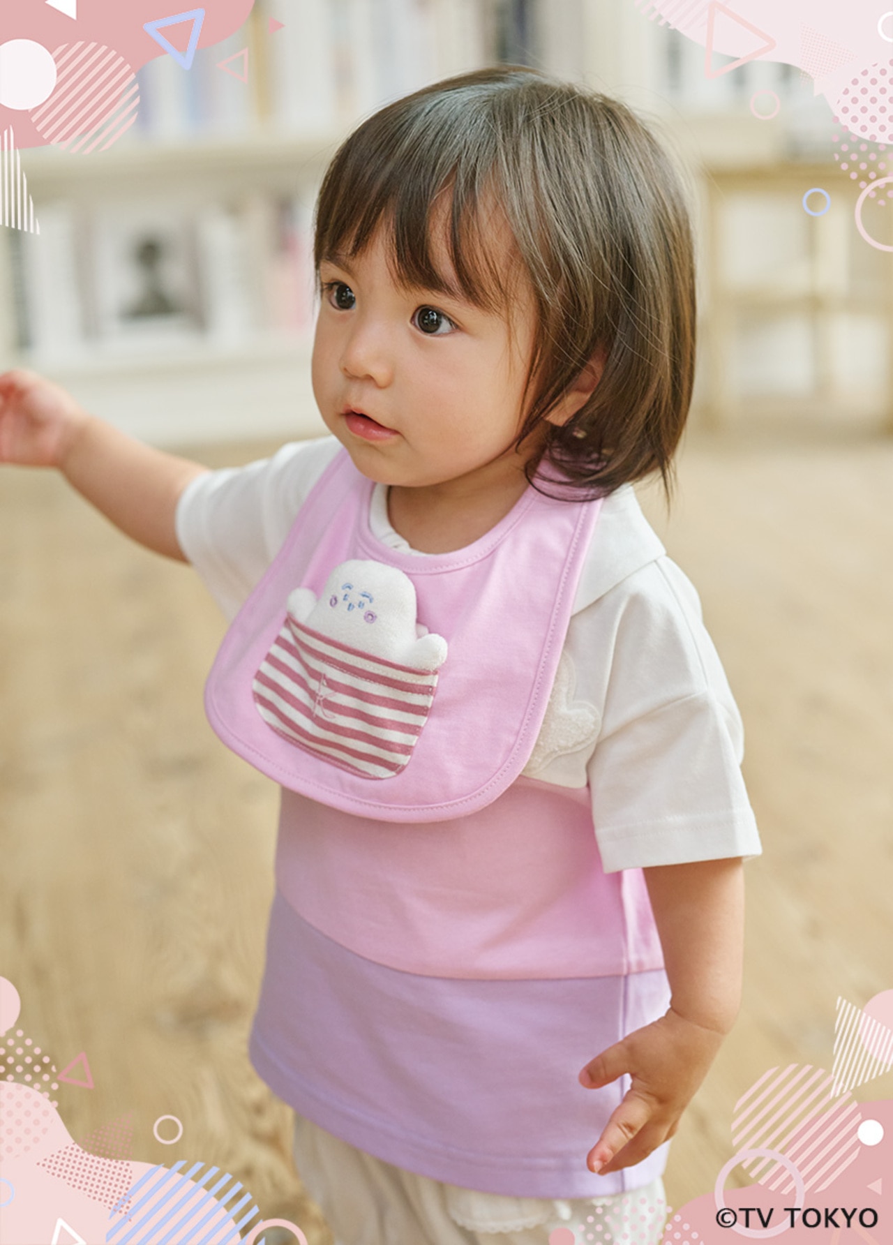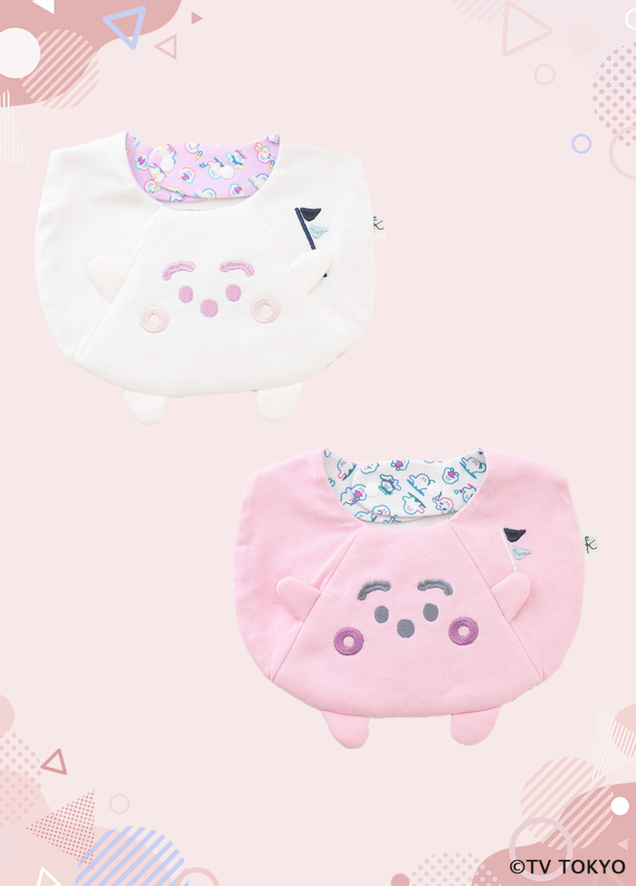 ぷしゅぷしゅとにゅうの小さなお人形がポケットに入っている、とても可愛らしいスタイ♪お人形のお腹を押すと音が出るので、外出先で赤ちゃんがぐずった際も音を鳴らしてあやしていただけます。