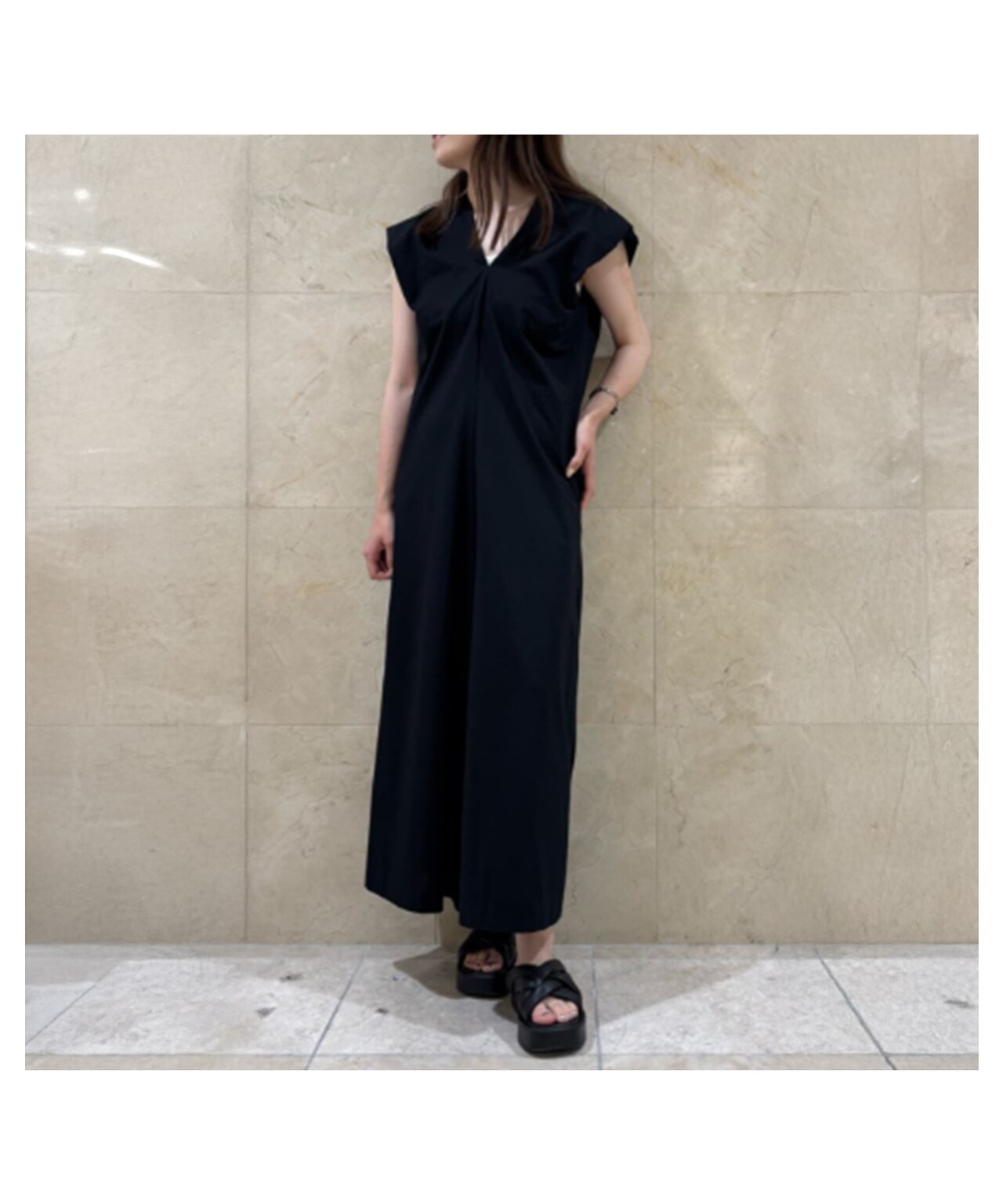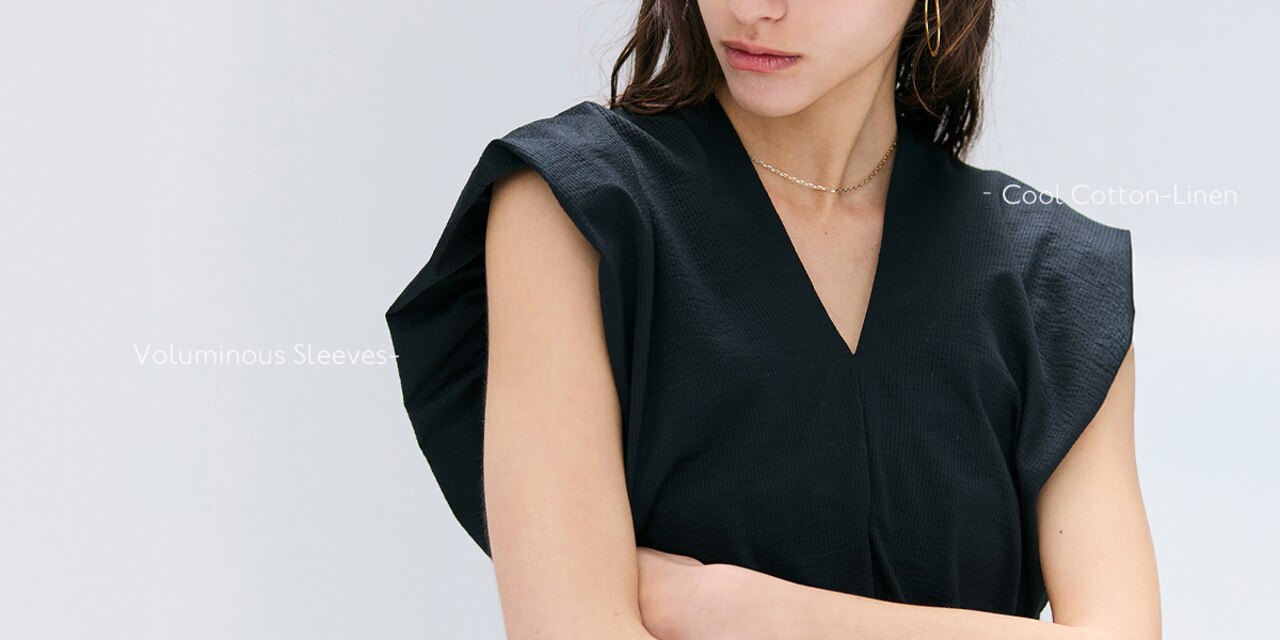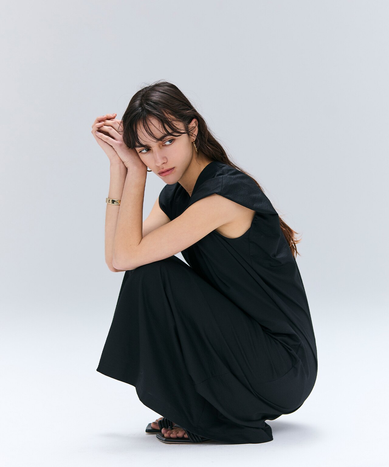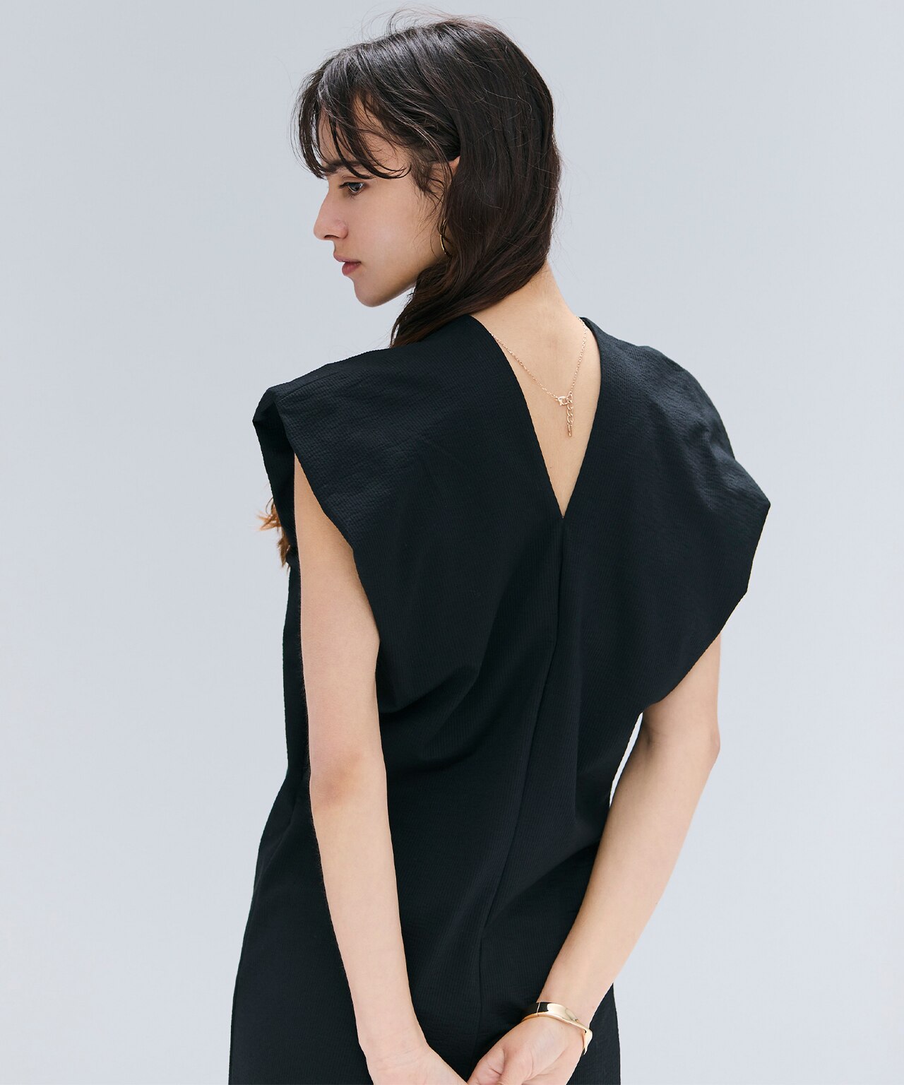 視線を集めるドラマティックなシルエット。計算されたドレープと美しいVネックが、お出かけや特別な日に、ふさわしい華やかさを演出。